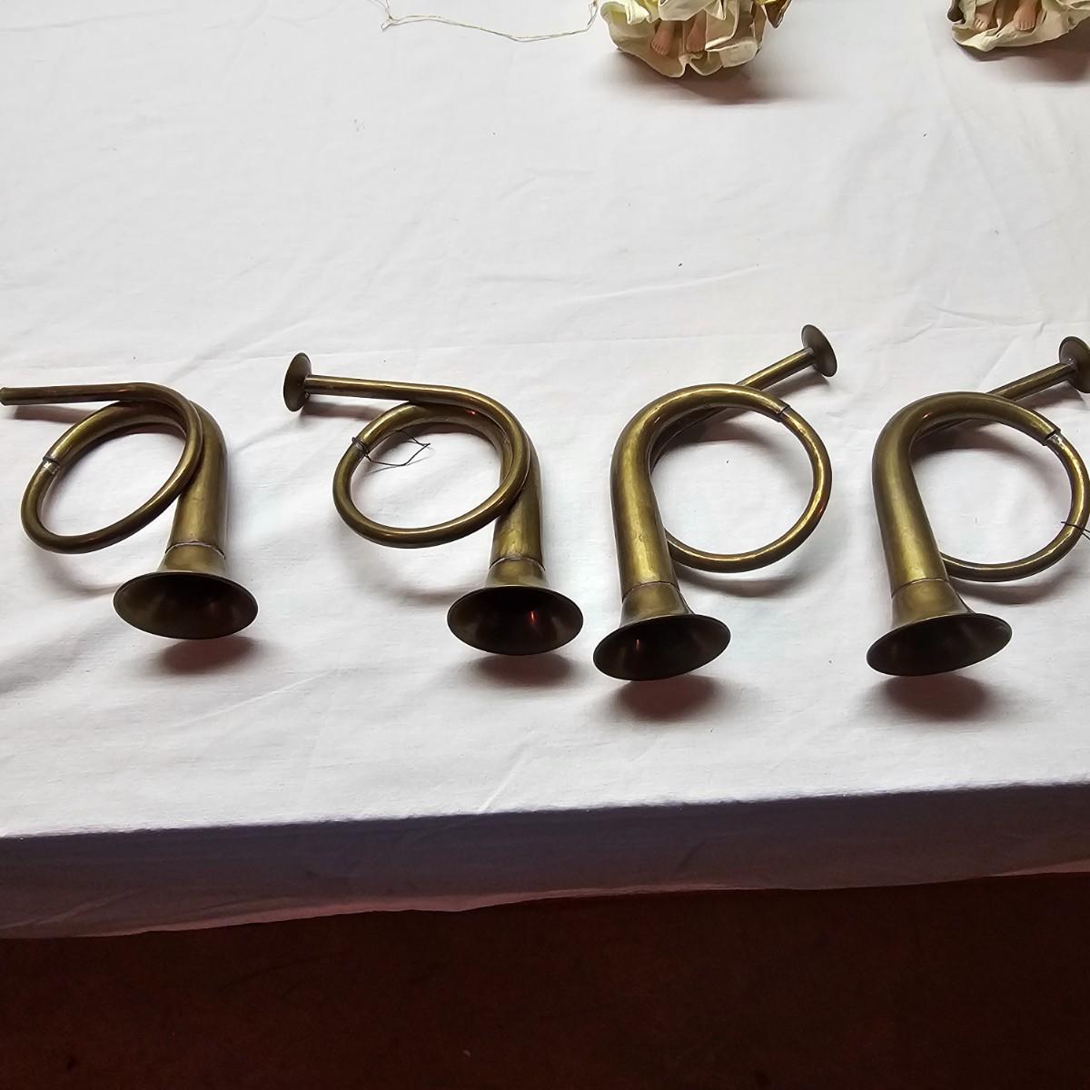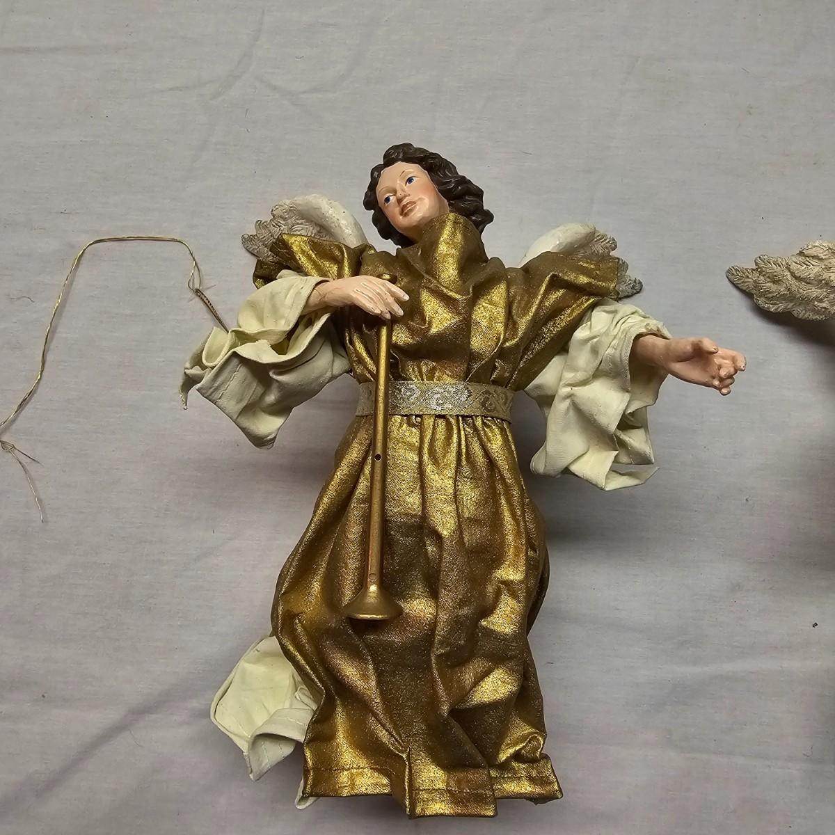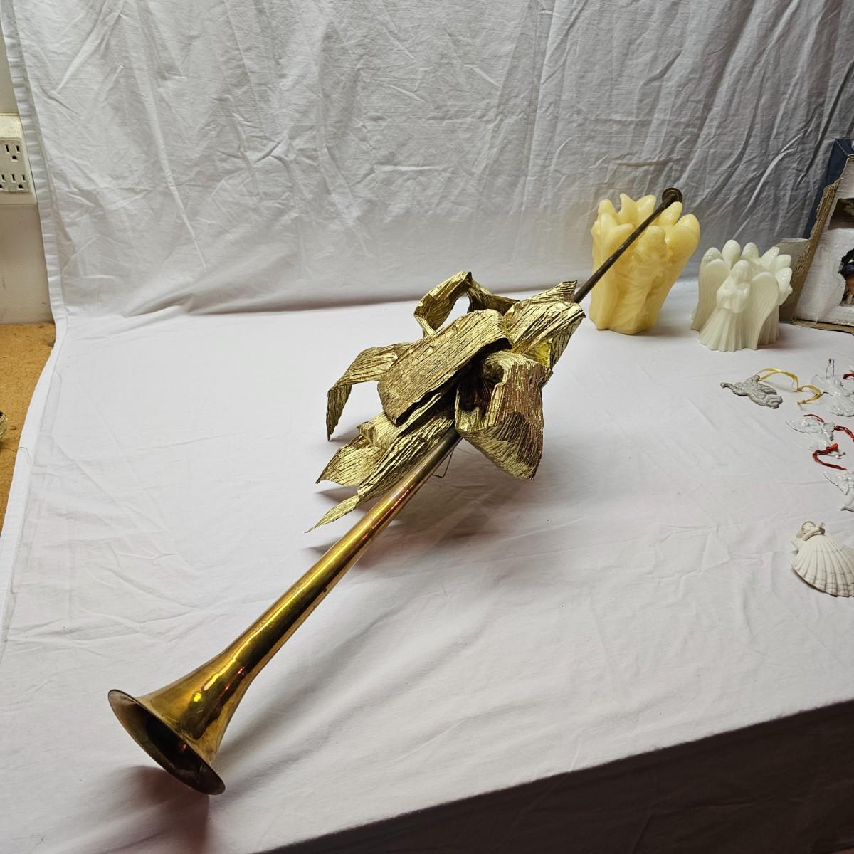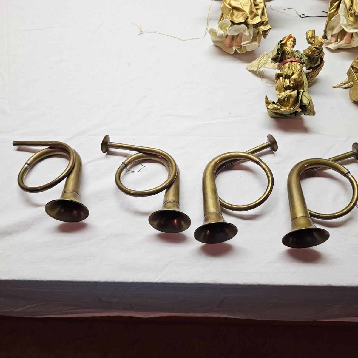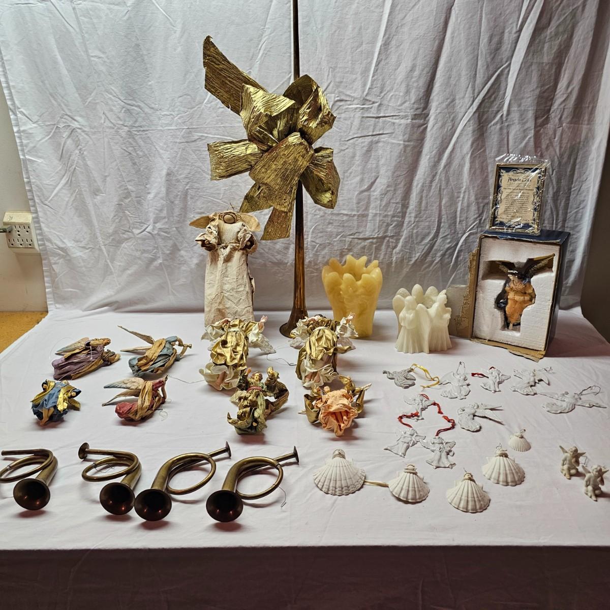 Resin, ceramic, paper mâché and more. Flowing robes and soft expressions. Four small brass horns and one large horn has a large gold bow and is 44" long. Largest angel is 14"H. Some angels have had wing repairs done. See photos for details. Local pickup only.