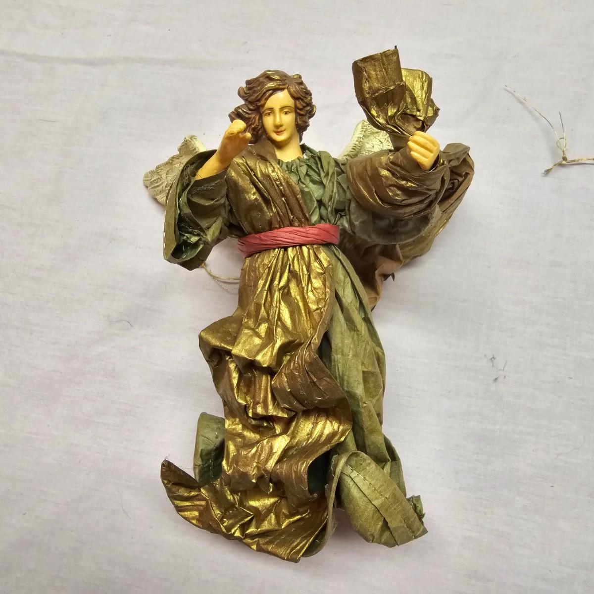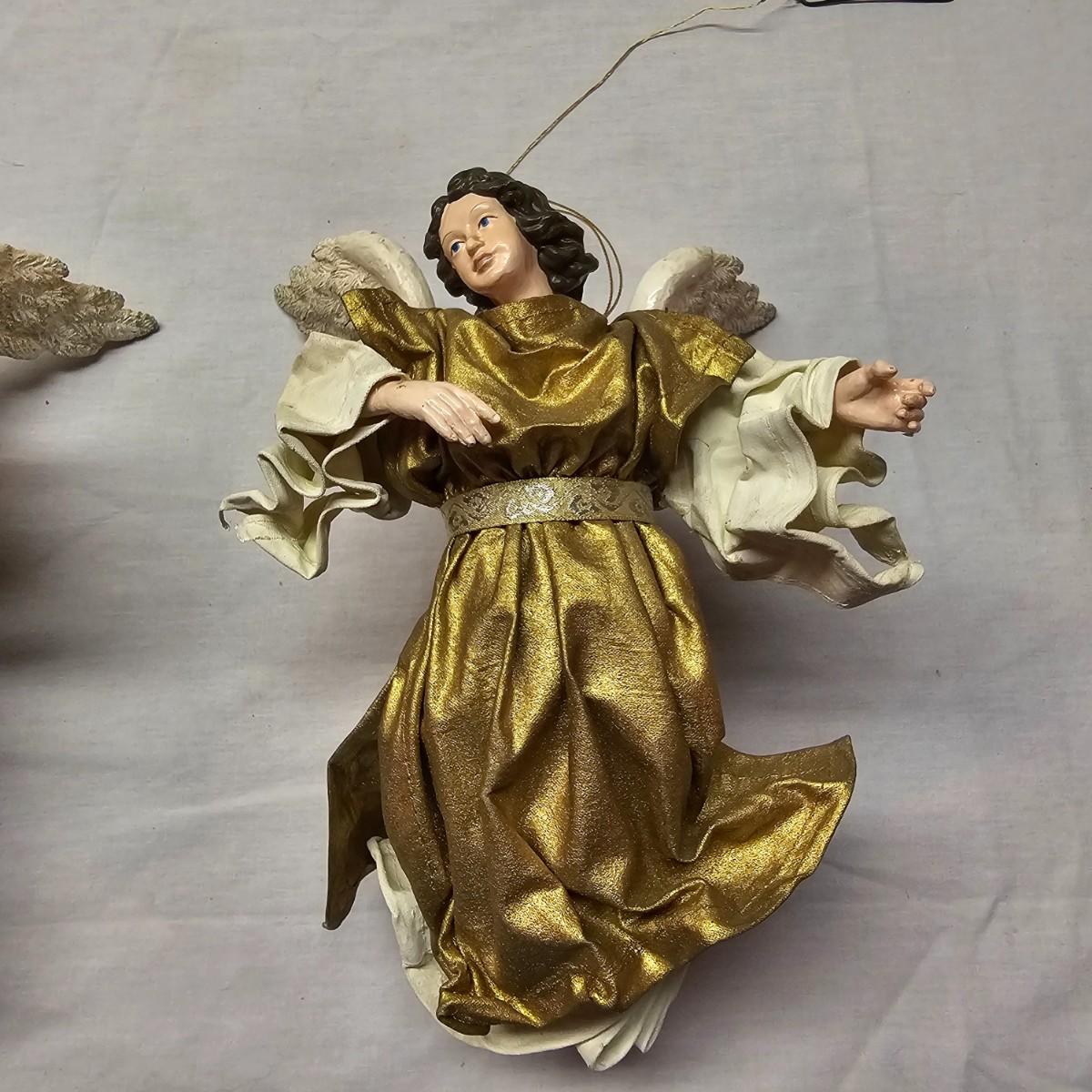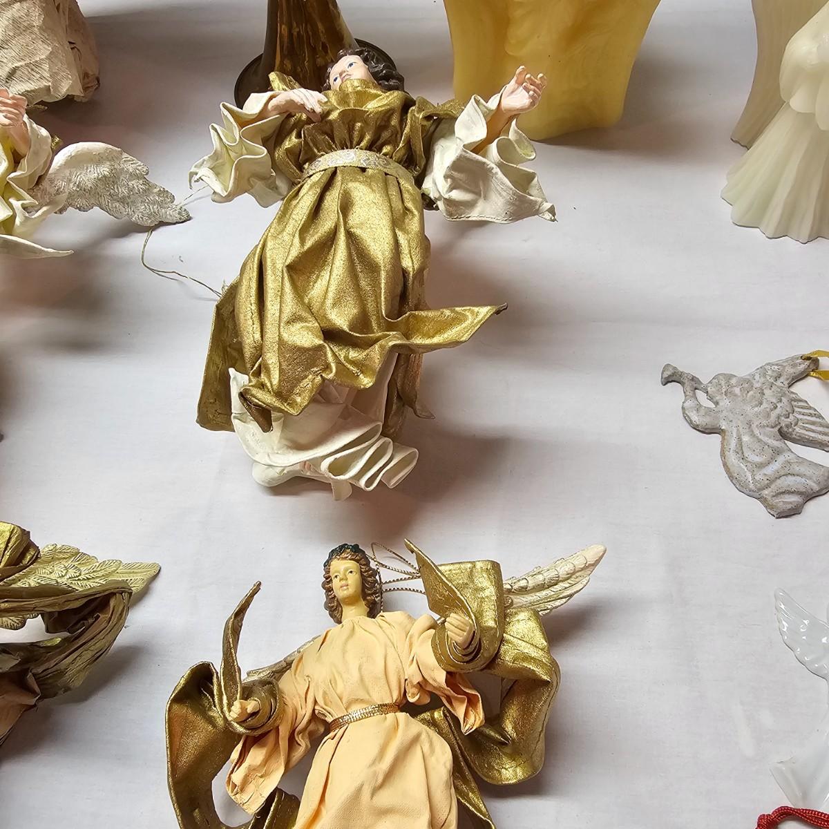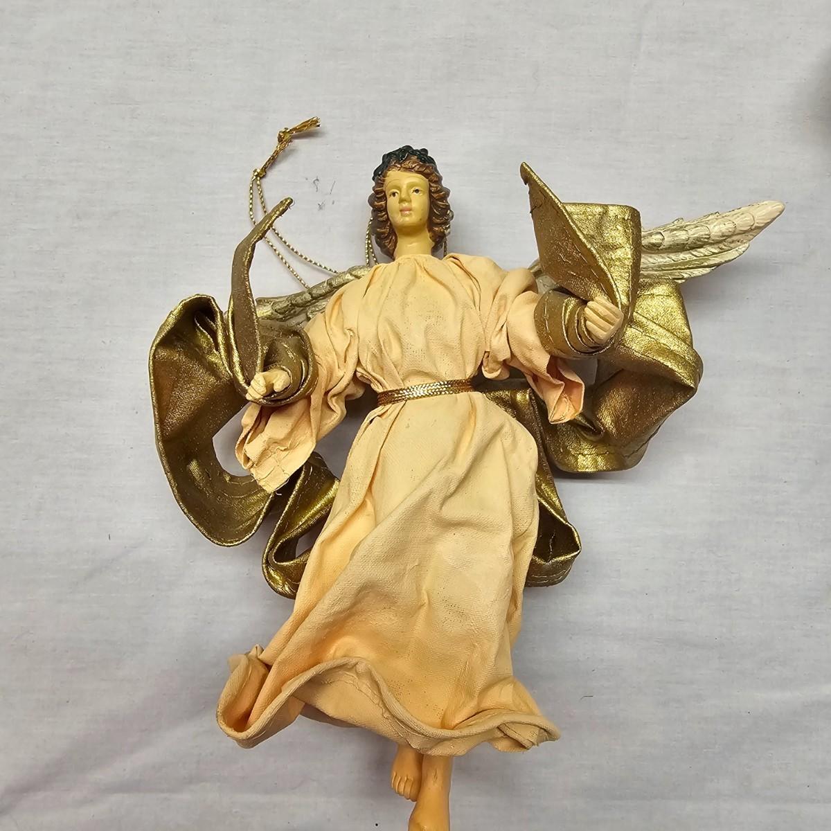Resin, ceramic, paper mâché and more. Flowing robes and soft expressions. Four small brass horns and one large horn has a large gold bow and is 44" long. Largest angel is 14"H. Some angels have had wing repairs done. See photos for details. Local pickup only.