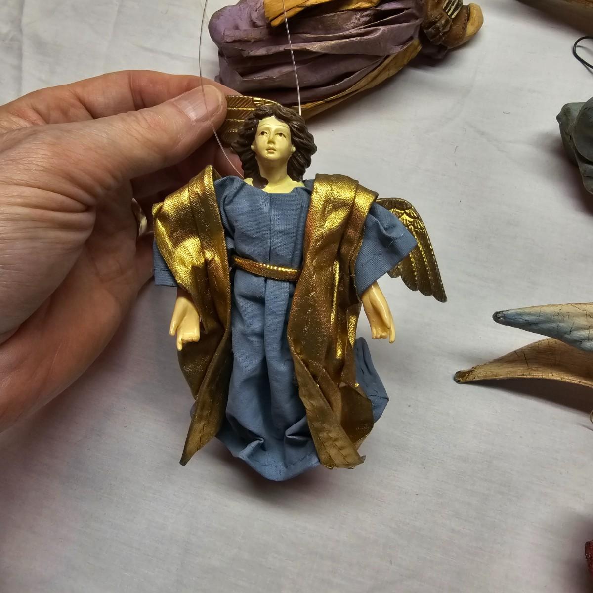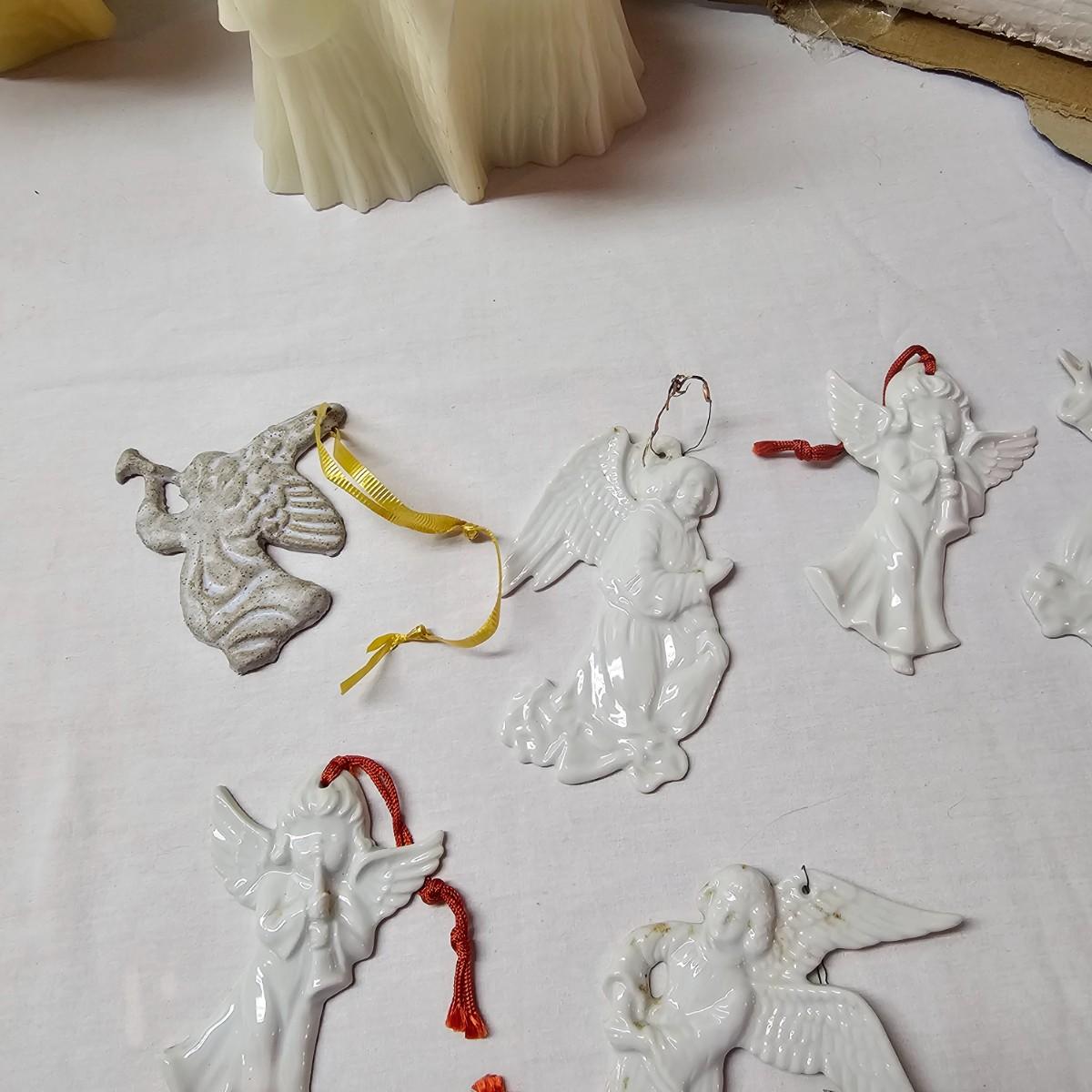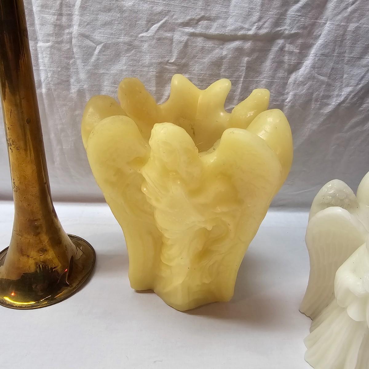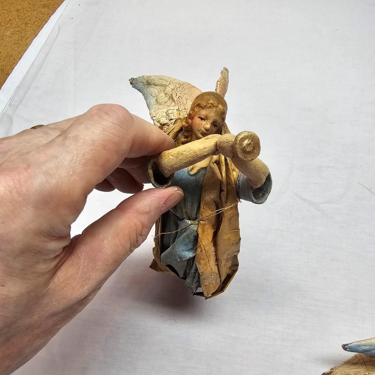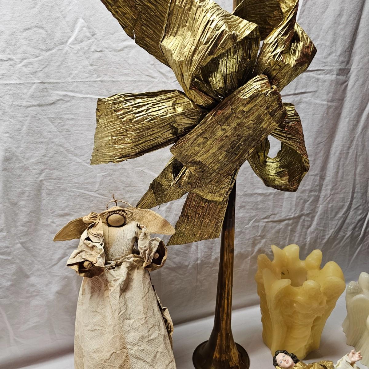 Resin, ceramic, paper mâché and more. Flowing robes and soft expressions. Four small brass horns and one large horn has a large gold bow and is 44" long. Largest angel is 14"H. Some angels have had wing repairs done. See photos for details. Local pickup only.