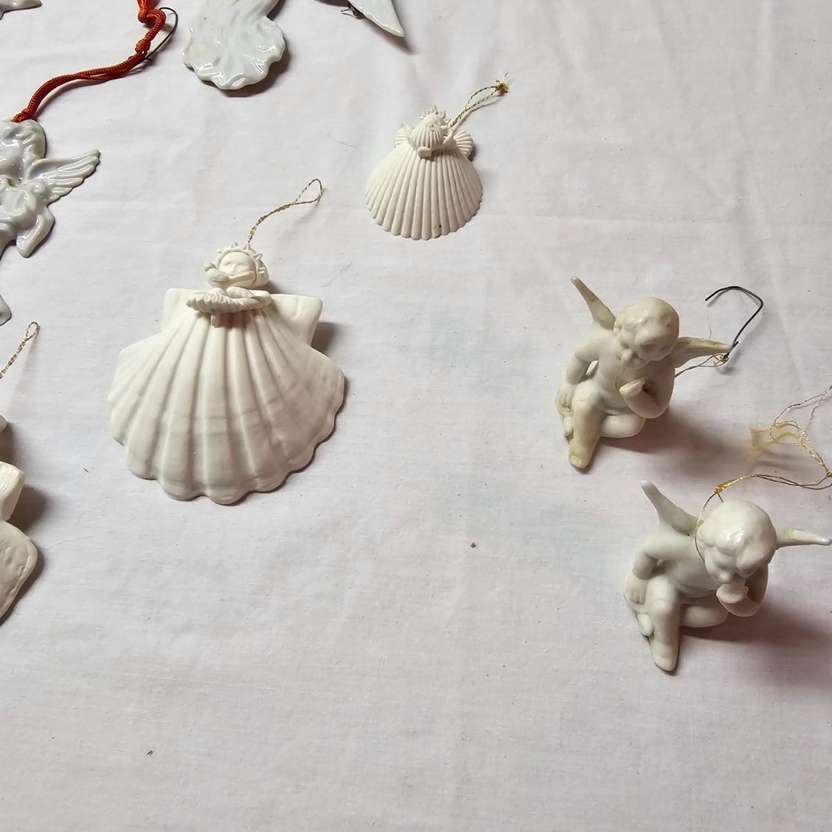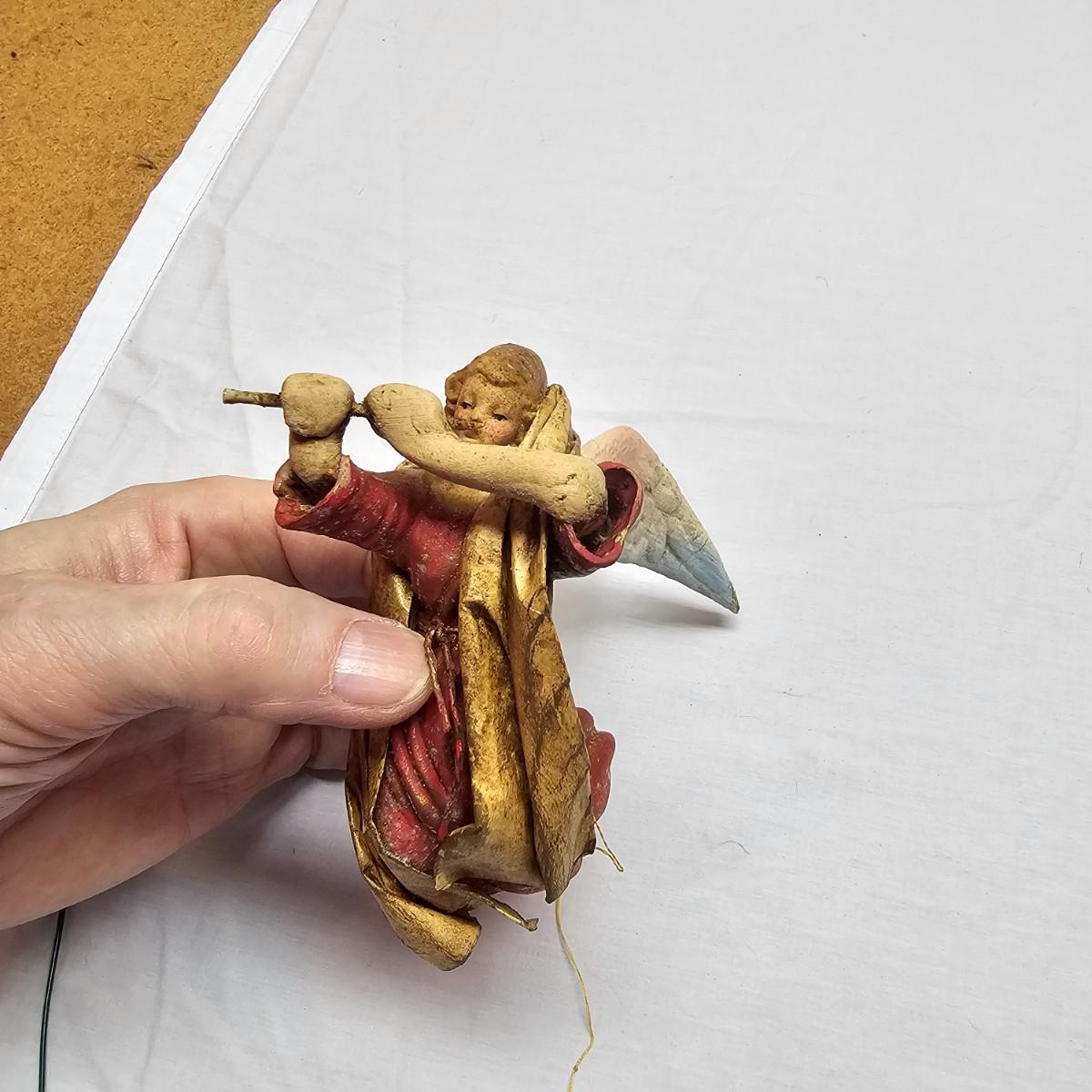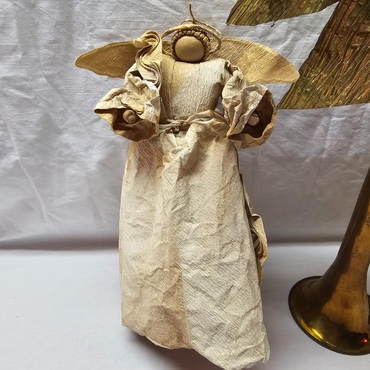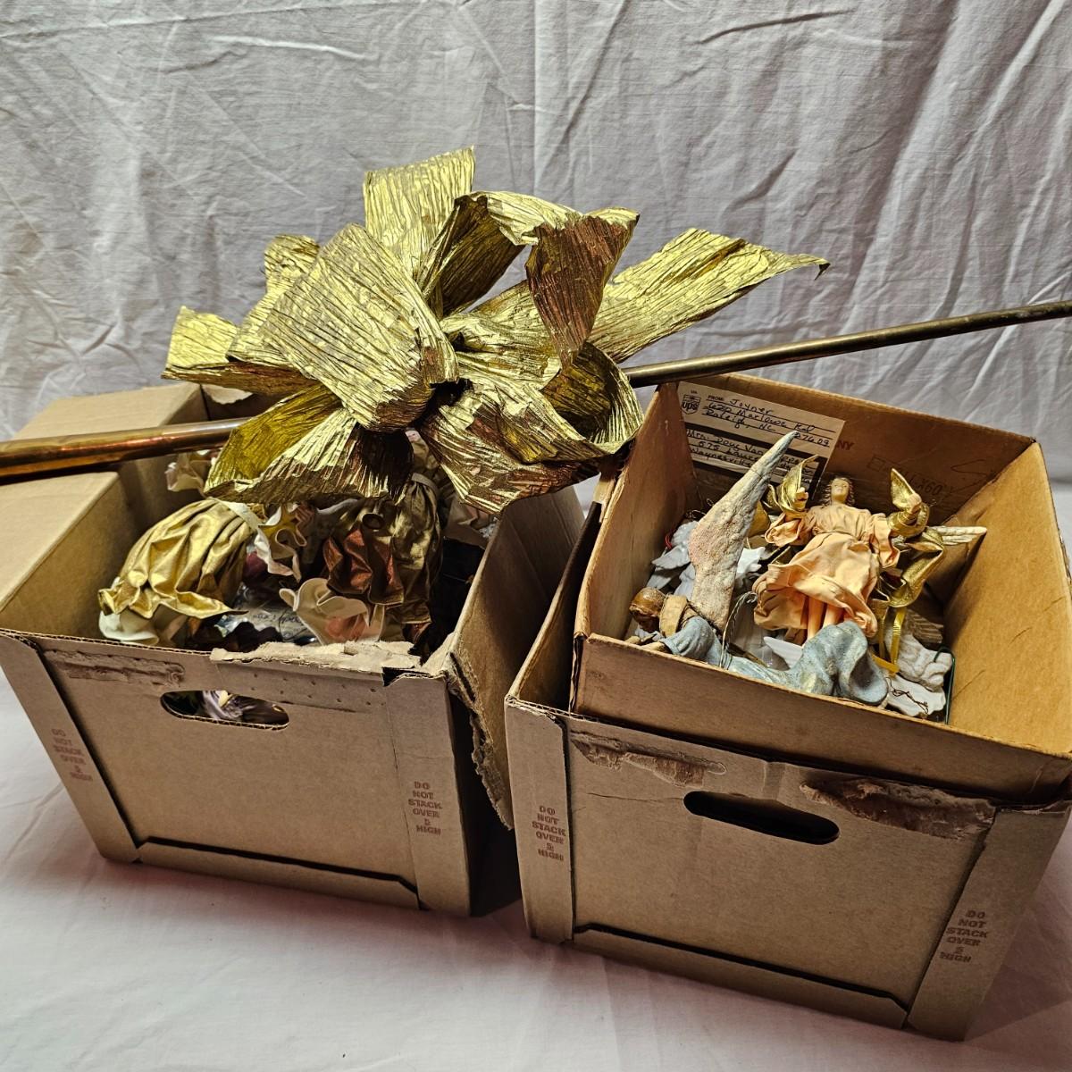 Resin, ceramic, paper mâché and more. Flowing robes and soft expressions. Four small brass horns and one large horn has a large gold bow and is 44" long. Largest angel is 14"H. Some angels have had wing repairs done. See photos for details. Local pickup only.