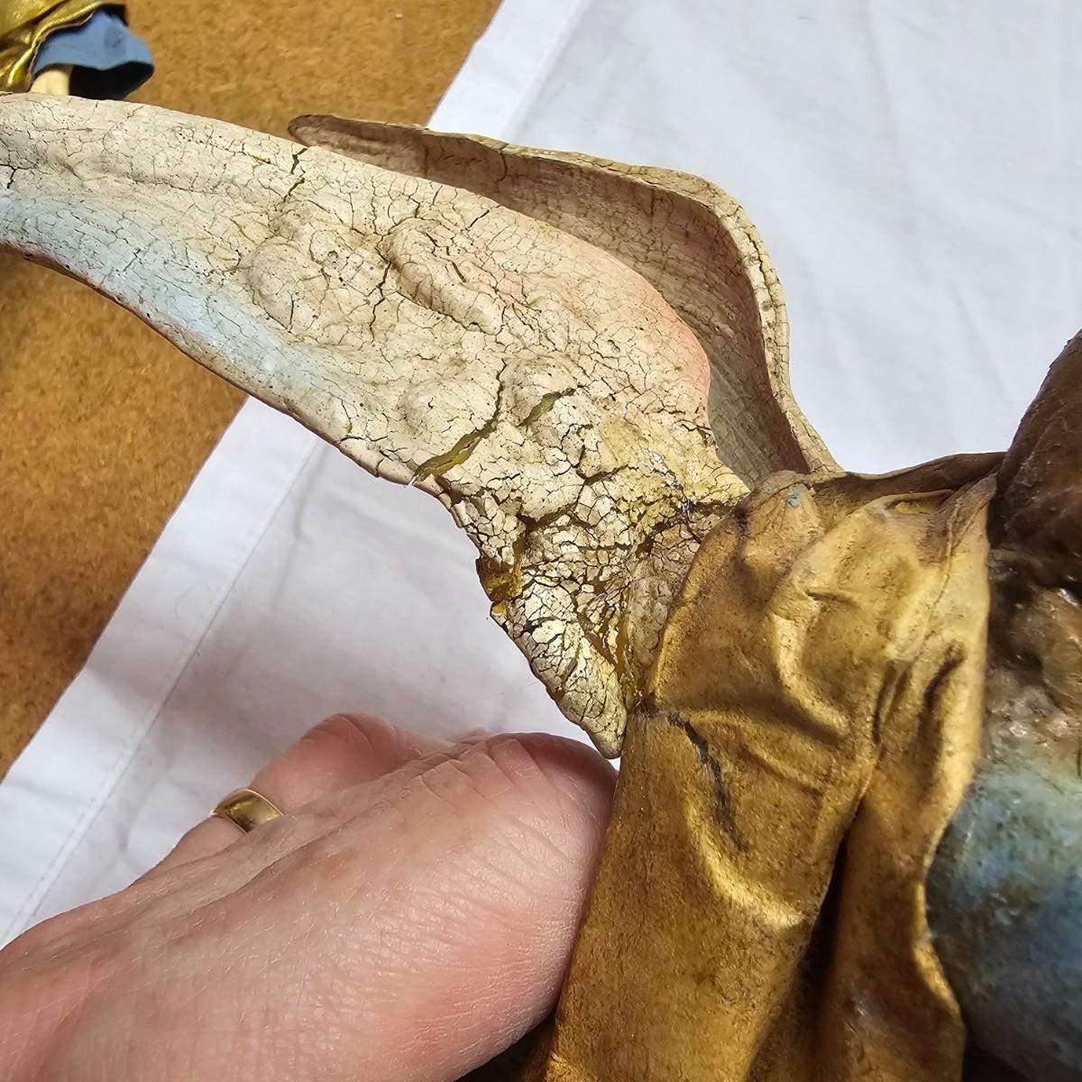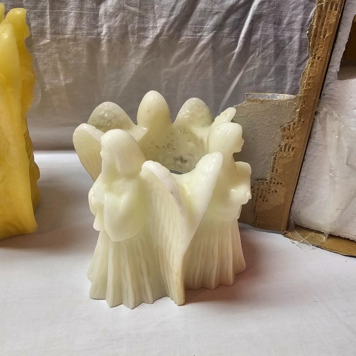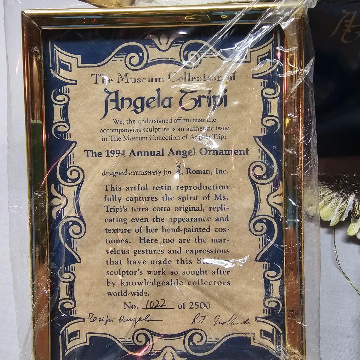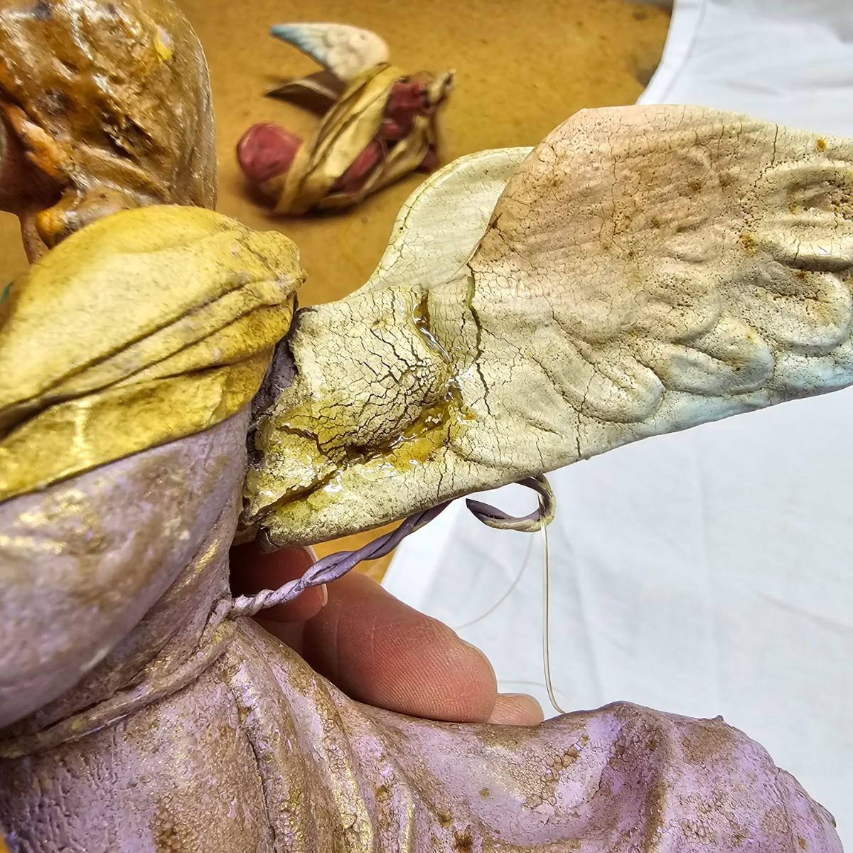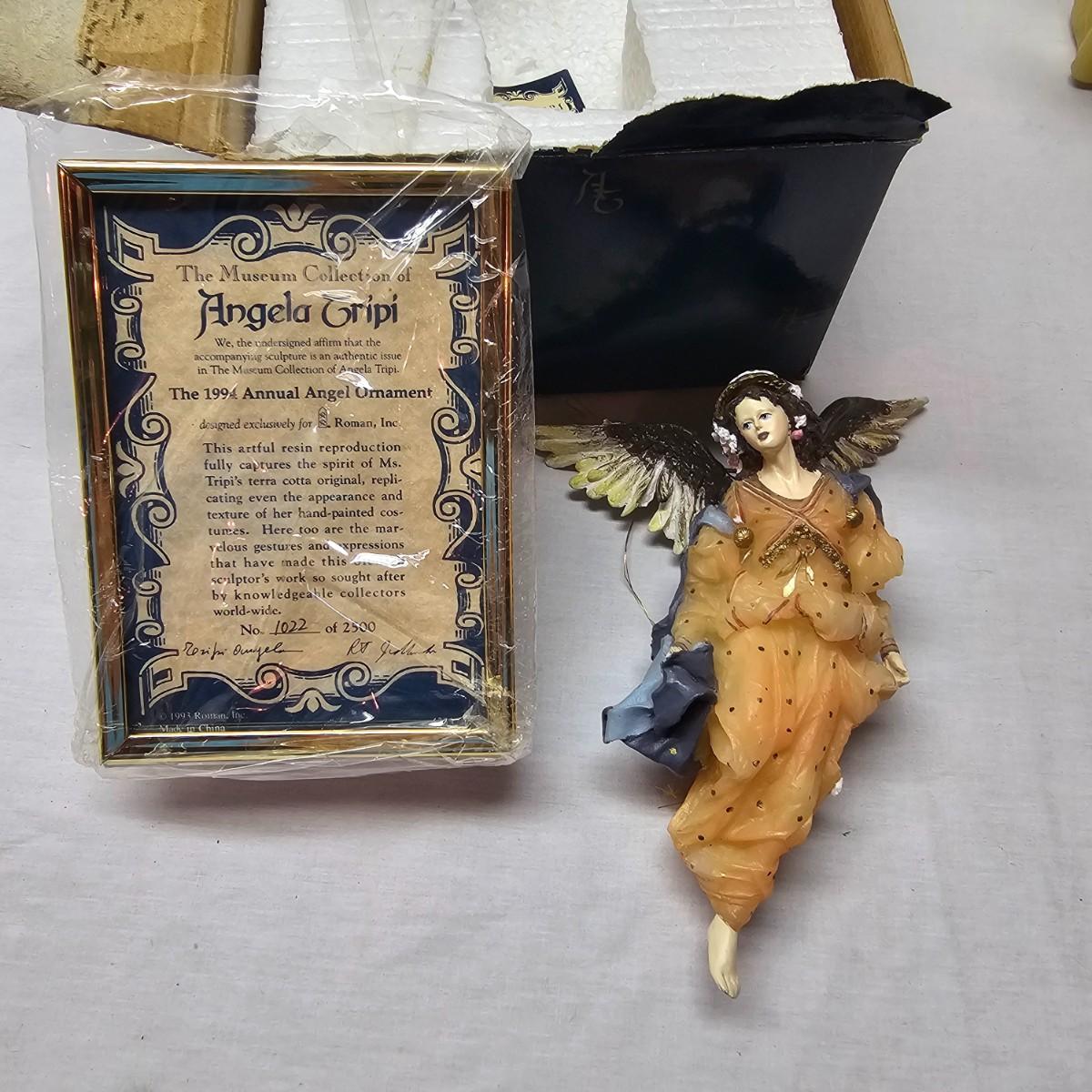 Resin, ceramic, paper mâché and more. Flowing robes and soft expressions. Four small brass horns and one large horn has a large gold bow and is 44" long. Largest angel is 14"H. Some angels have had wing repairs done. See photos for details. Local pickup only.