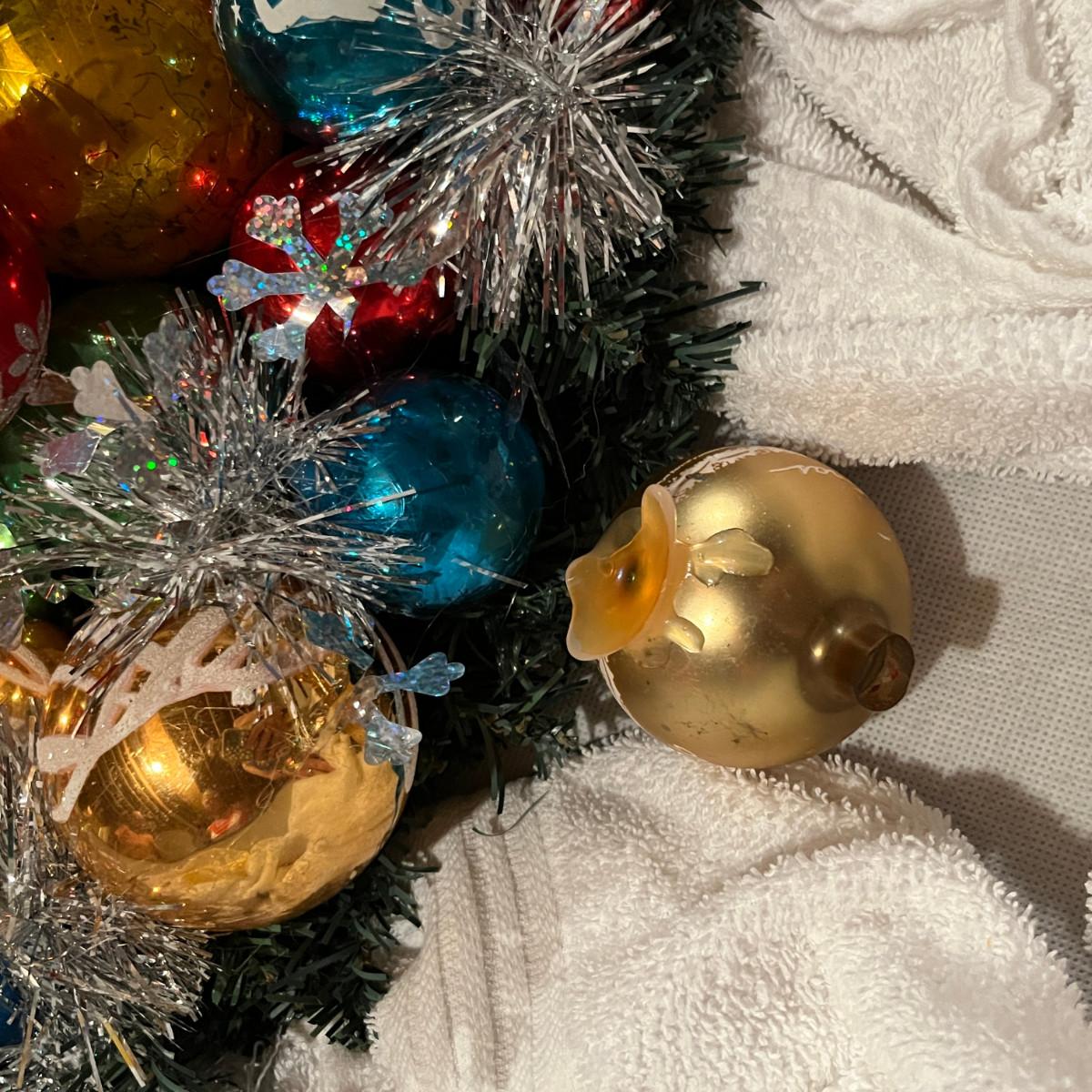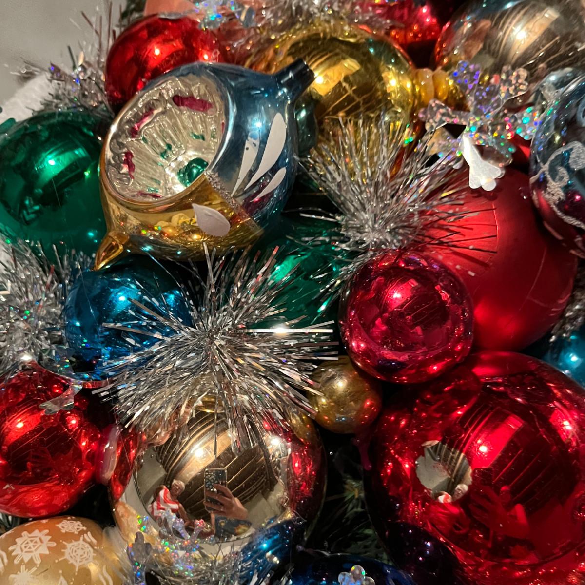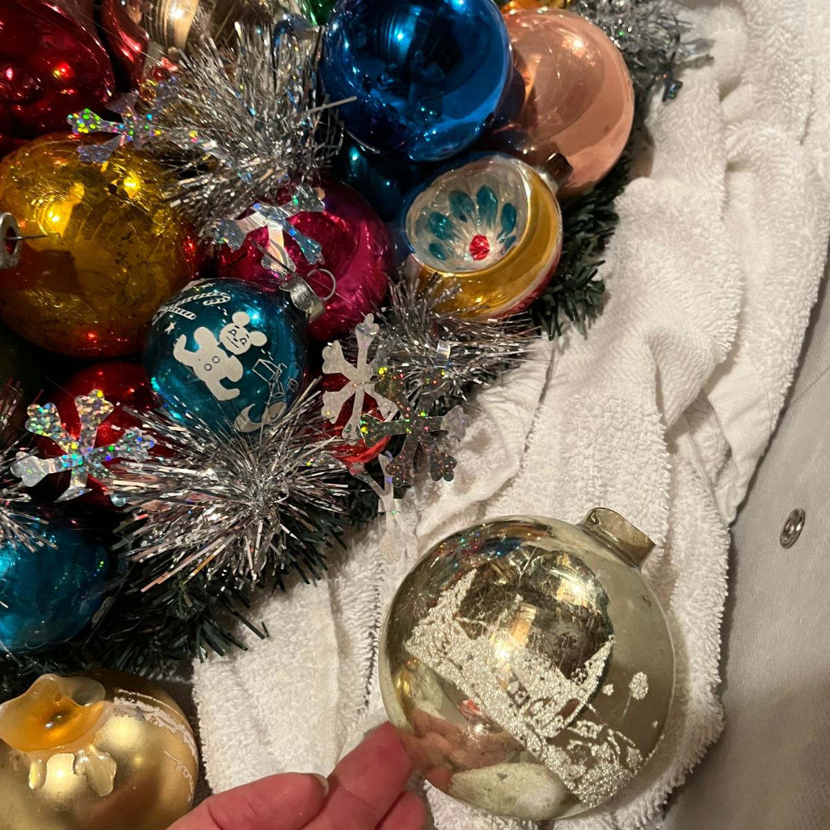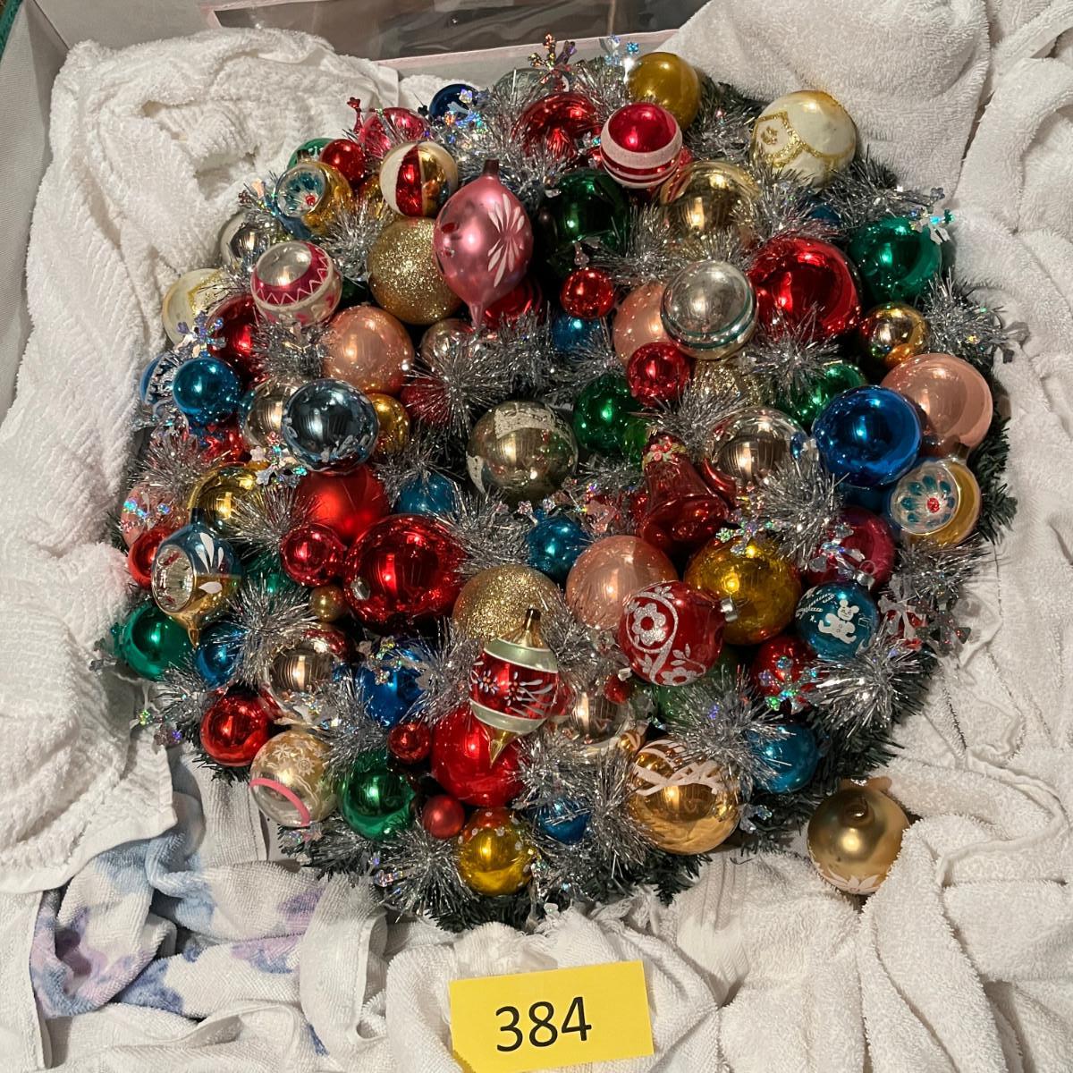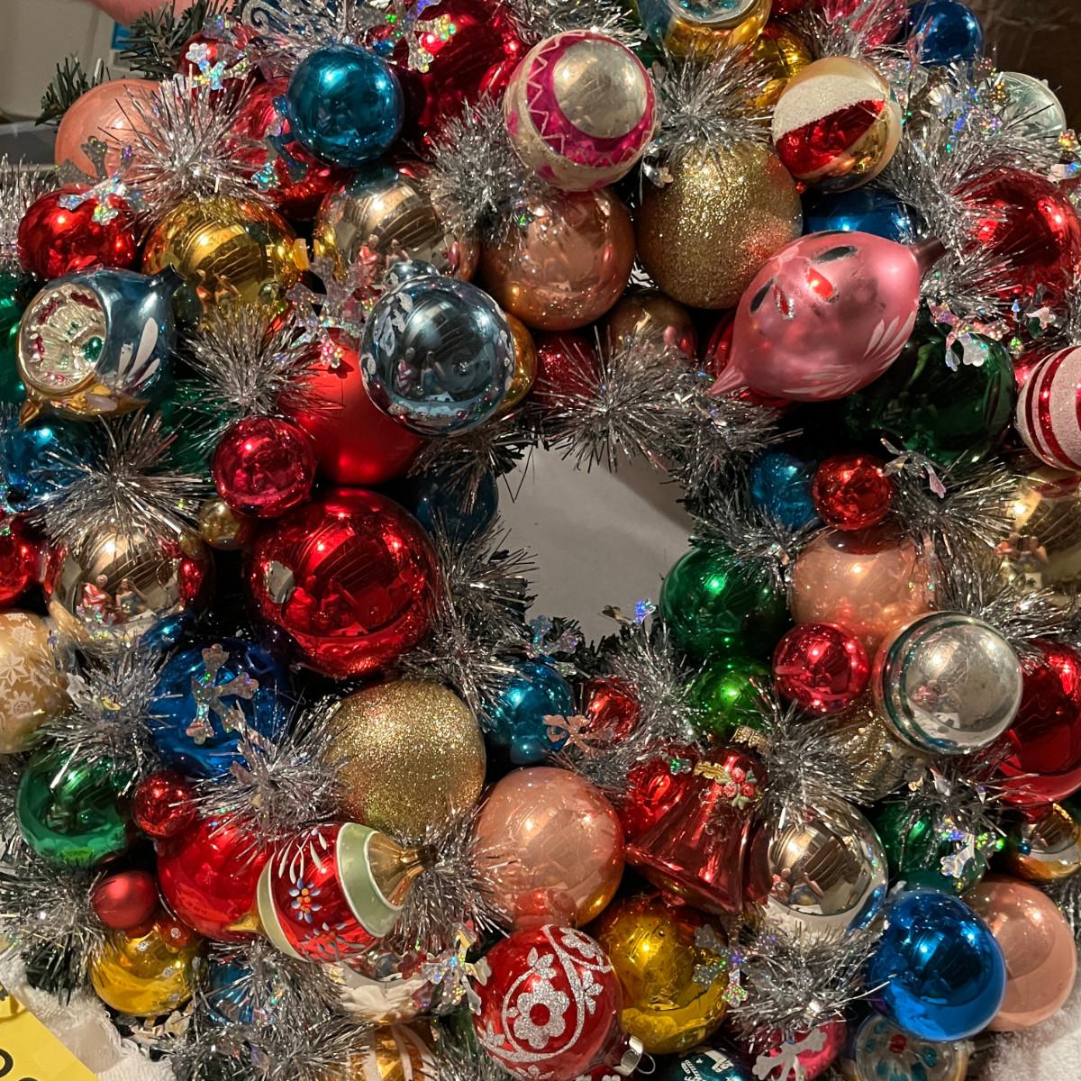 A gorgeous wreath made with vintage ornaments in a large storage box