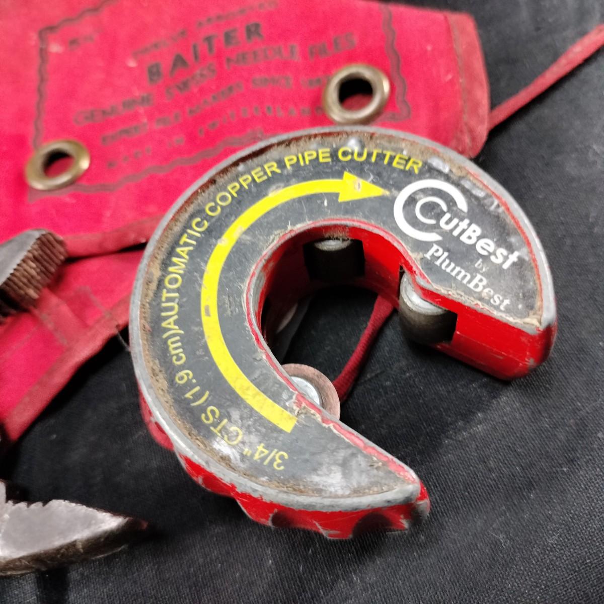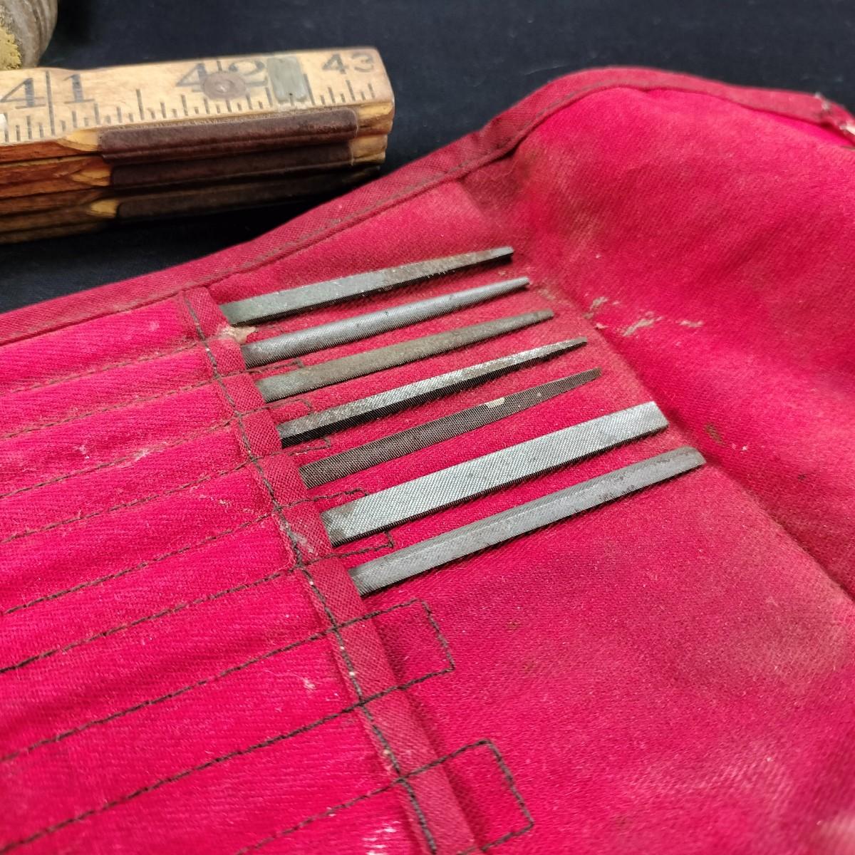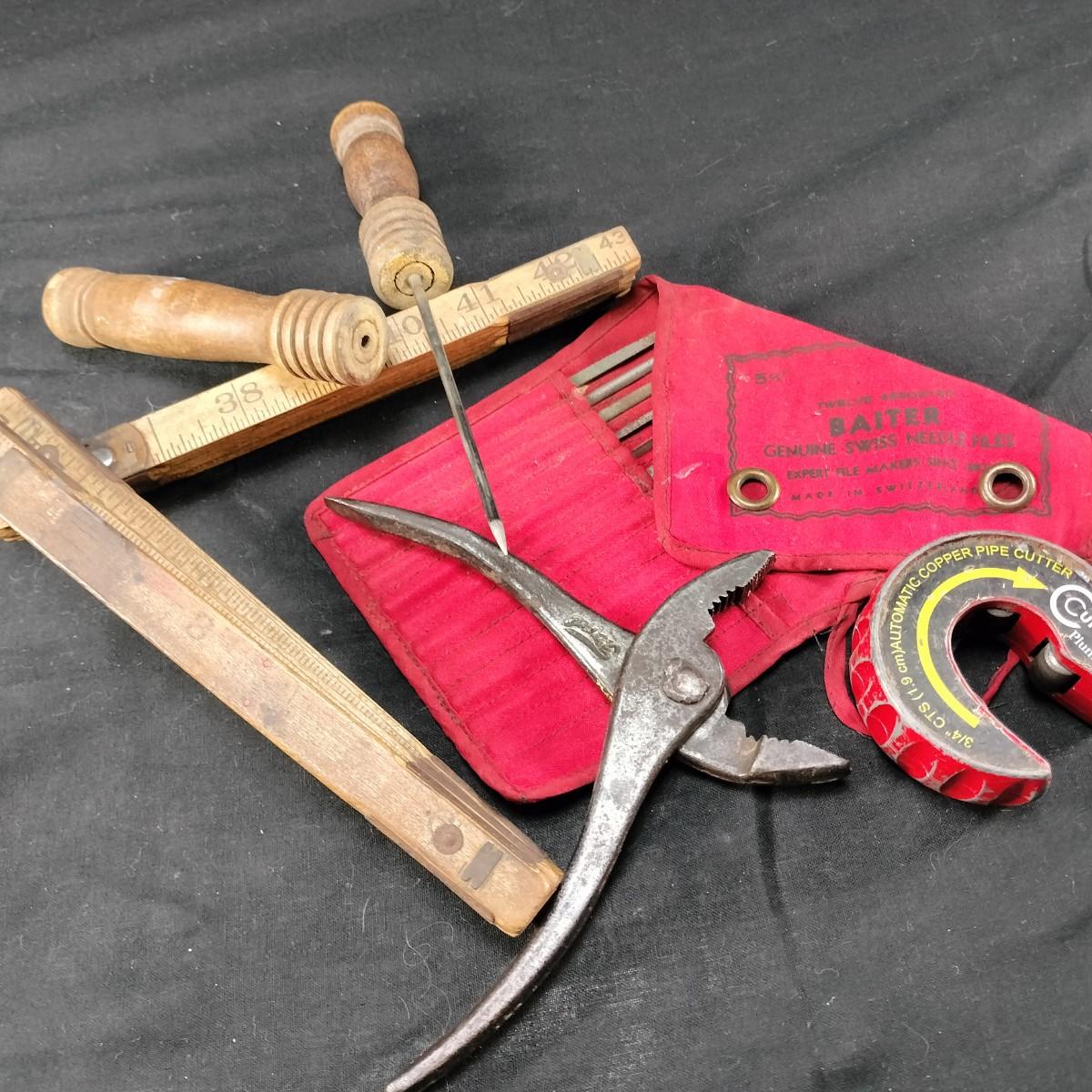 This auction lot is for Five Vintage Tools found in a drawer. This grouping includes a folding wood measure, an ice pick with shield, copper pipe cutter, most of the set of files and an always useful pair of pliers.