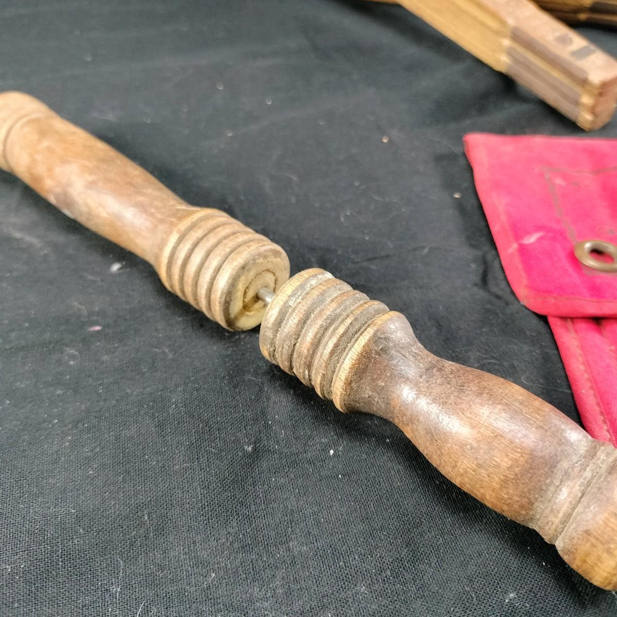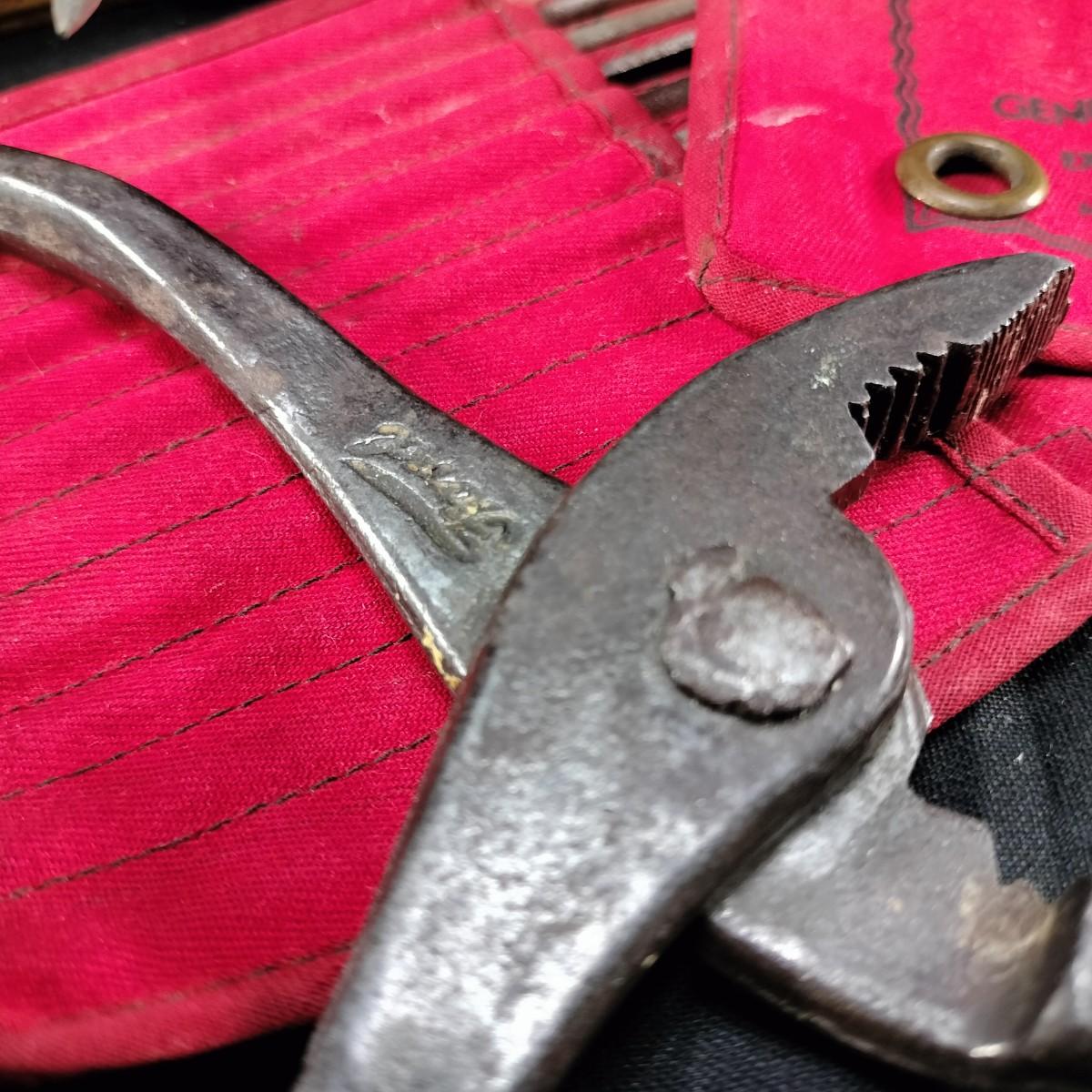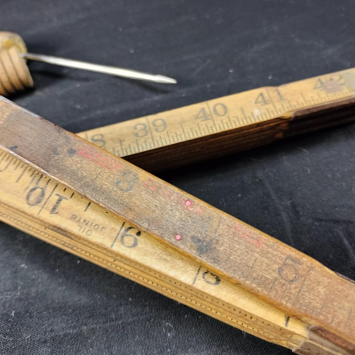 This auction lot is for Five Vintage Tools found in a drawer. This grouping includes a folding wood measure, an ice pick with shield, copper pipe cutter, most of the set of files and an always useful pair of pliers.