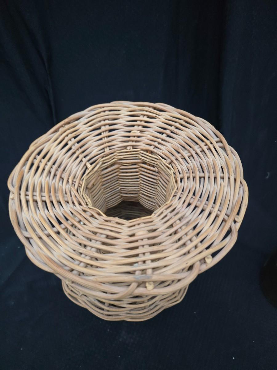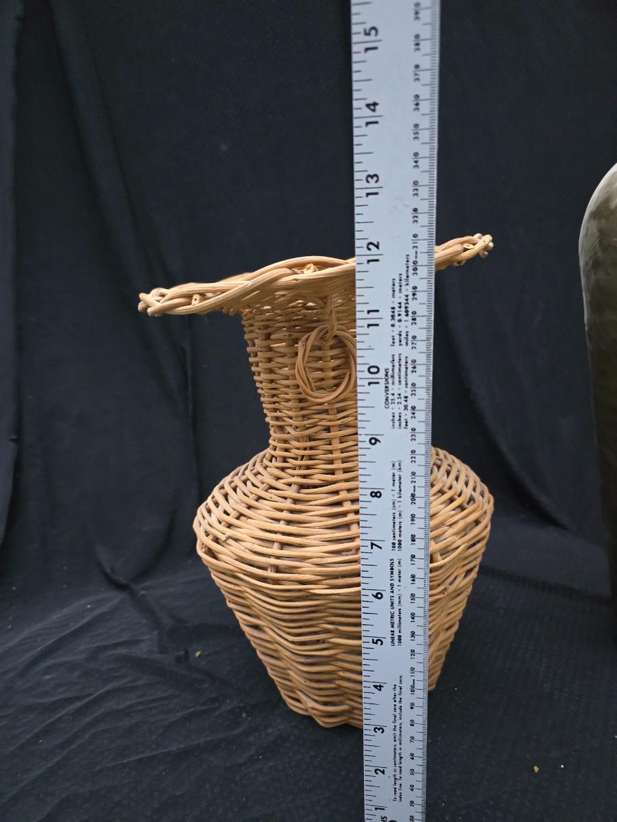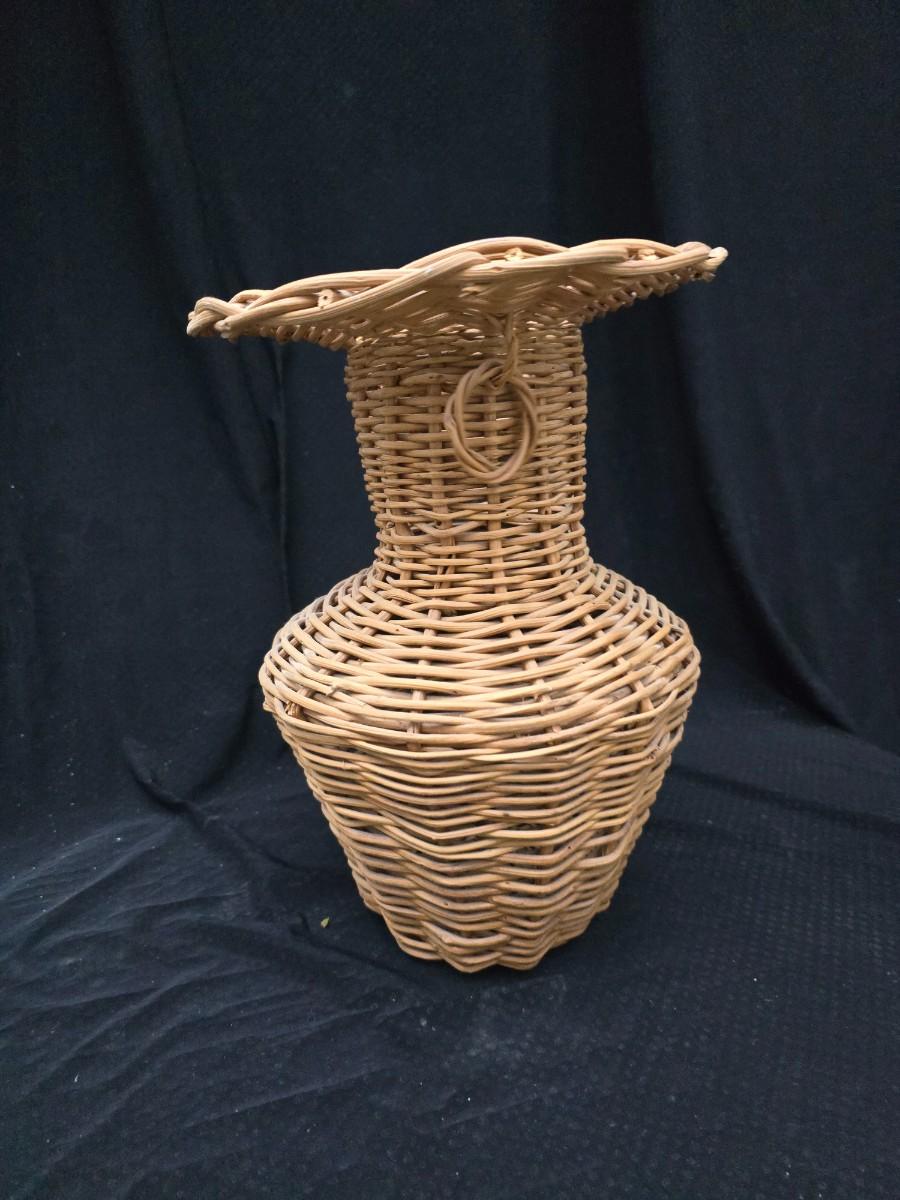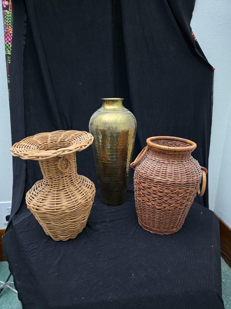 A hammered brass vase with two wicker basket vases