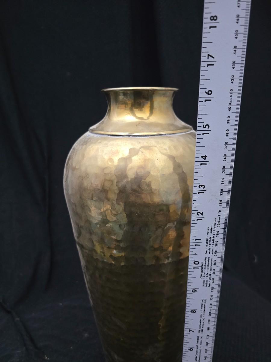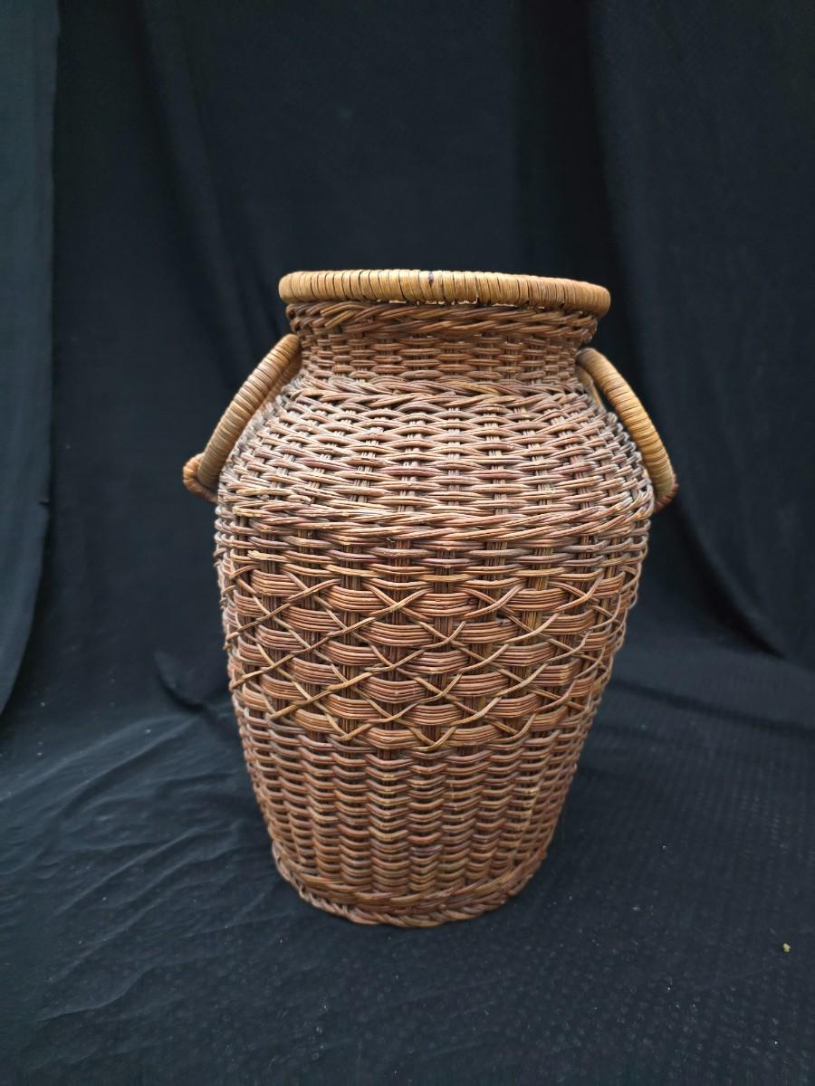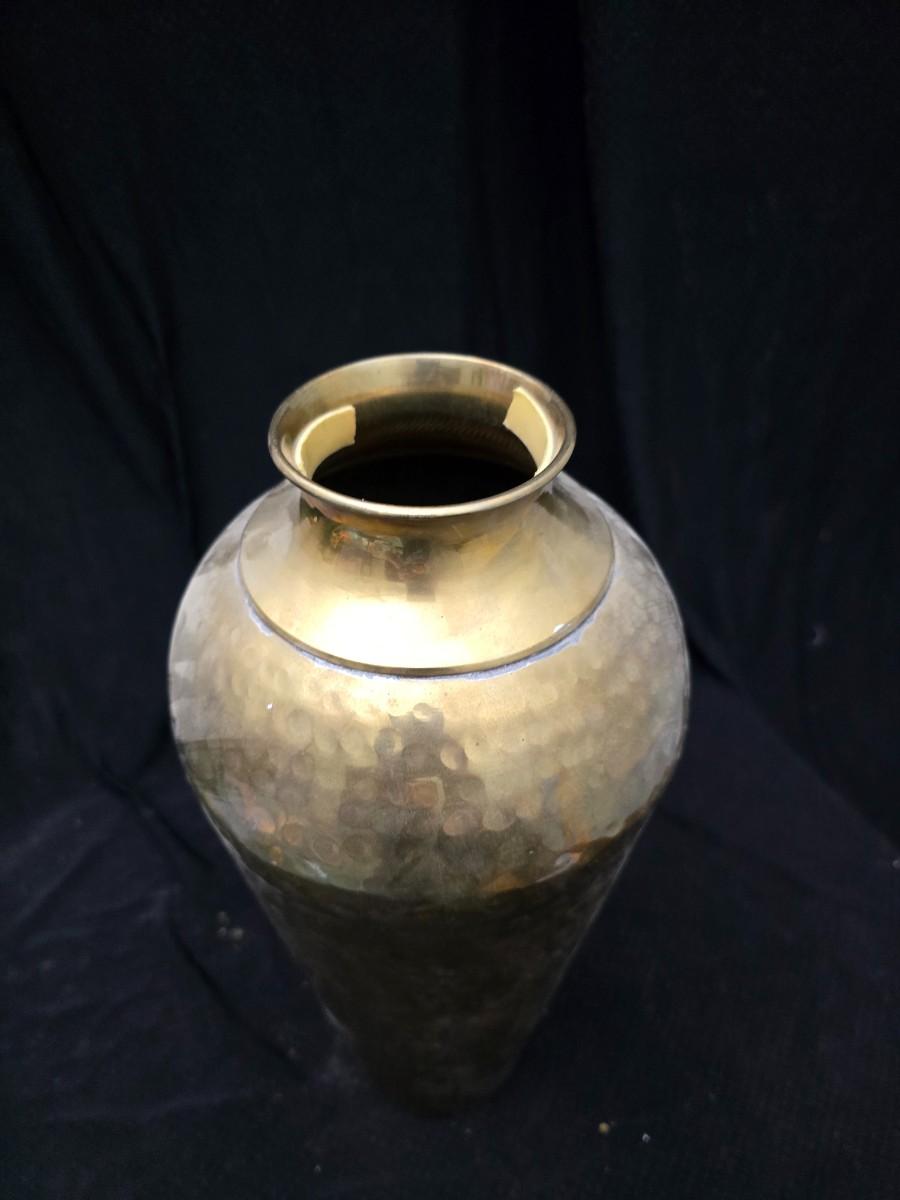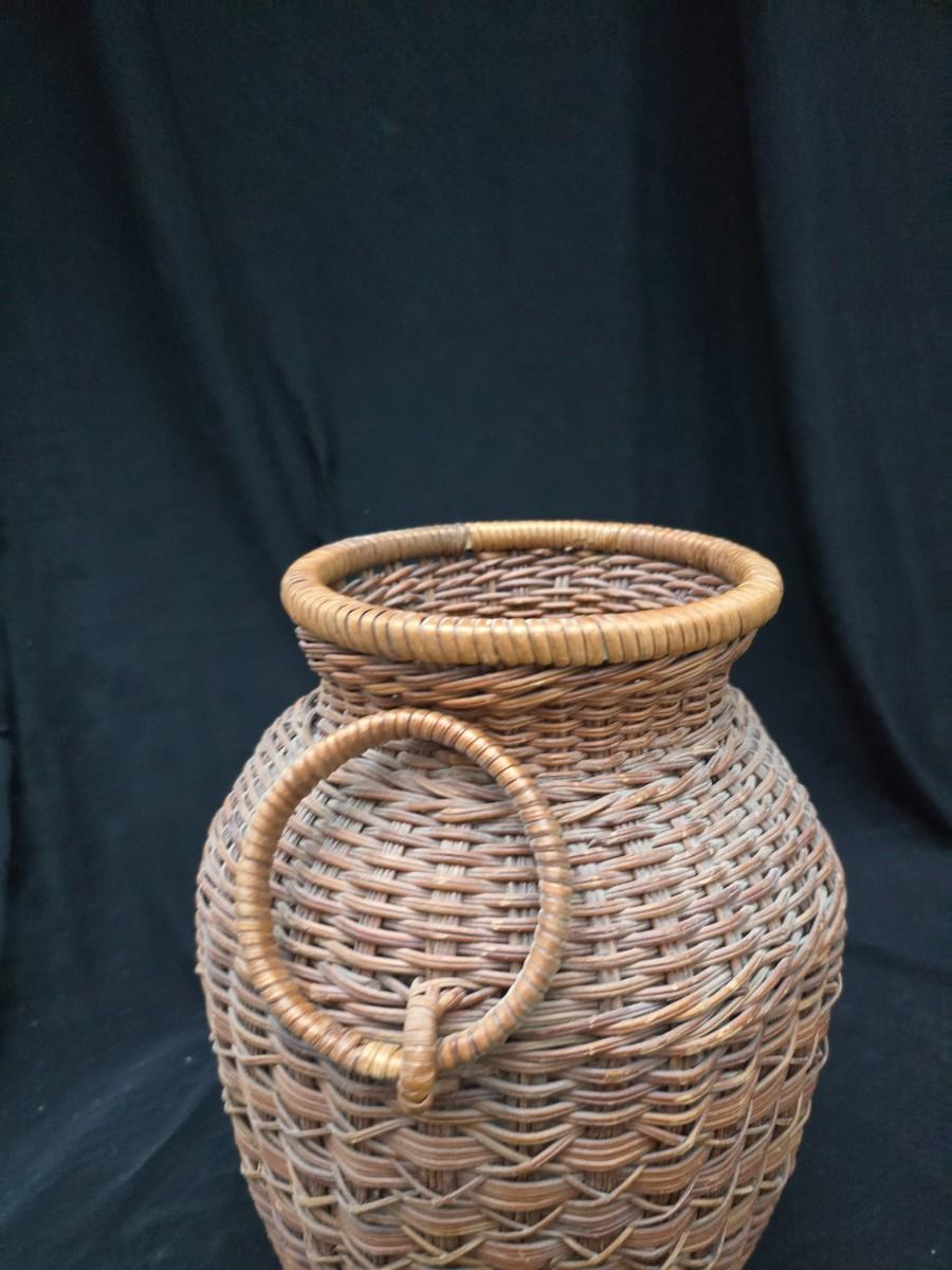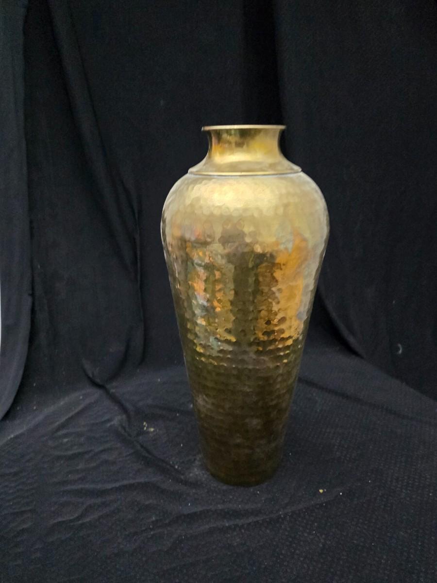 A hammered brass vase with two wicker basket vases