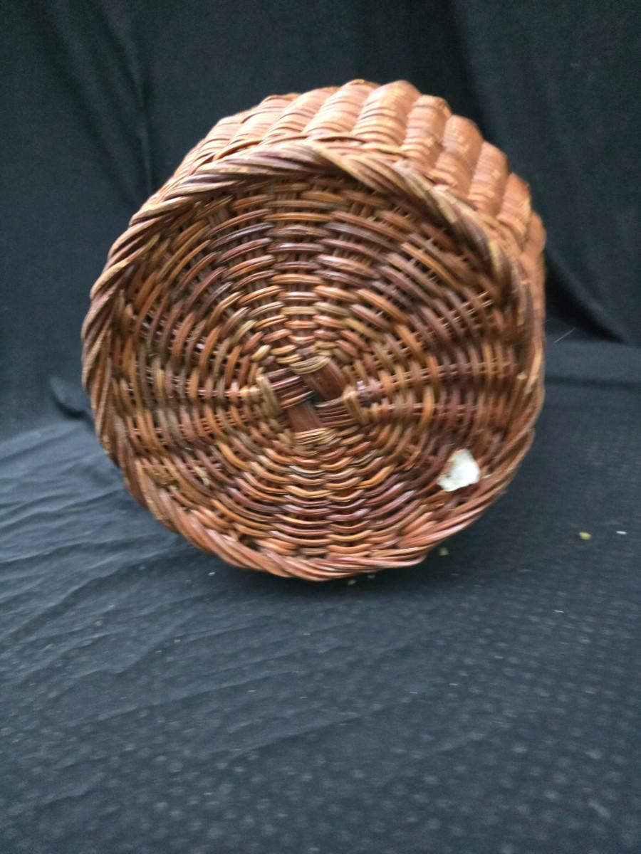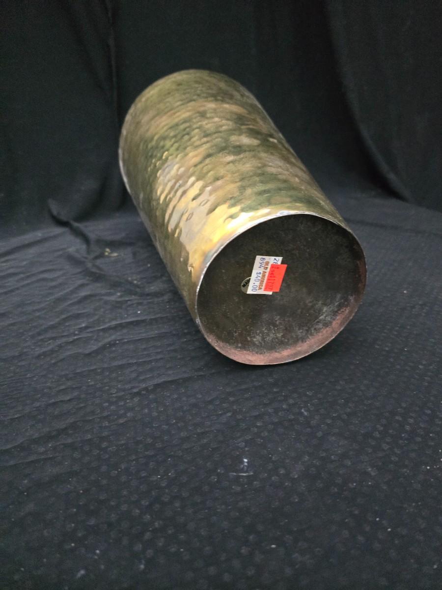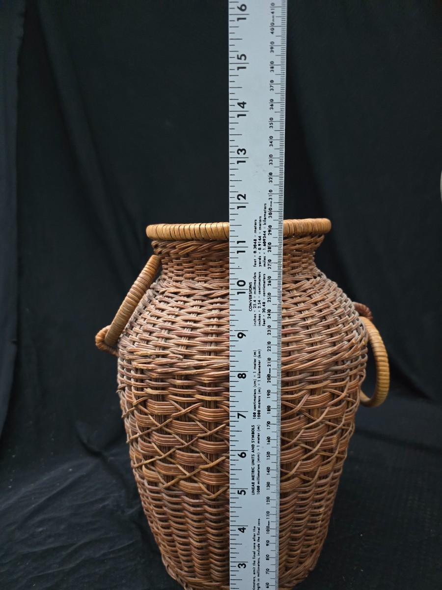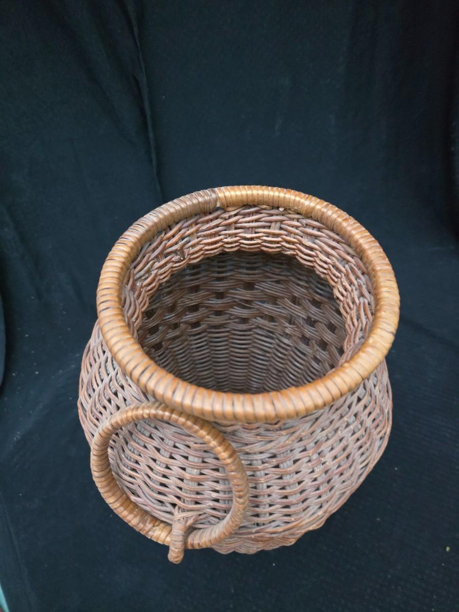 A hammered brass vase with two wicker basket vases
