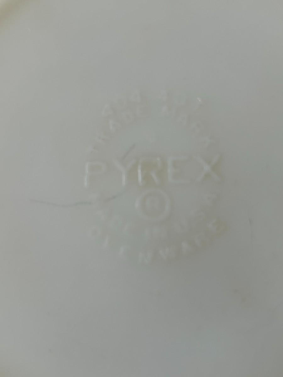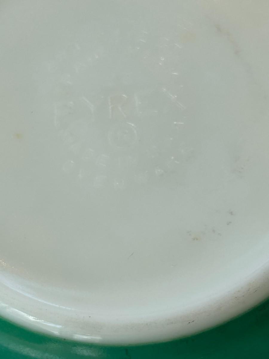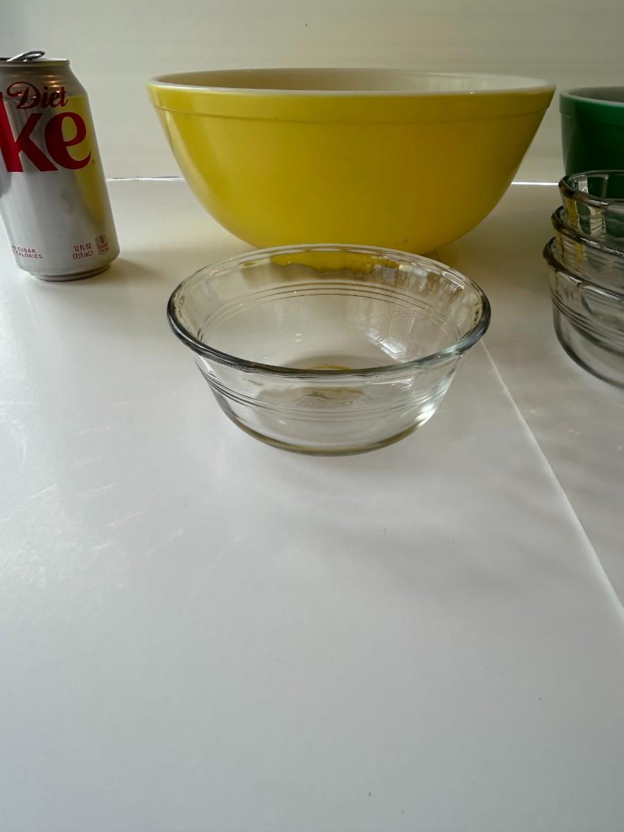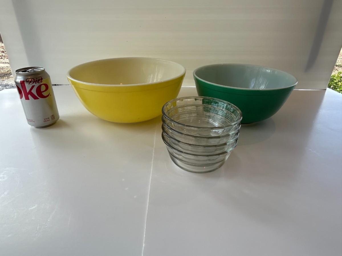 Vintage yellow and green Pyrex mixing bowls with four stacking custard cups