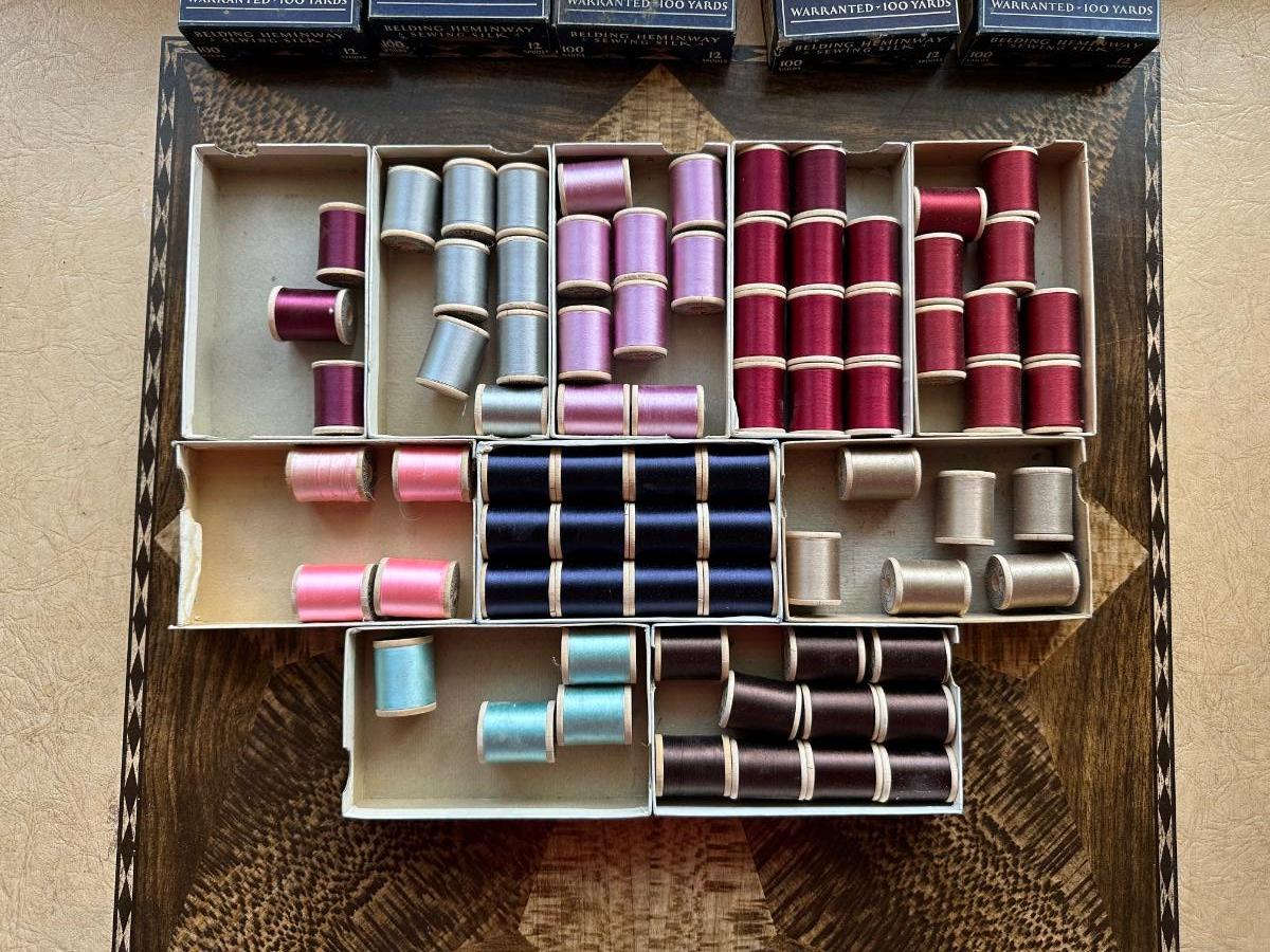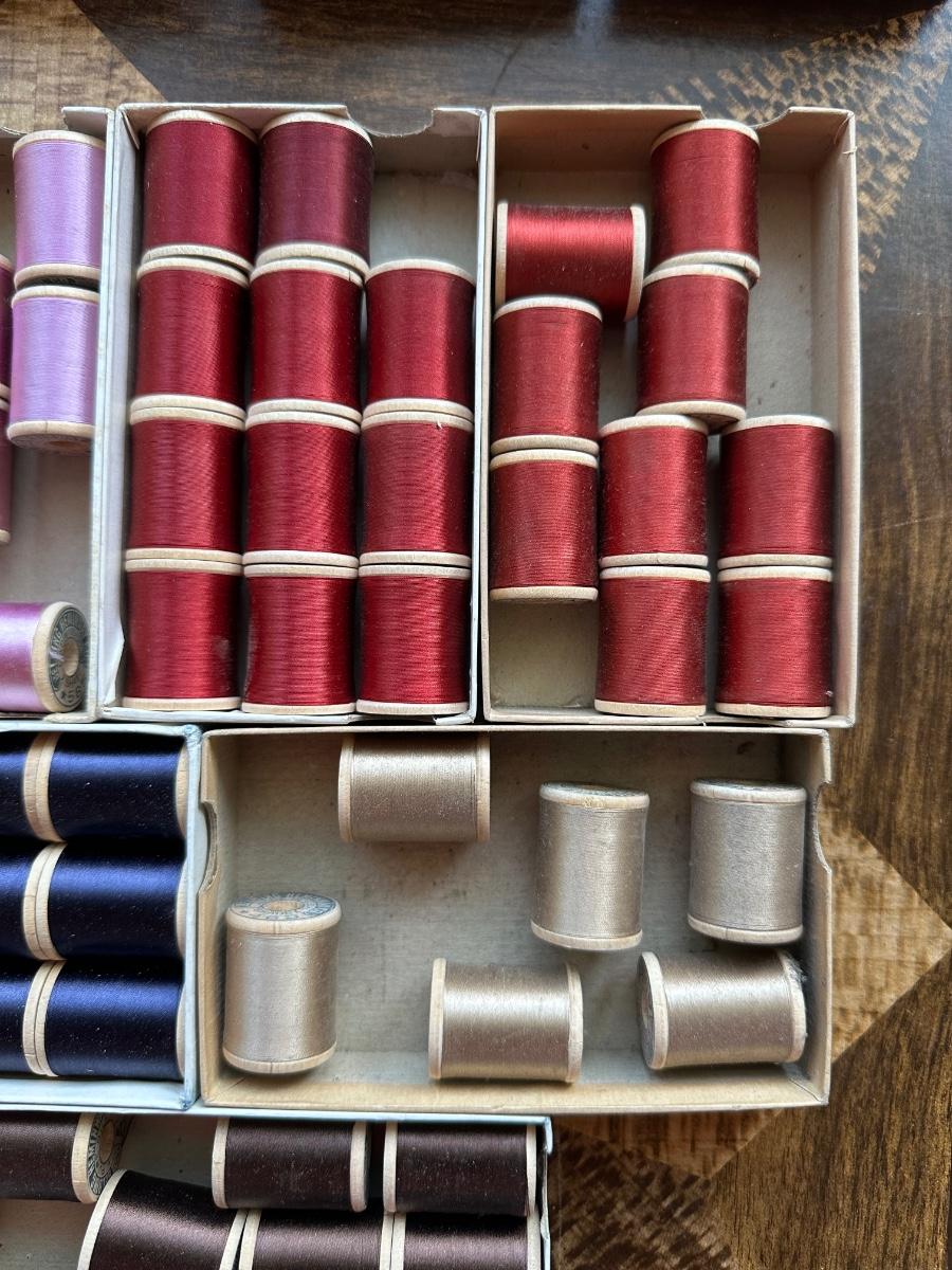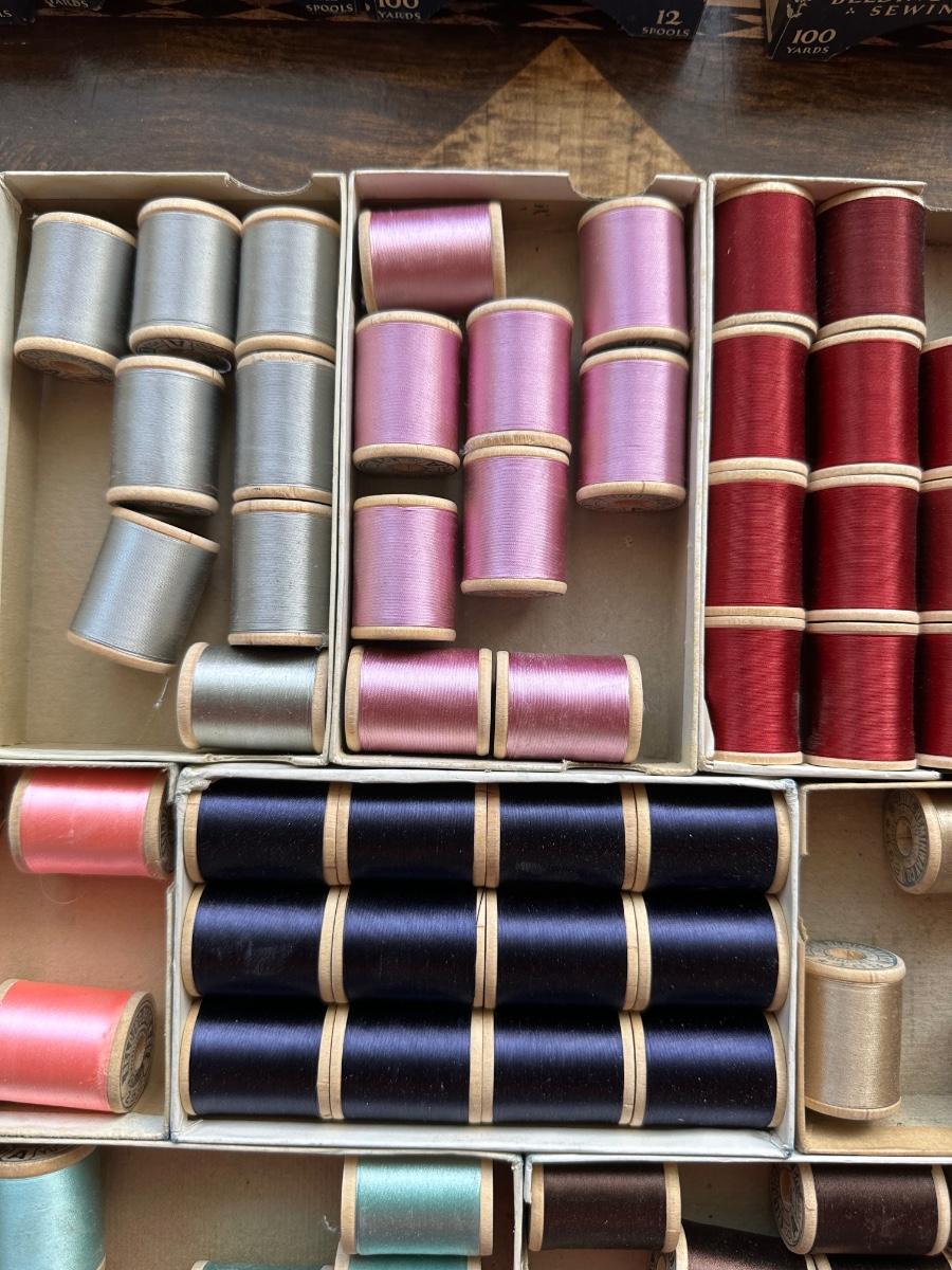 A LARGE ASSORTMENT OF BELDING HEMINWAY THREAD ON WOODEN SPOOLS