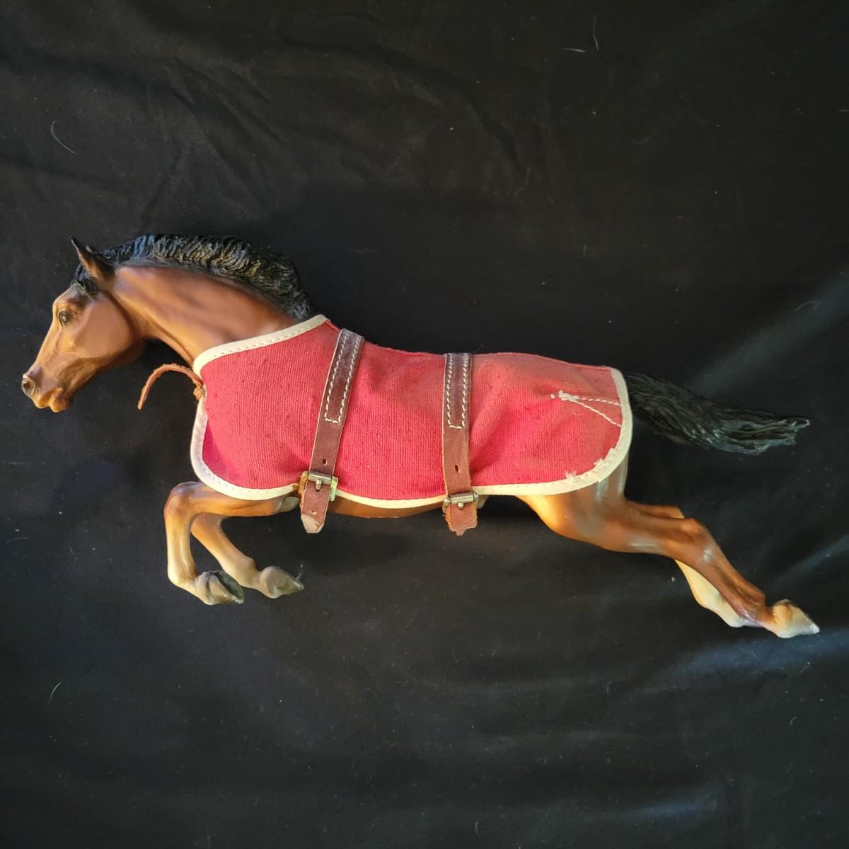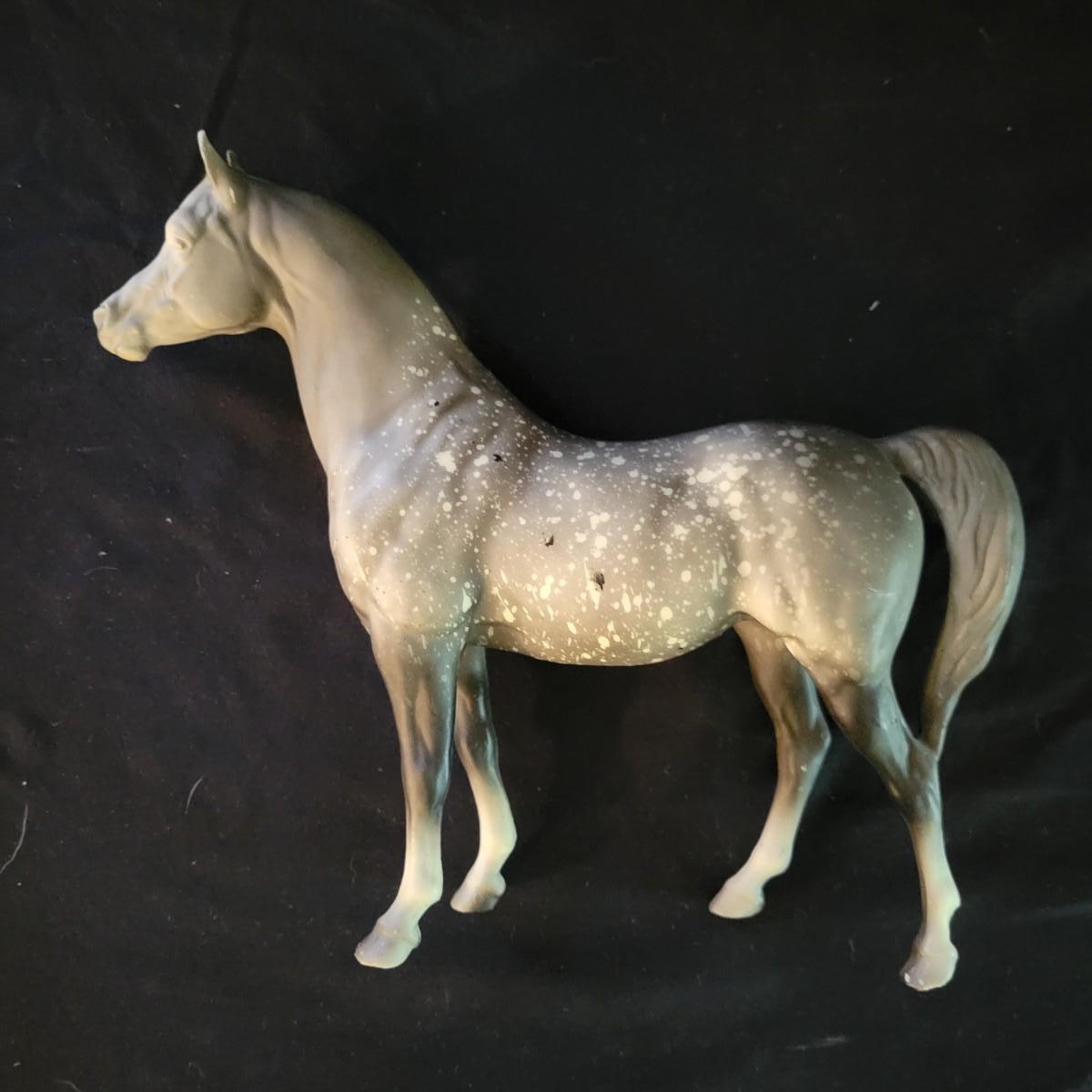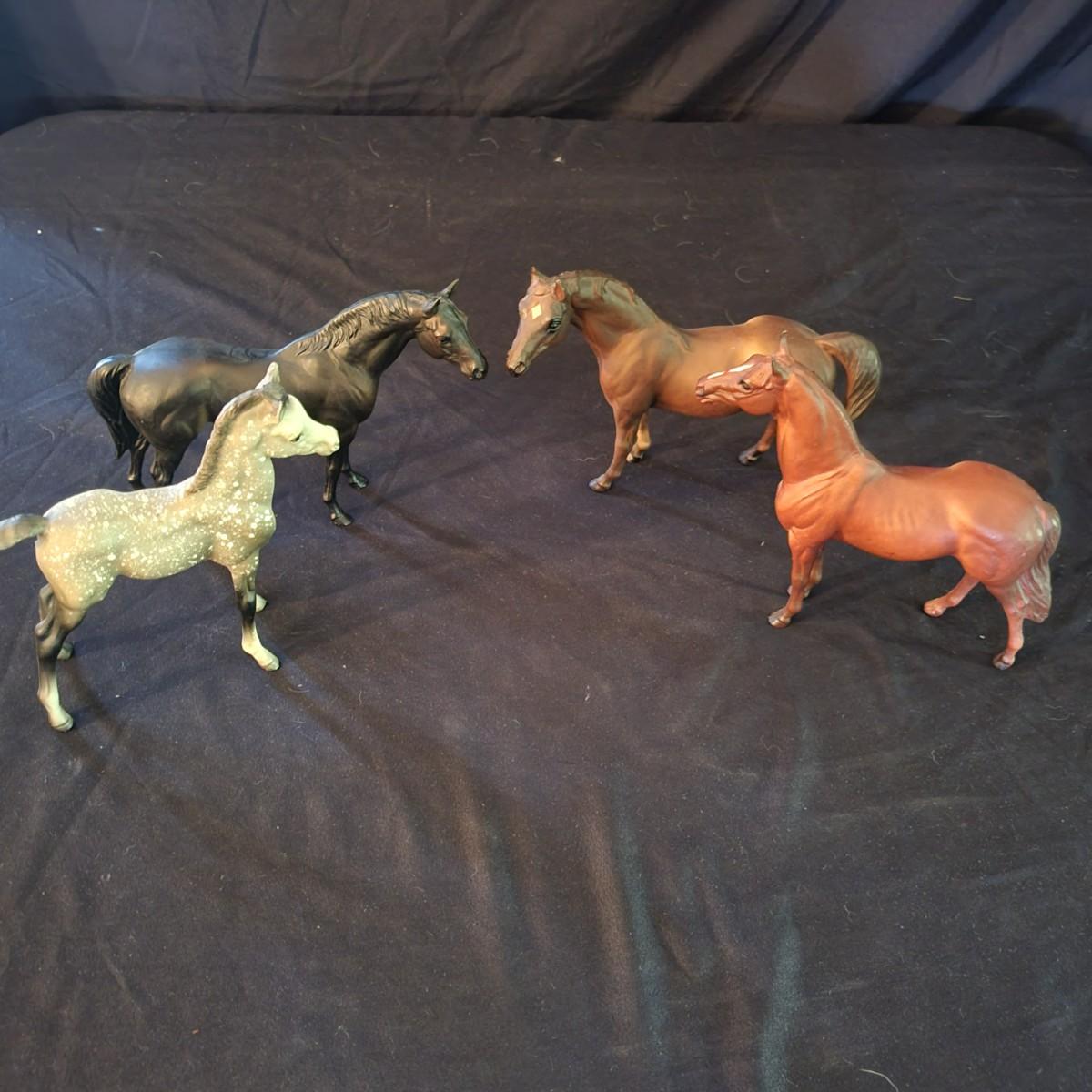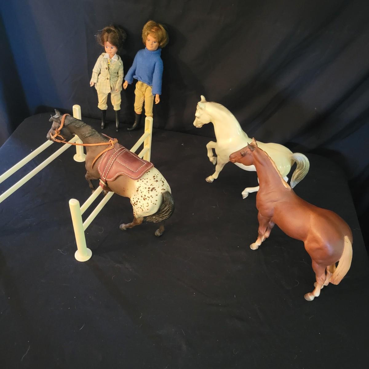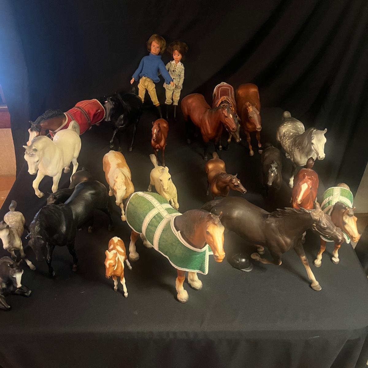 A large collection of Breyer Molded horses that has over 15 Breyer's. The horse that is saddled with spotted hind quarters measures approximately 11" x 3" x 7.5"H. Also included are four unstamped horses (grouped in one picture), two horse themed dolls and a pair of jumping gates. Shipping available