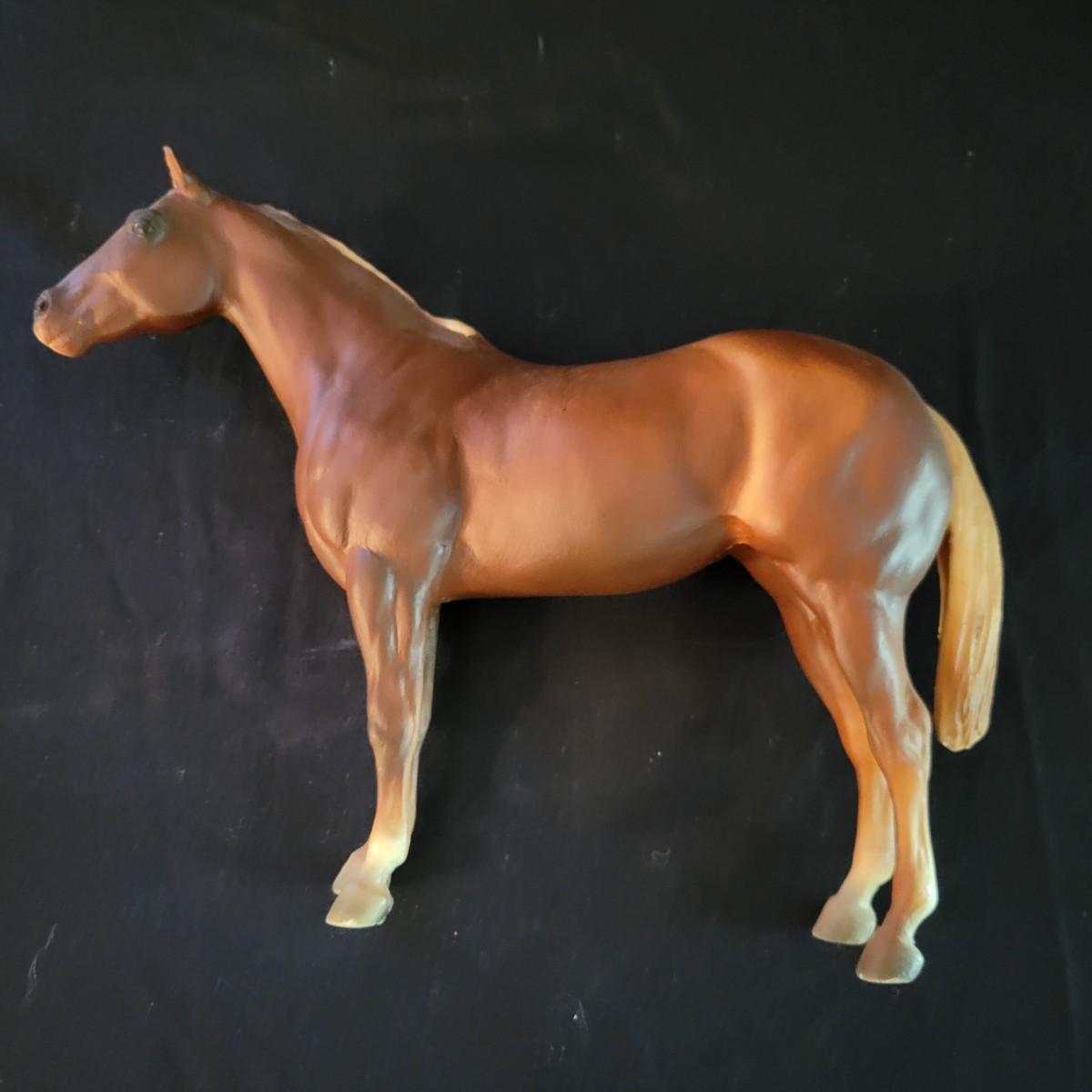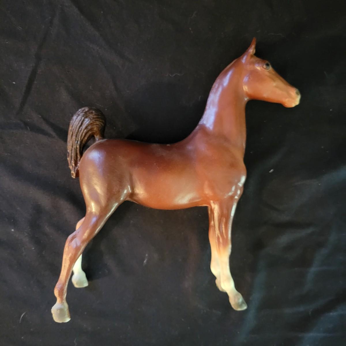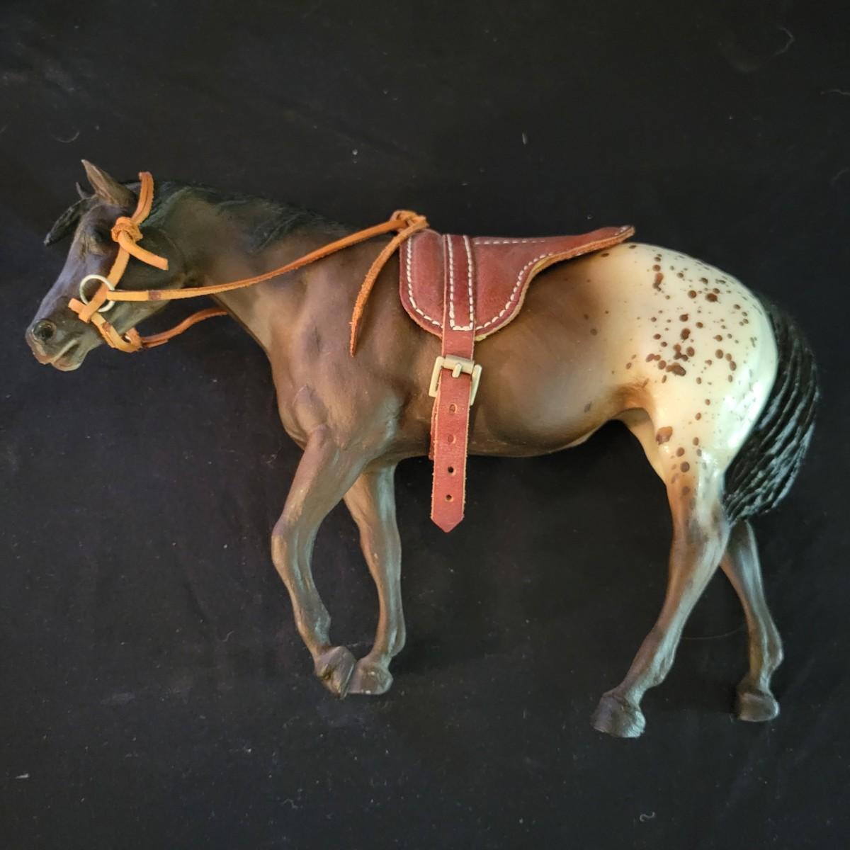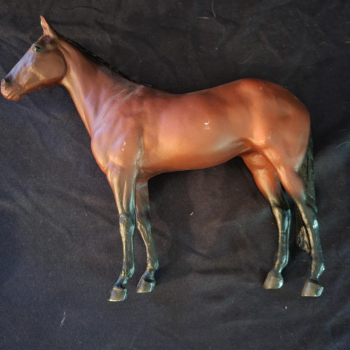 A large collection of Breyer Molded horses that has over 15 Breyer's. The horse that is saddled with spotted hind quarters measures approximately 11" x 3" x 7.5"H. Also included are four unstamped horses (grouped in one picture), two horse themed dolls and a pair of jumping gates. Shipping available