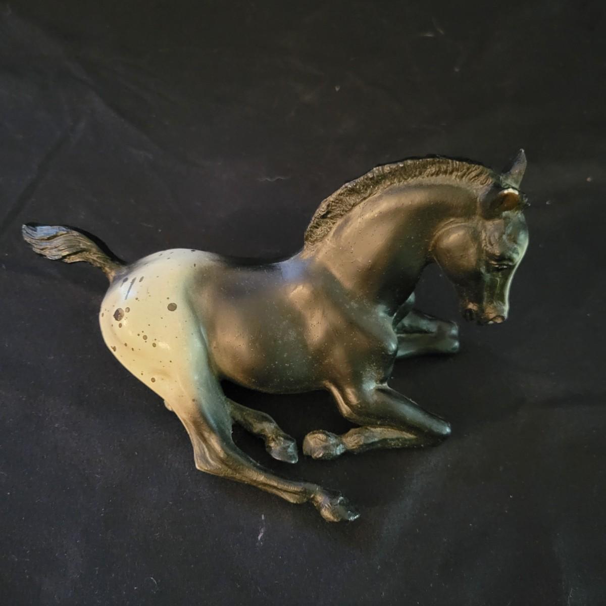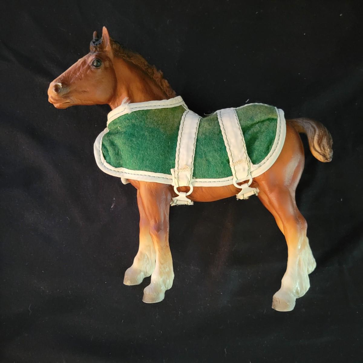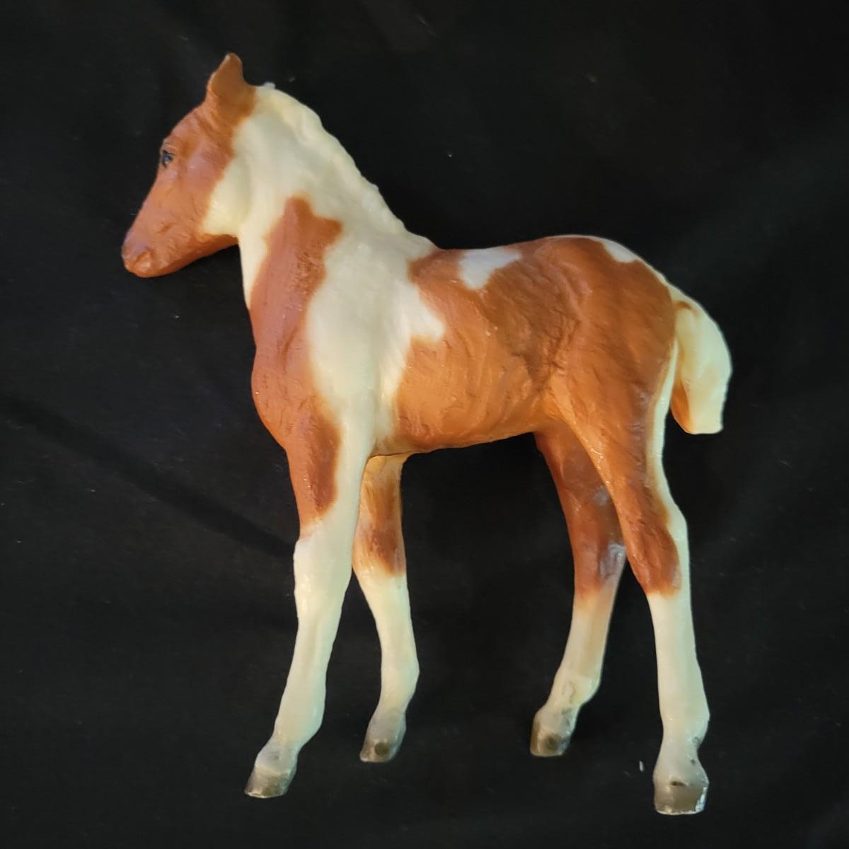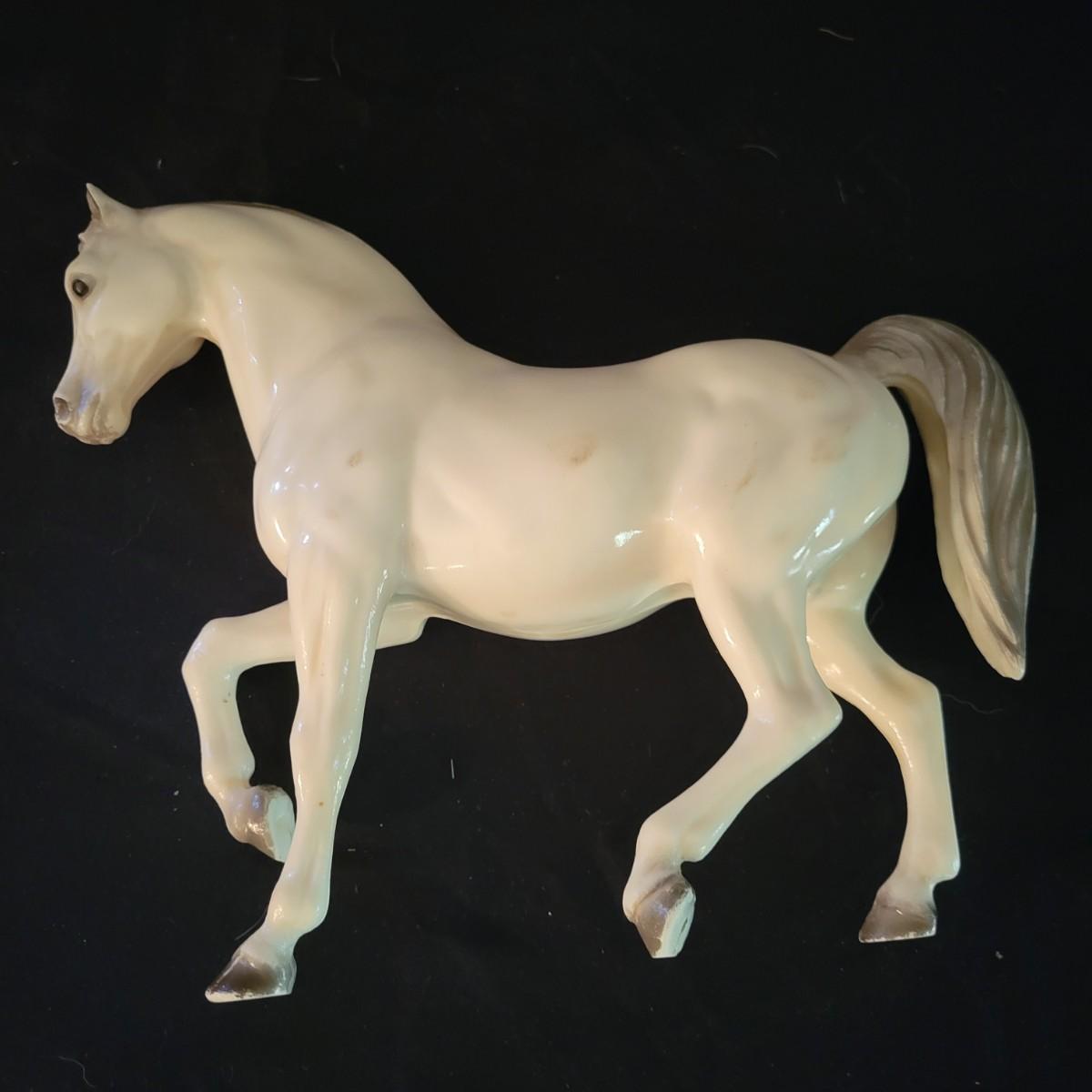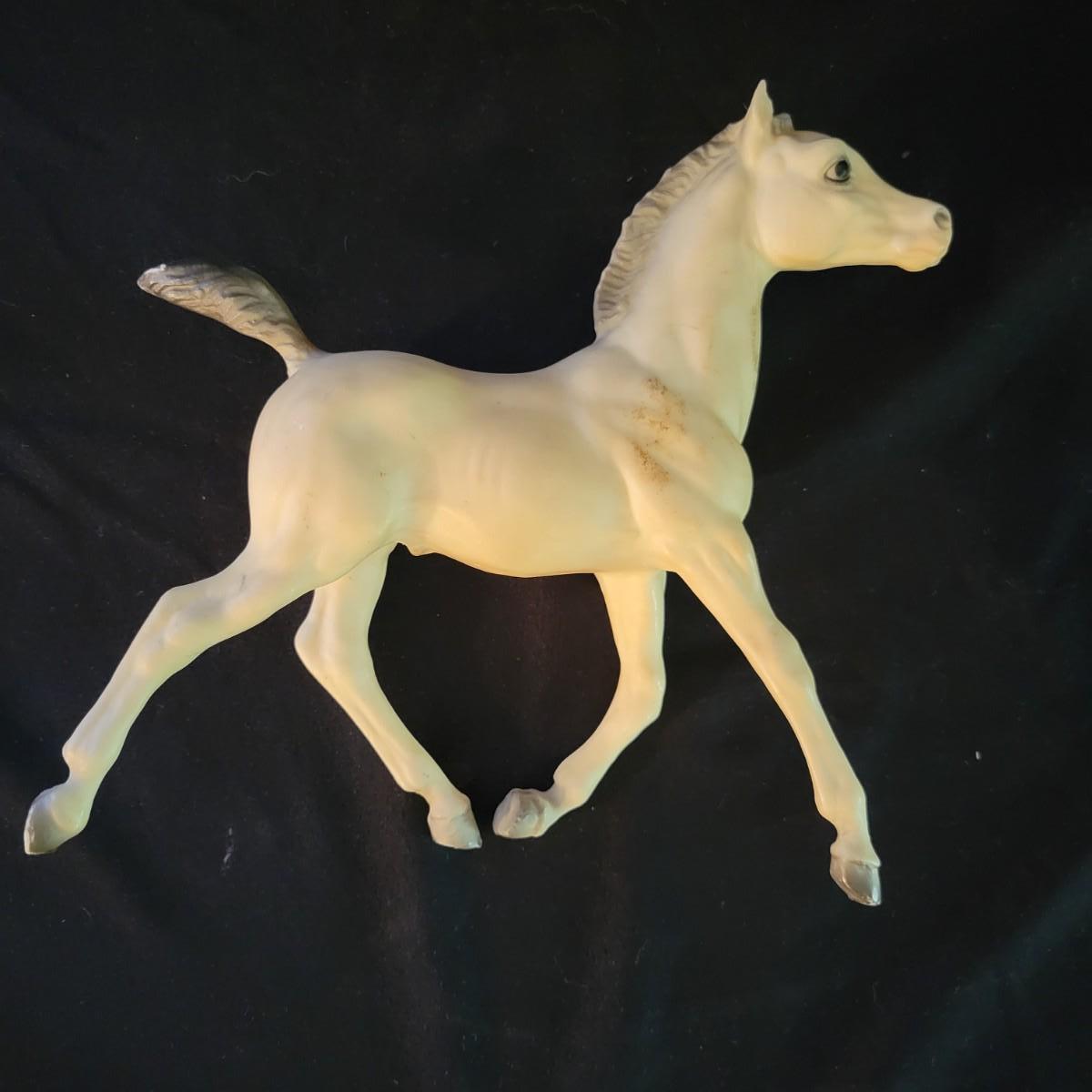 A large collection of Breyer Molded horses that has over 15 Breyer's. The horse that is saddled with spotted hind quarters measures approximately 11" x 3" x 7.5"H. Also included are four unstamped horses (grouped in one picture), two horse themed dolls and a pair of jumping gates. Shipping available