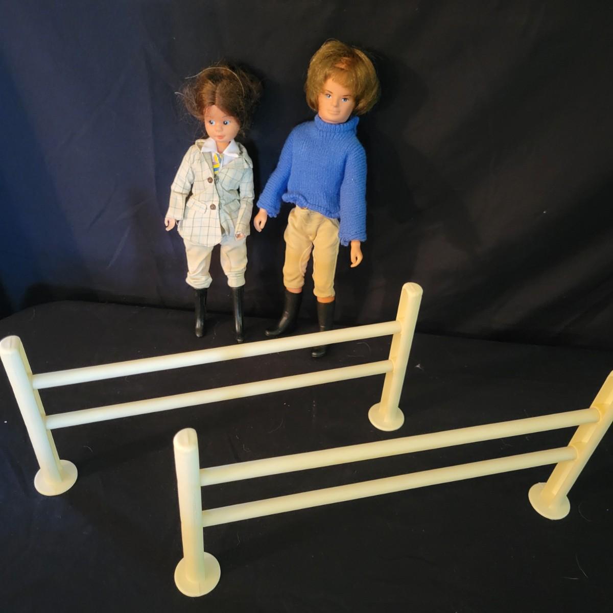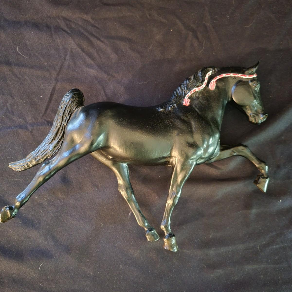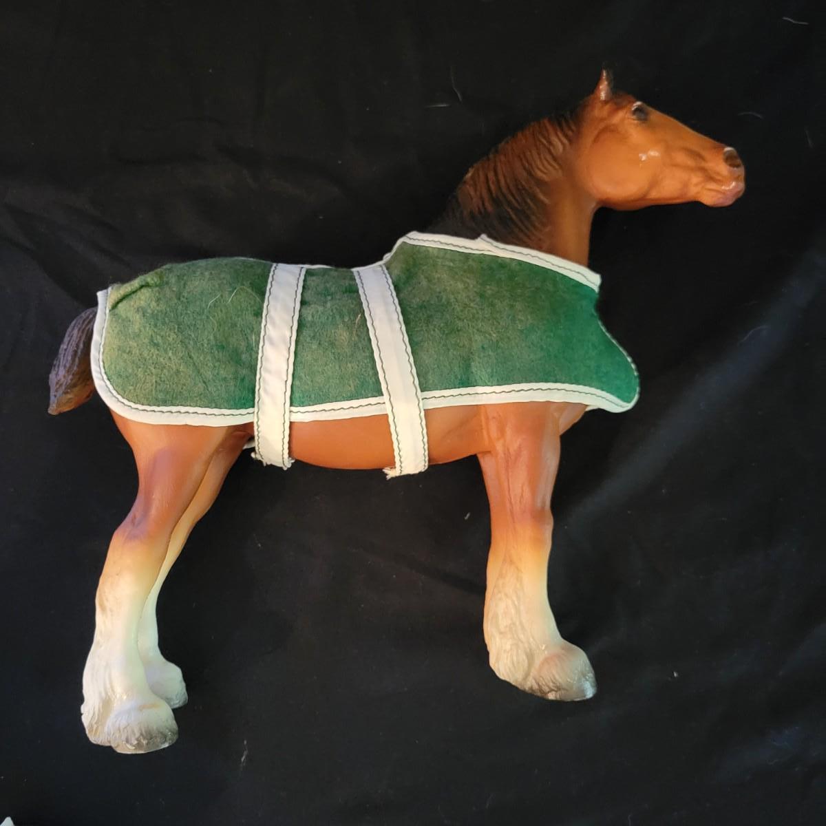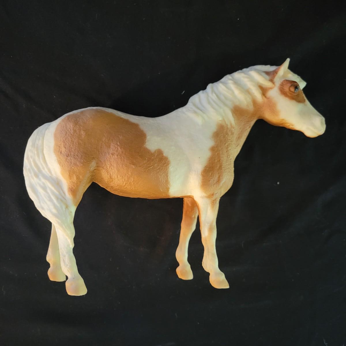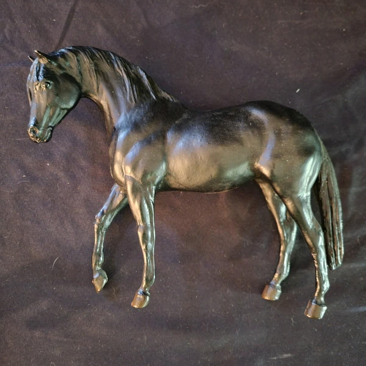 A large collection of Breyer Molded horses that has over 15 Breyer's. The horse that is saddled with spotted hind quarters measures approximately 11" x 3" x 7.5"H. Also included are four unstamped horses (grouped in one picture), two horse themed dolls and a pair of jumping gates. Shipping available