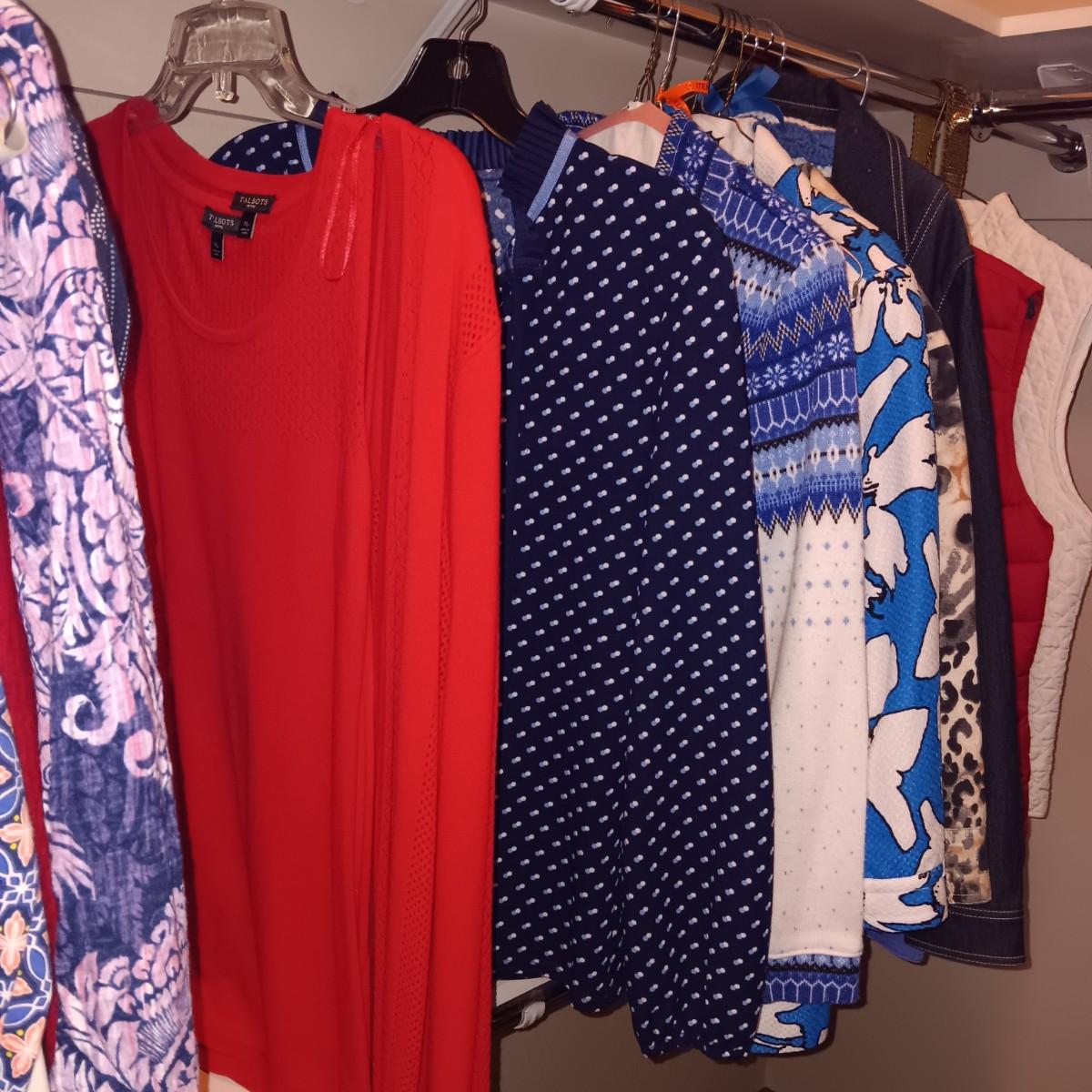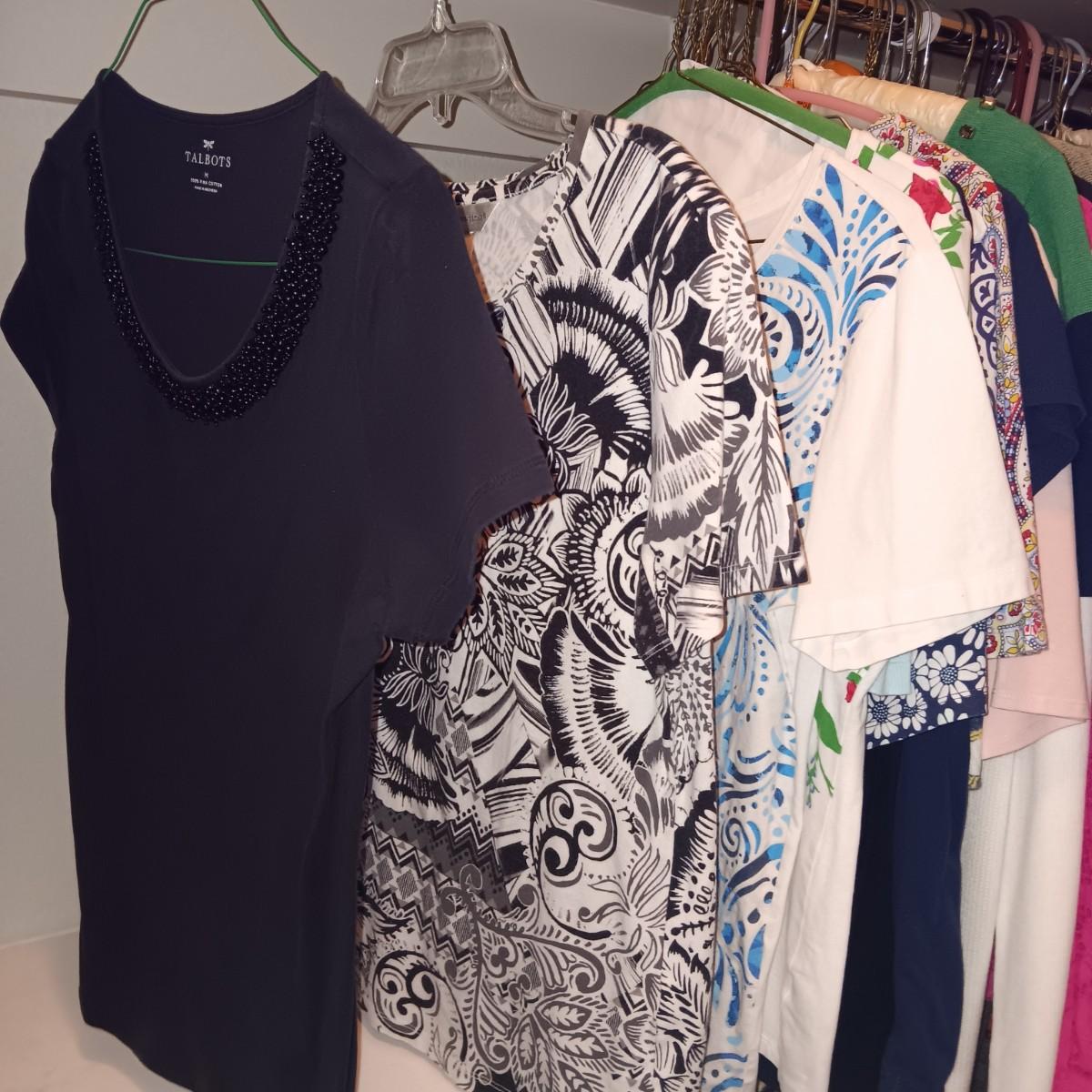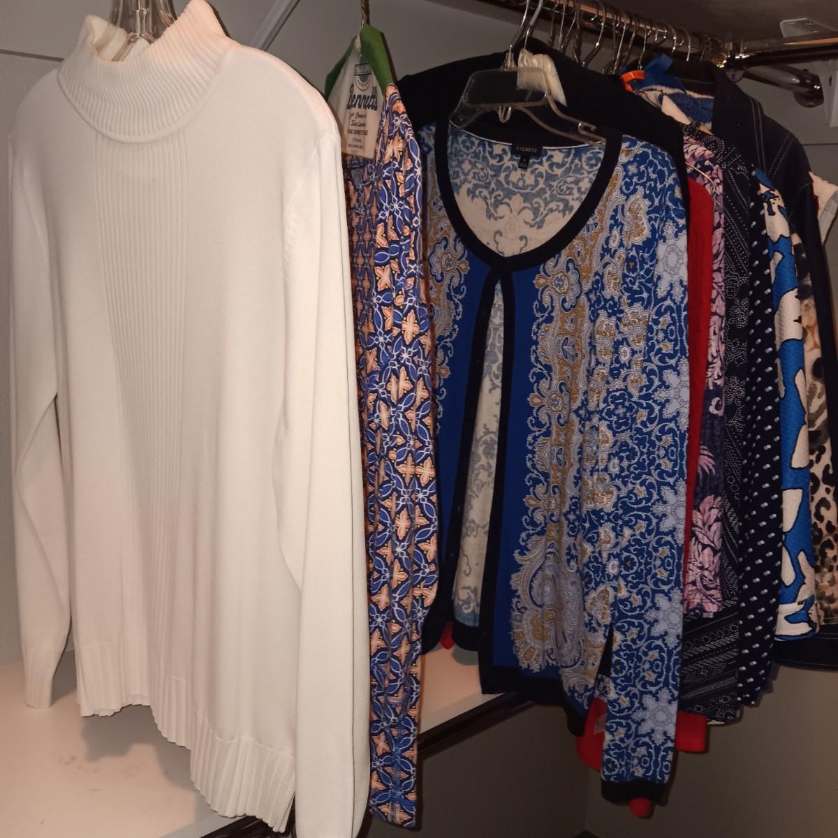 A LARGE COLLECTION OF LADIES CASUAL SHIRTS, SWEATERS, LIGHT JACKETS FROM TALBOTS, COLDCREEK, CHICO'S AND MORE (MED)