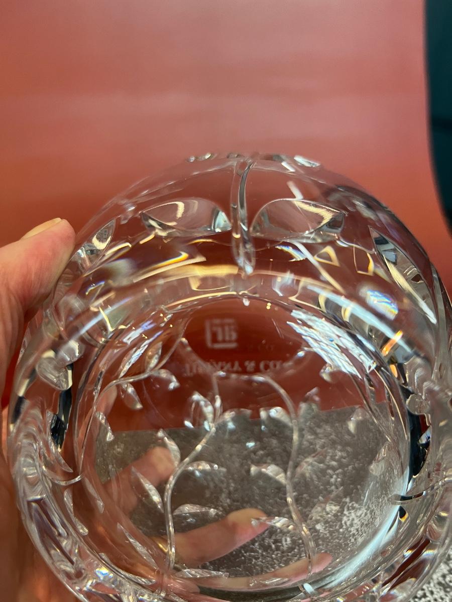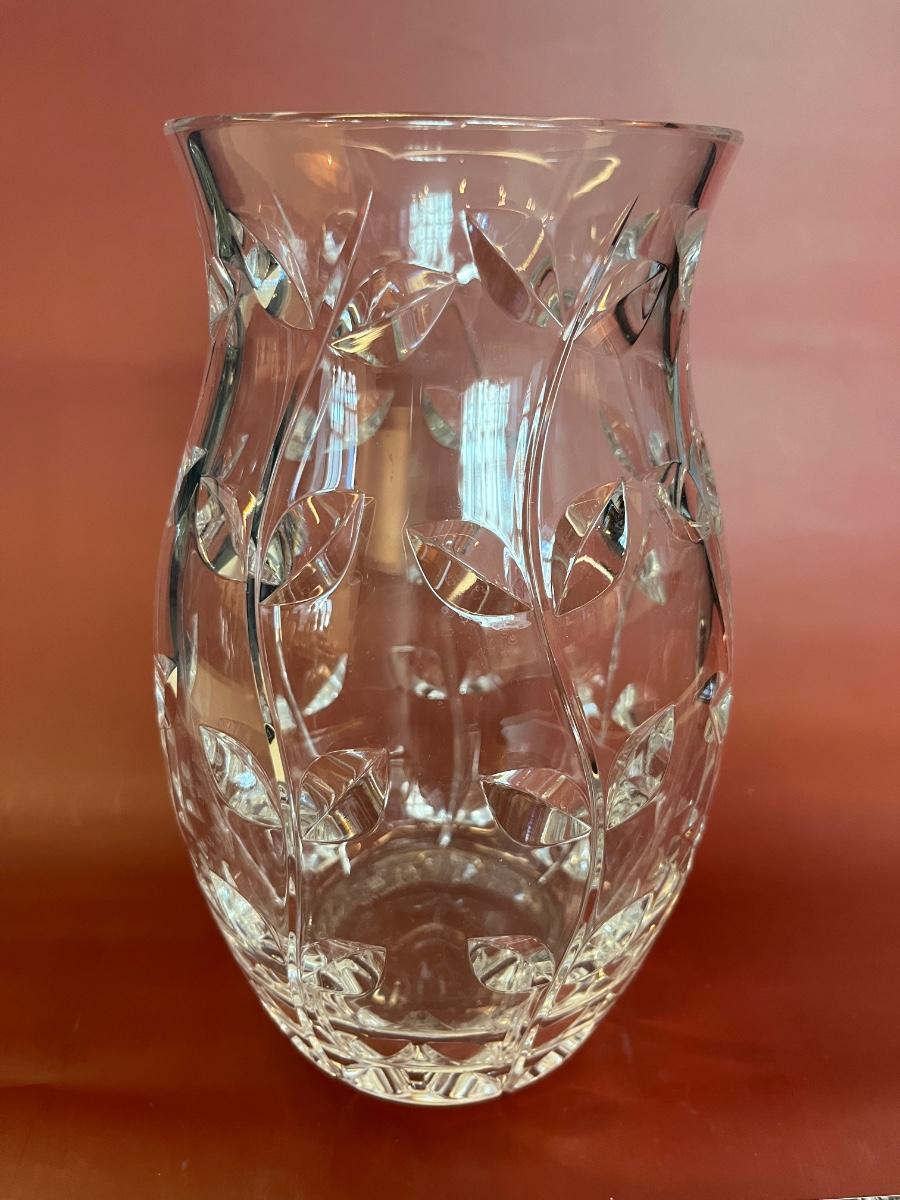 A large leaded crystal vase by Tiffany and Co with leaves, simple and modern design, 9.5”h x 5.5”w.