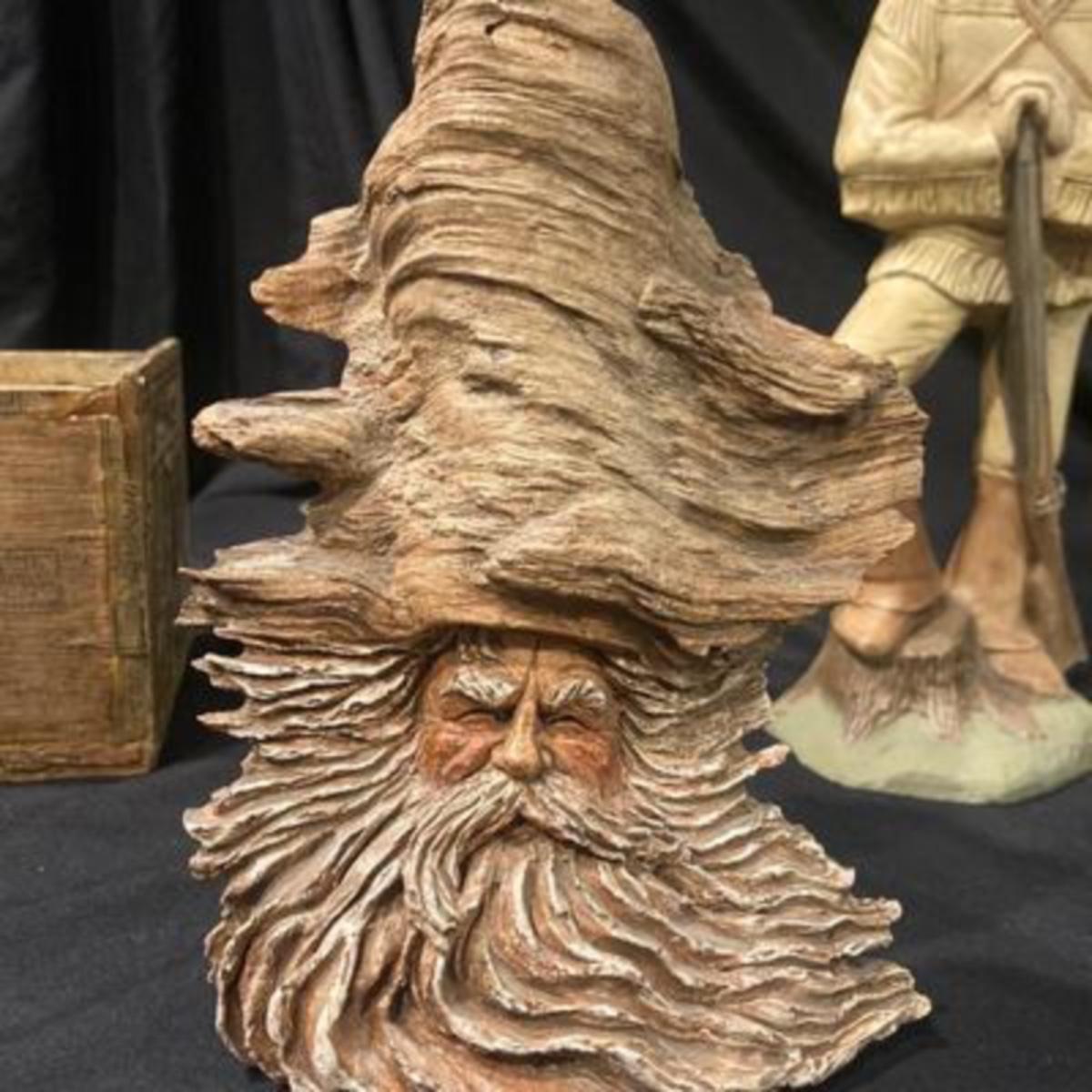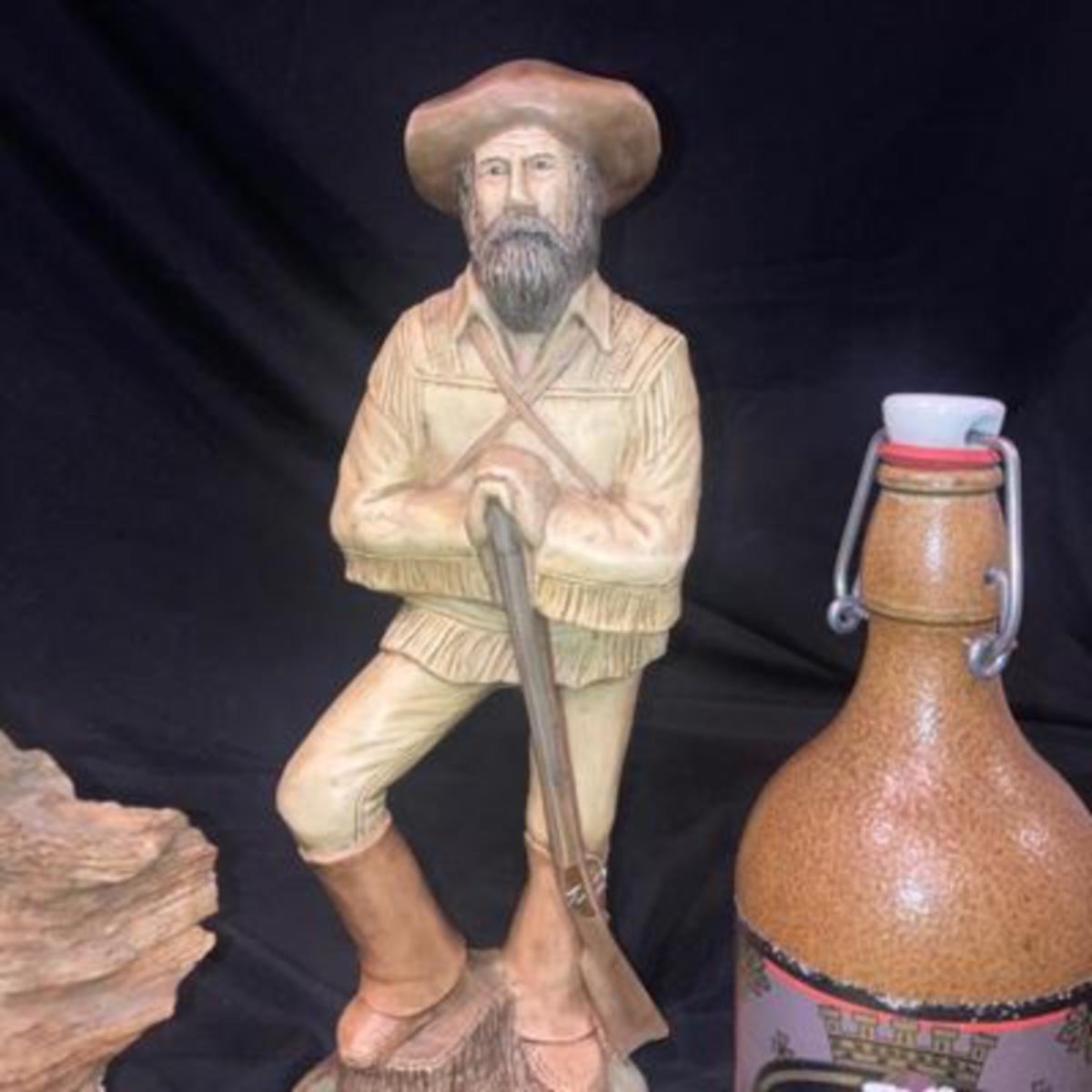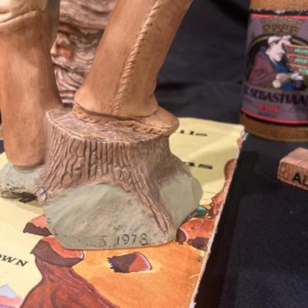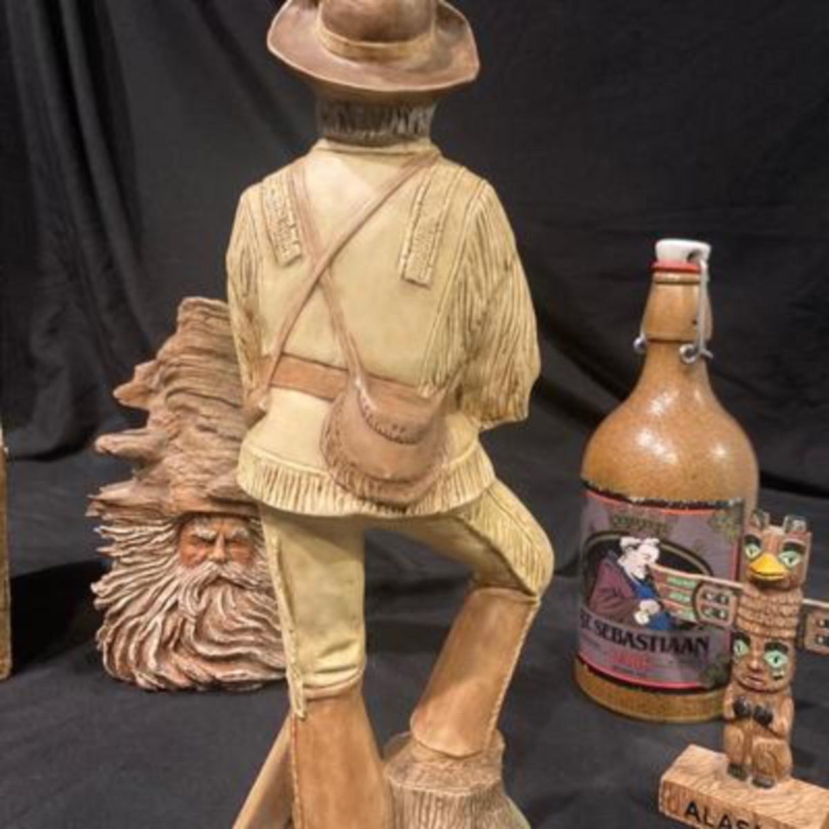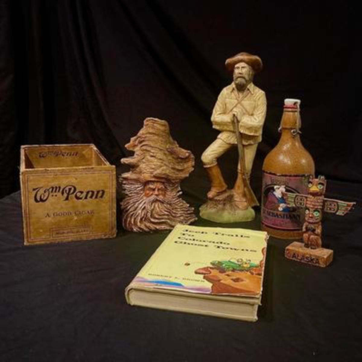 Ceramic Trapperman, cigarbox, crock like beer bottle, wood spirit tree wizard, totem pole from Alaska & Nifty Jeep trail book from the 60’s