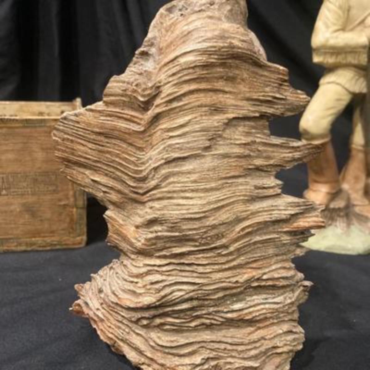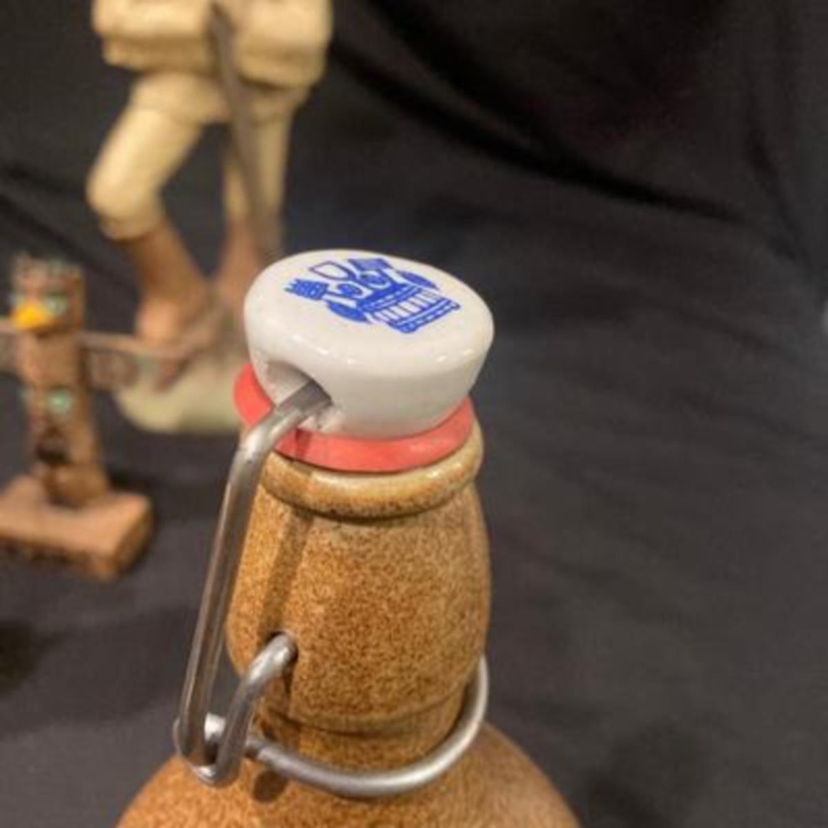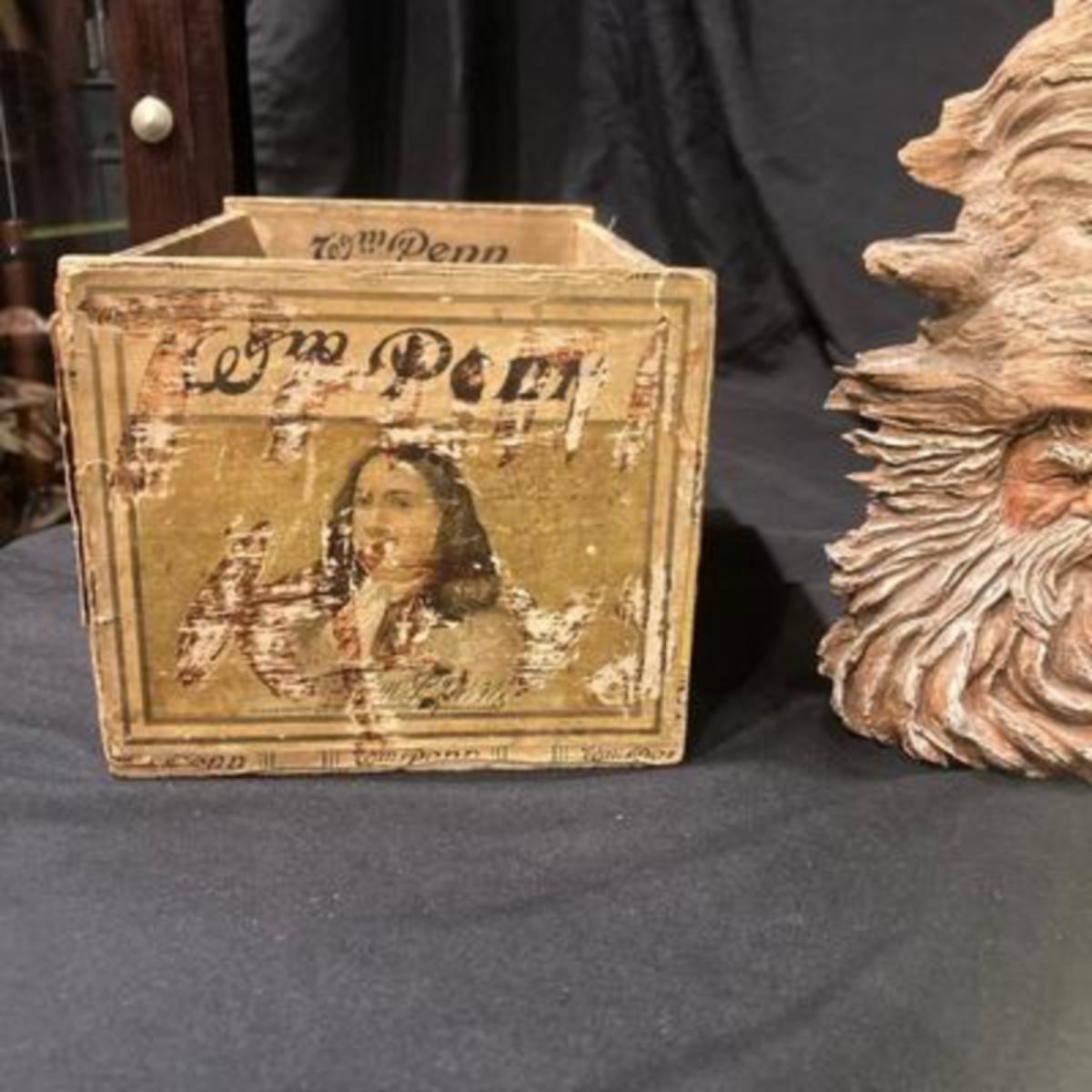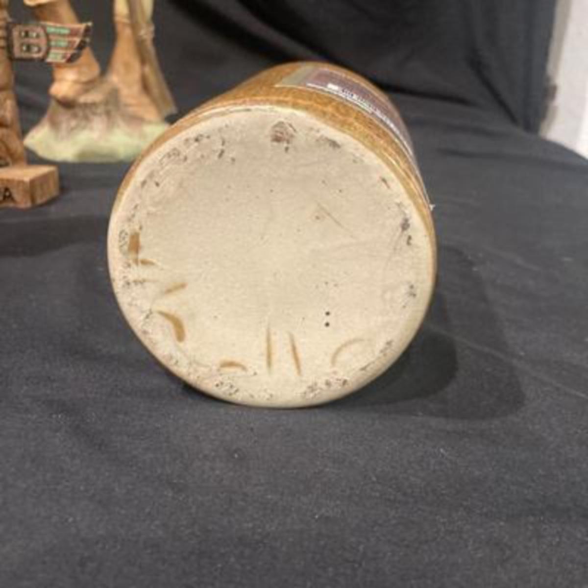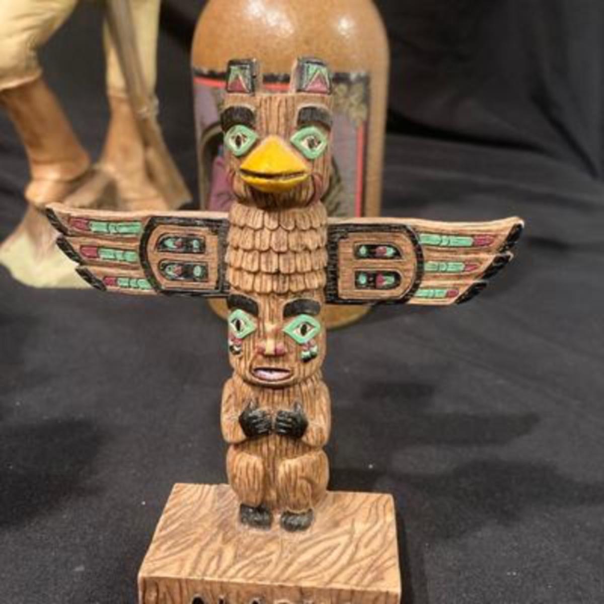 Ceramic Trapperman, cigarbox, crock like beer bottle, wood spirit tree wizard, totem pole from Alaska & Nifty Jeep trail book from the 60’s