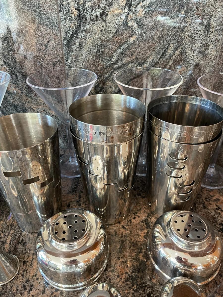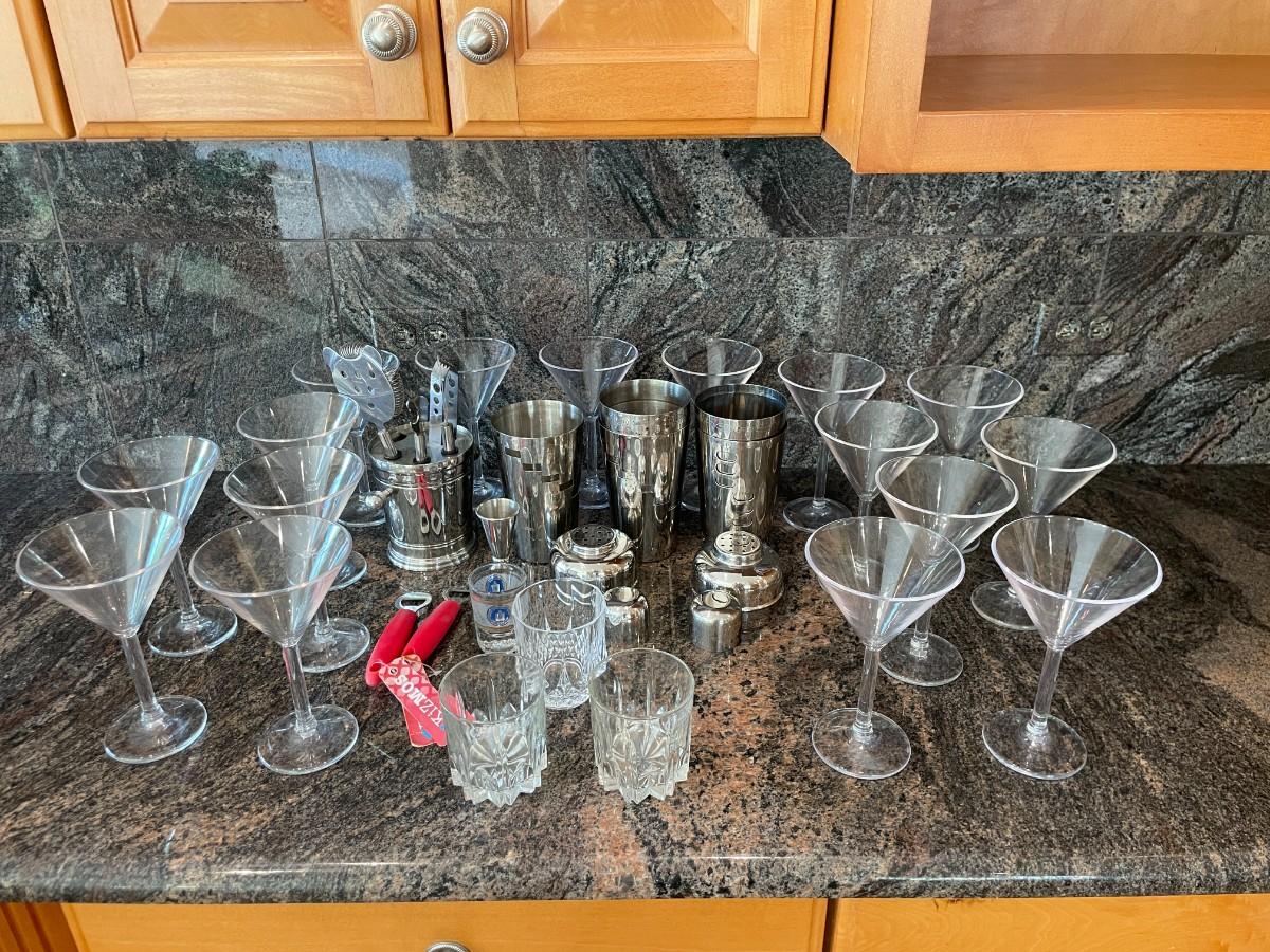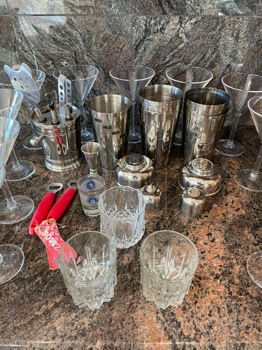 Lot includes Cocktail mixers, Assorted cocktail glasses etc.