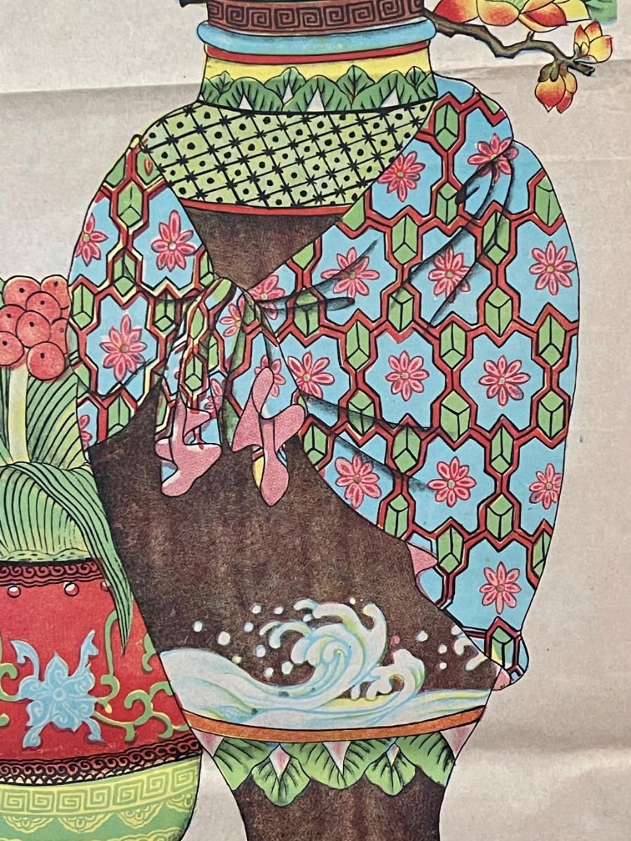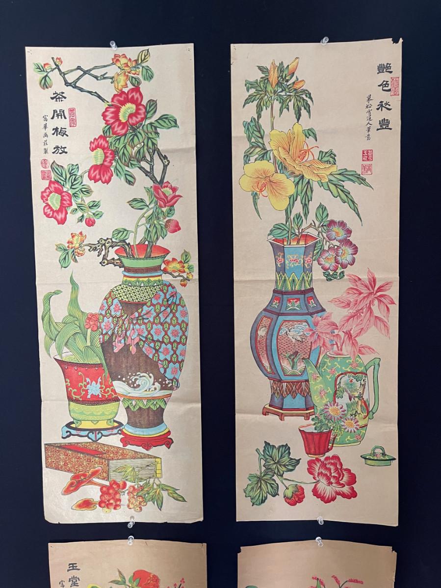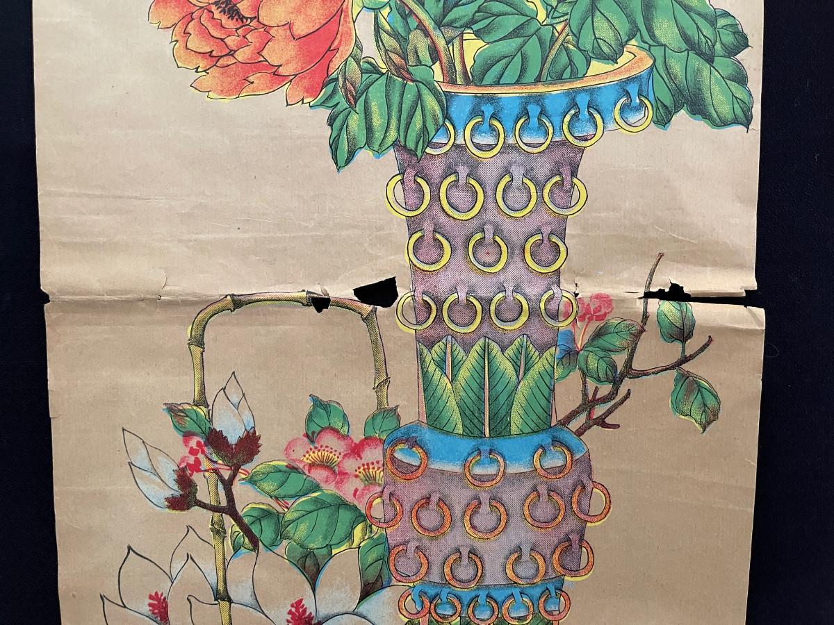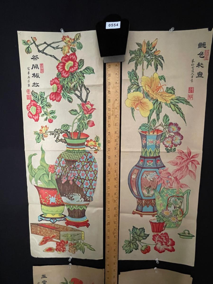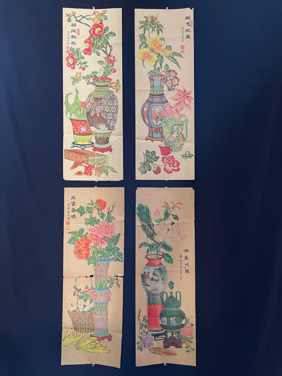 DESCRIPTION: This lot includes four vintage, colorfully printed paper panels, all printed with images of oriental potted floral arrangements with calligraphic text at the margins. All four should be considered in fragile condition.with folding separations to one panel. They would truly be beautiful as a framed set!