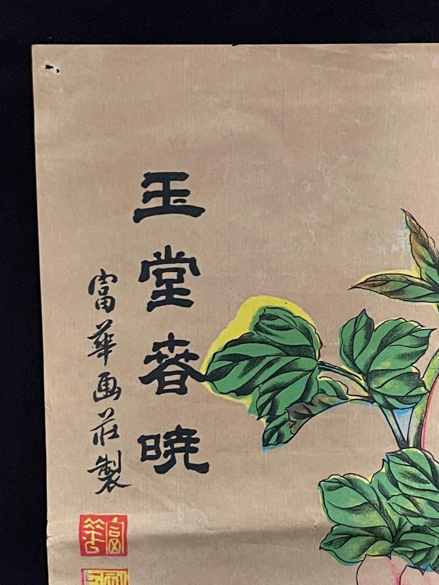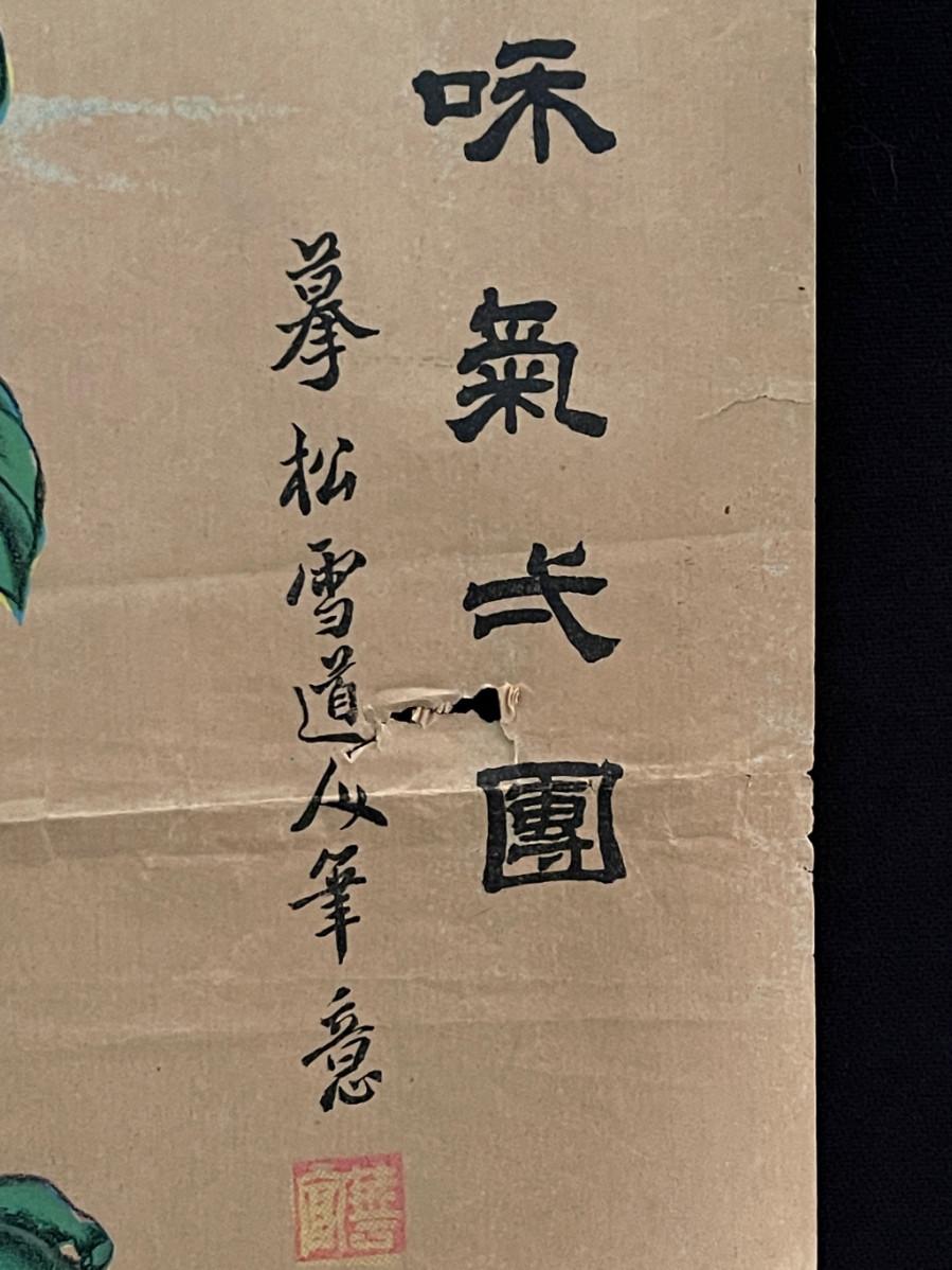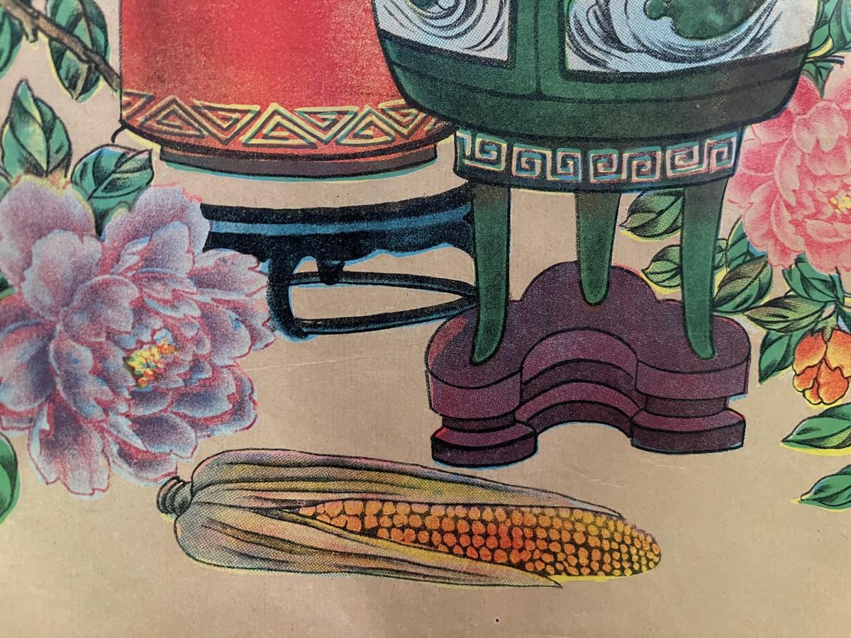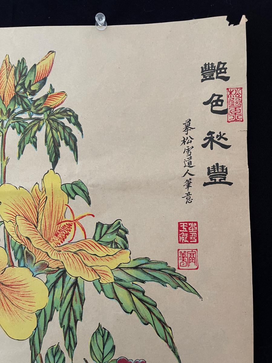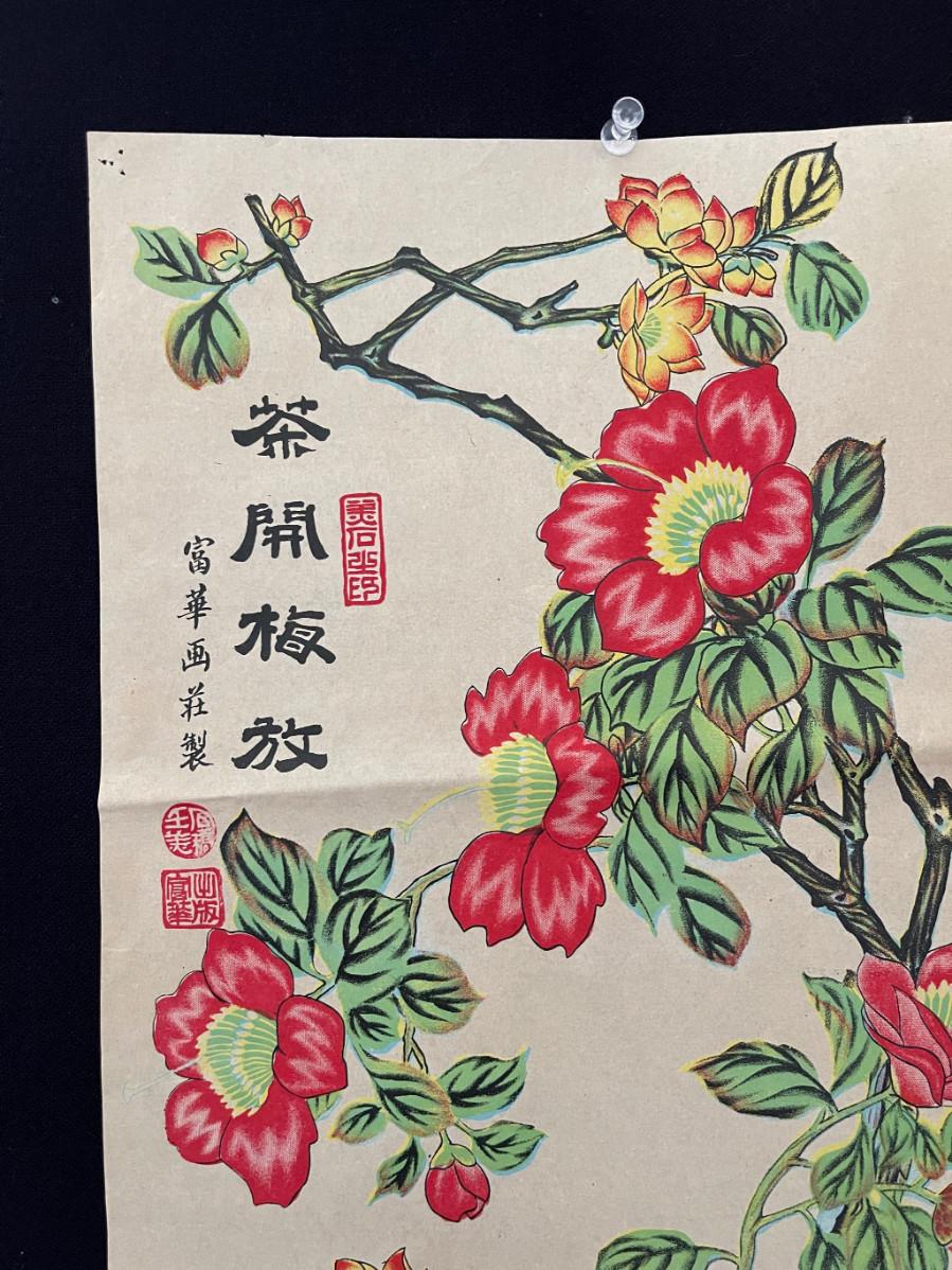 DESCRIPTION: This lot includes four vintage, colorfully printed paper panels, all printed with images of oriental potted floral arrangements with calligraphic text at the margins. All four should be considered in fragile condition.with folding separations to one panel. They would truly be beautiful as a framed set!