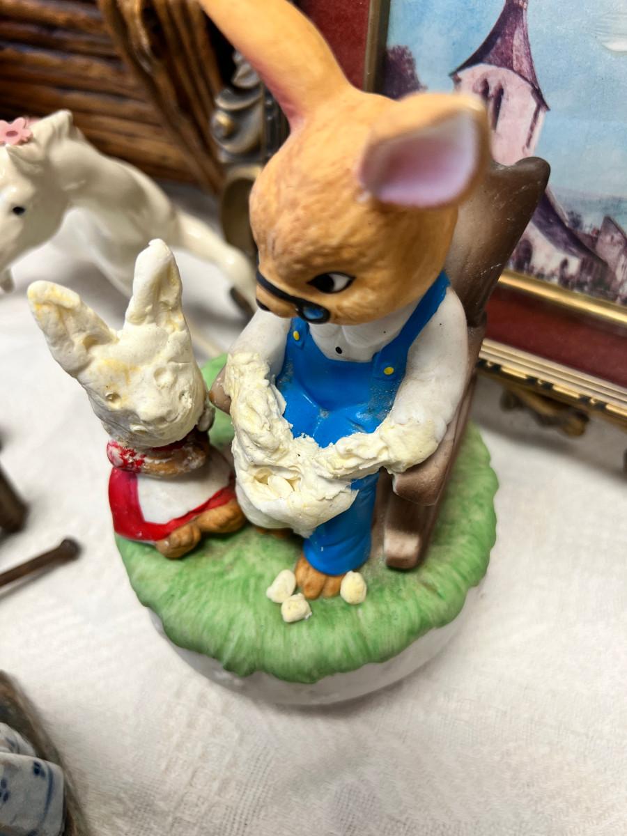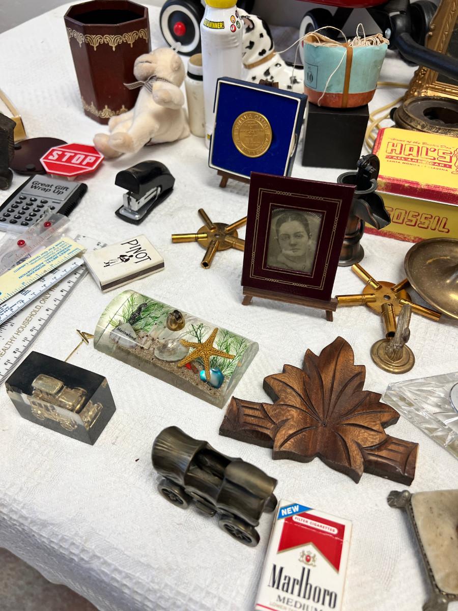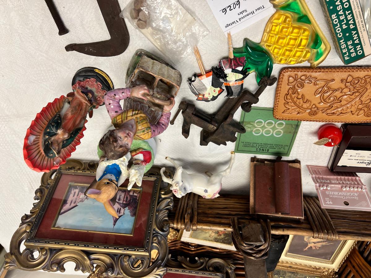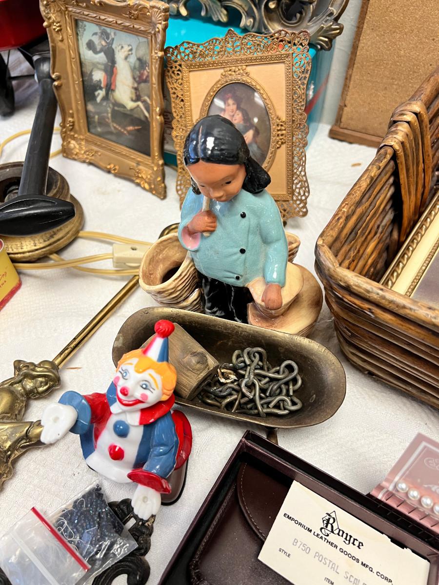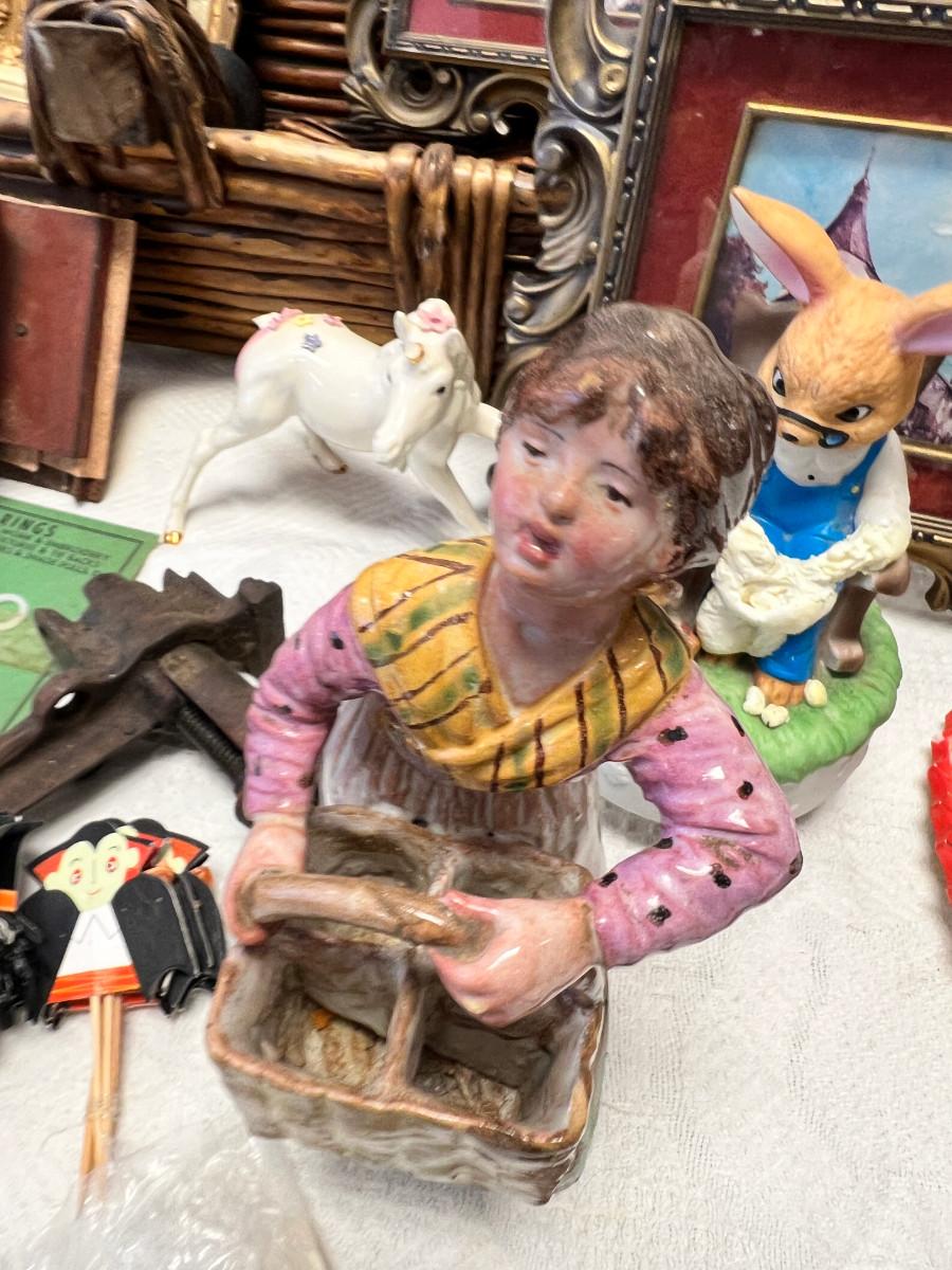 There are many great pieces, interesting smalls, figurines, collectibles and a whole lot of fun and inspiration..There may be chips, dents, incomplete, dirt, stains and wear. There is a collection of inkwells, novelty pencil sharpeners (copper) Vintage items, some from my craft pile. There is a unicorn I was meaning to fix, and a nusic box that needs painting.