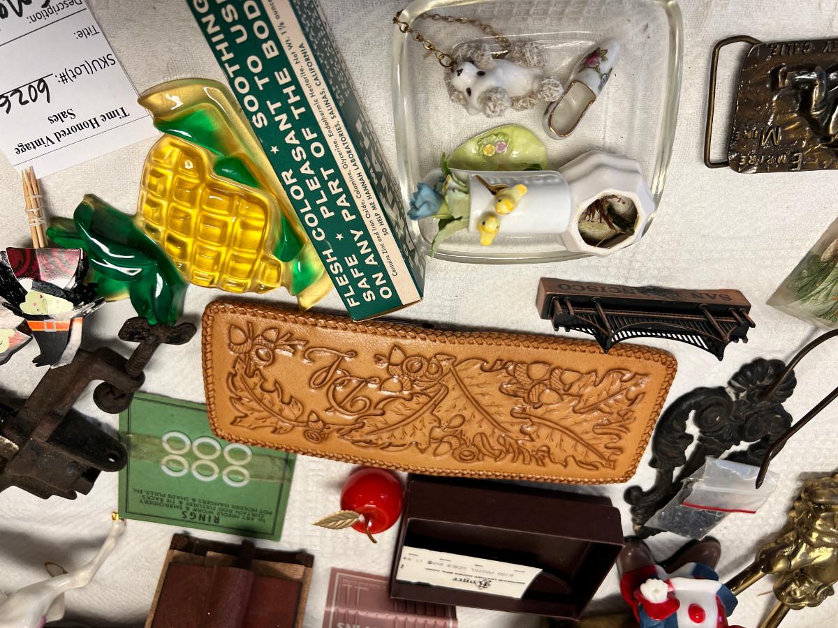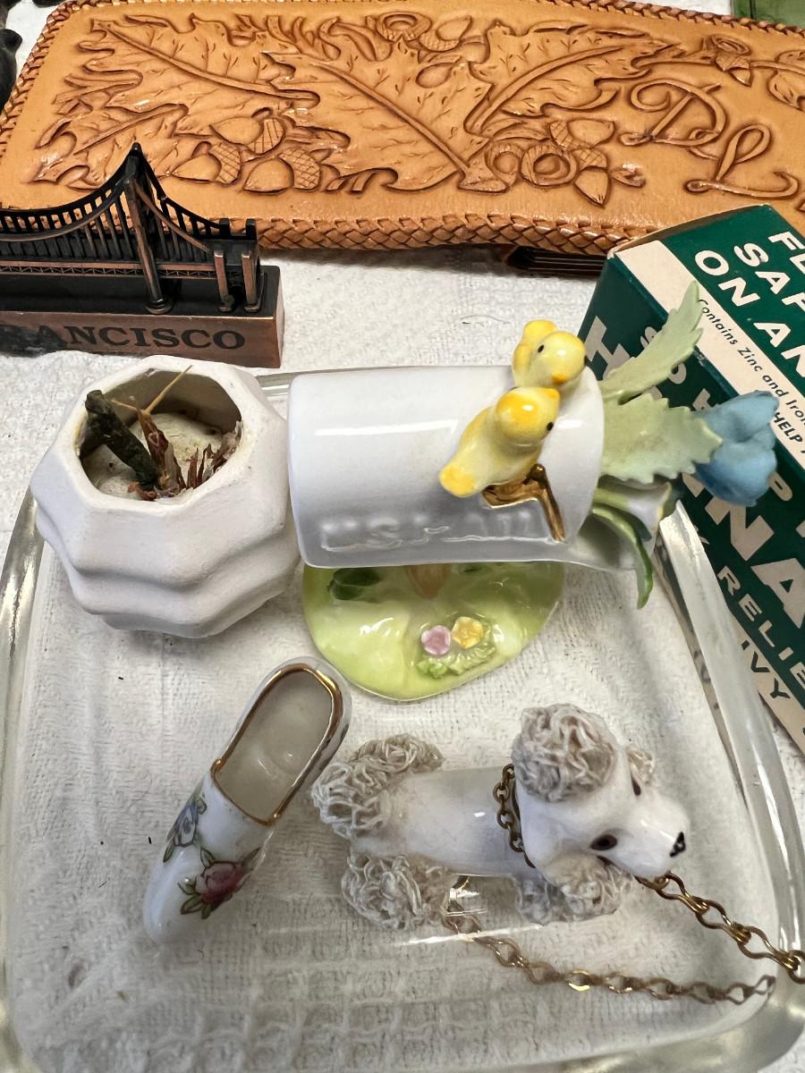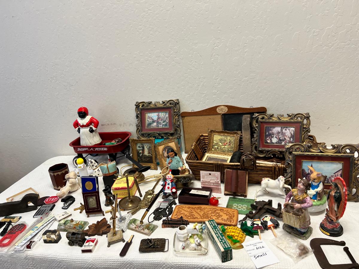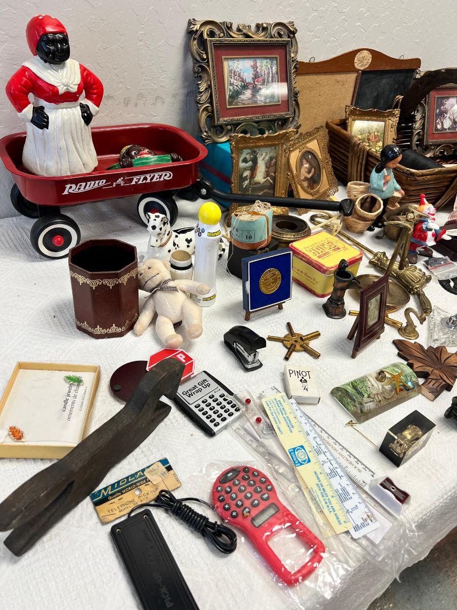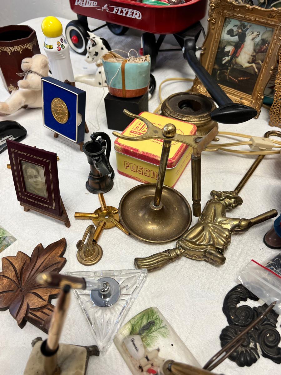 There are many great pieces, interesting smalls, figurines, collectibles and a whole lot of fun and inspiration..There may be chips, dents, incomplete, dirt, stains and wear. There is a collection of inkwells, novelty pencil sharpeners (copper) Vintage items, some from my craft pile. There is a unicorn I was meaning to fix, and a nusic box that needs painting.