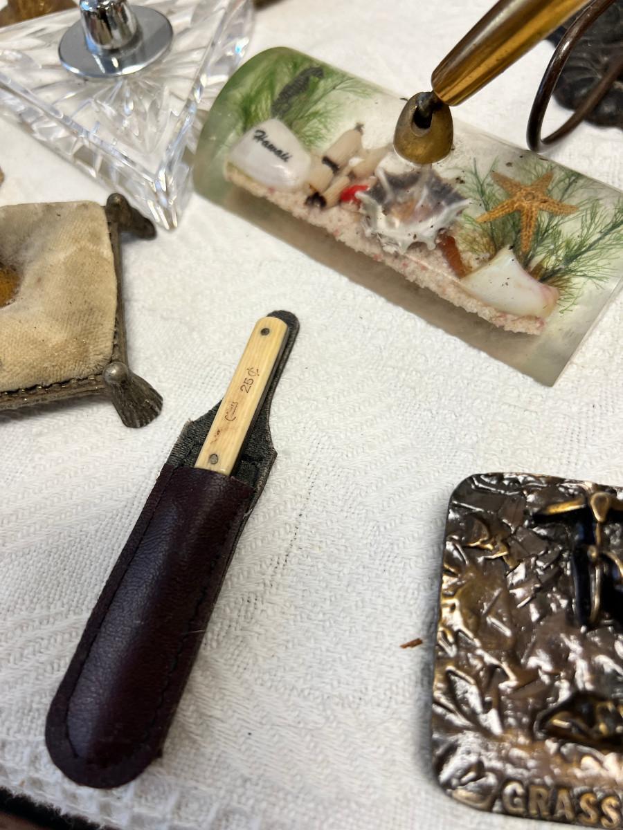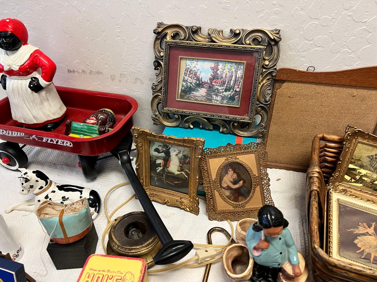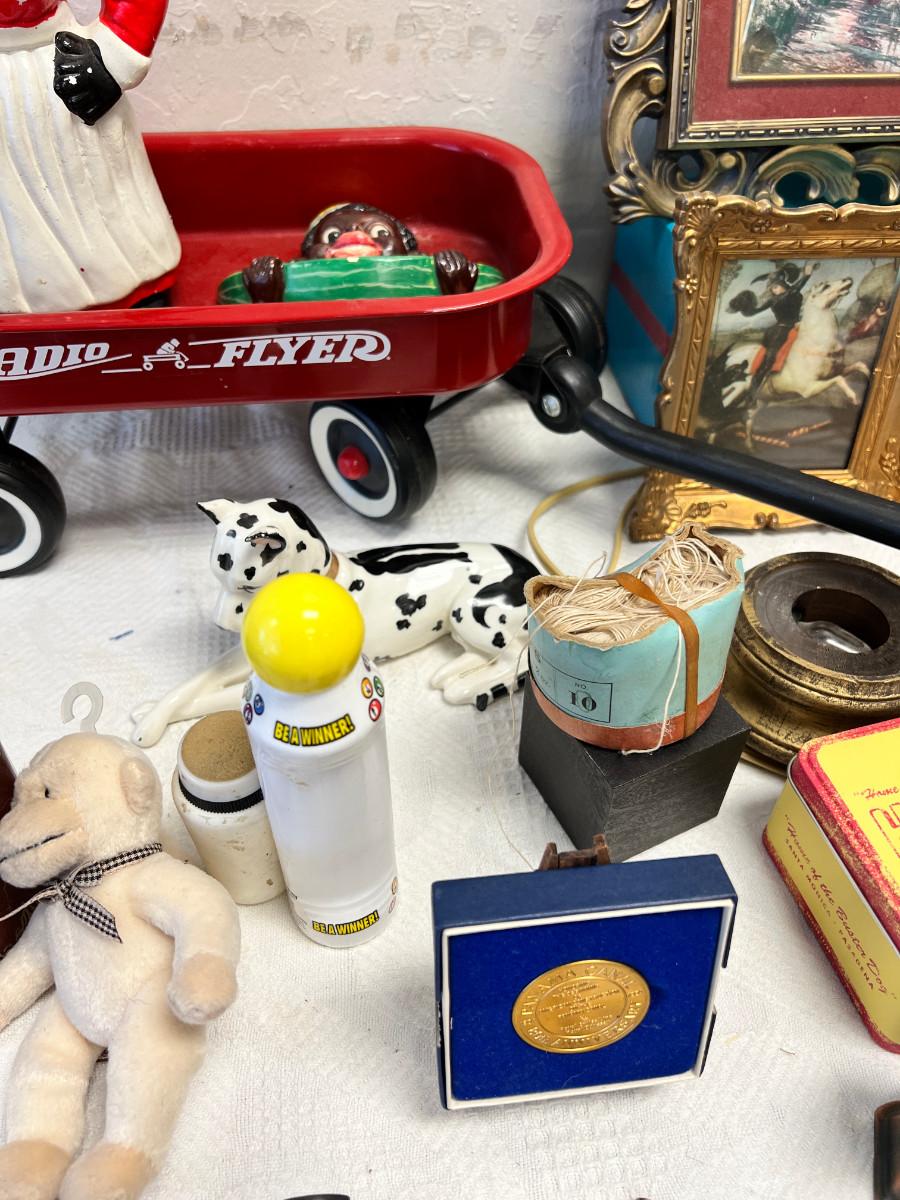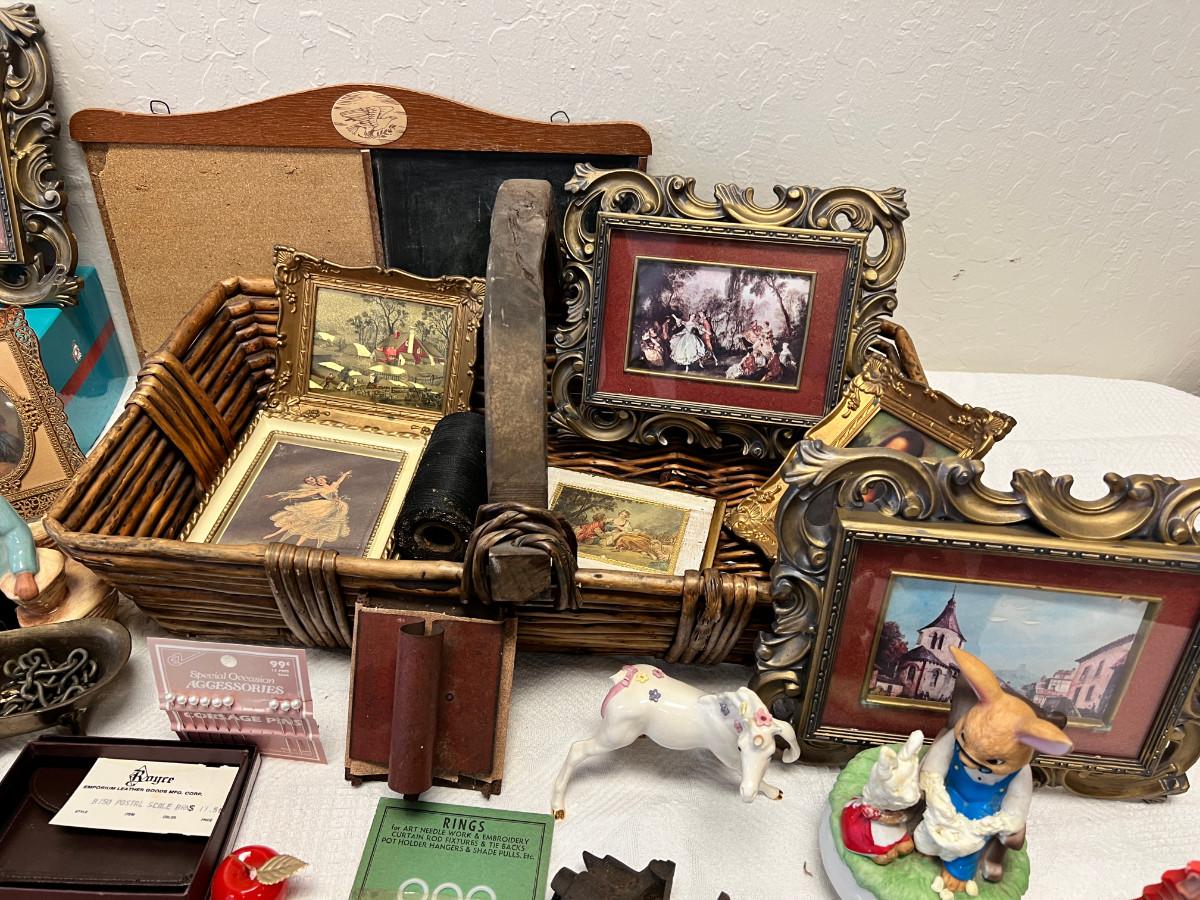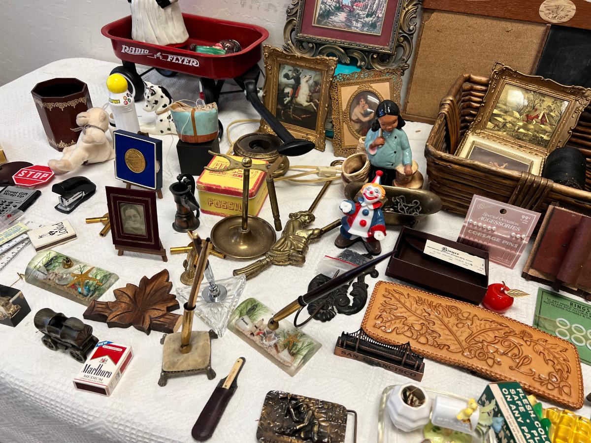 There are many great pieces, interesting smalls, figurines, collectibles and a whole lot of fun and inspiration..There may be chips, dents, incomplete, dirt, stains and wear. There is a collection of inkwells, novelty pencil sharpeners (copper) Vintage items, some from my craft pile. There is a unicorn I was meaning to fix, and a nusic box that needs painting.
