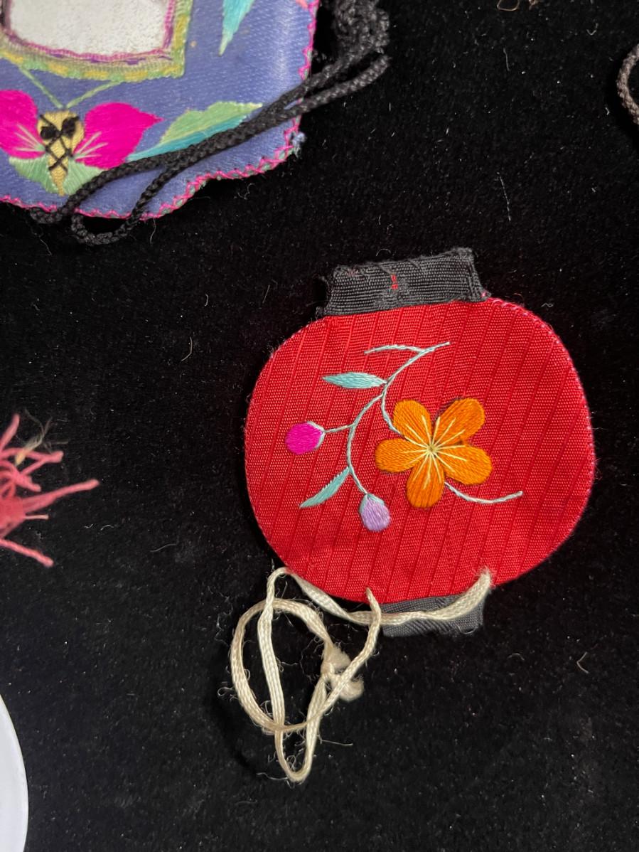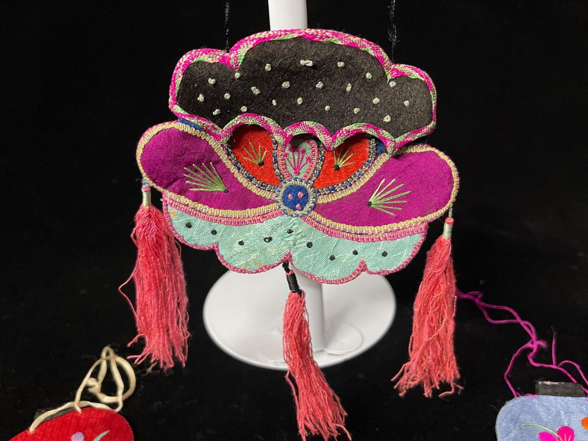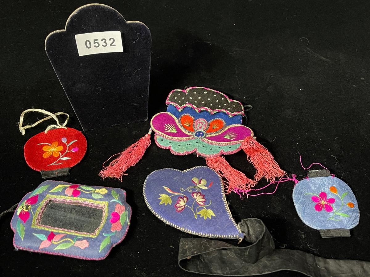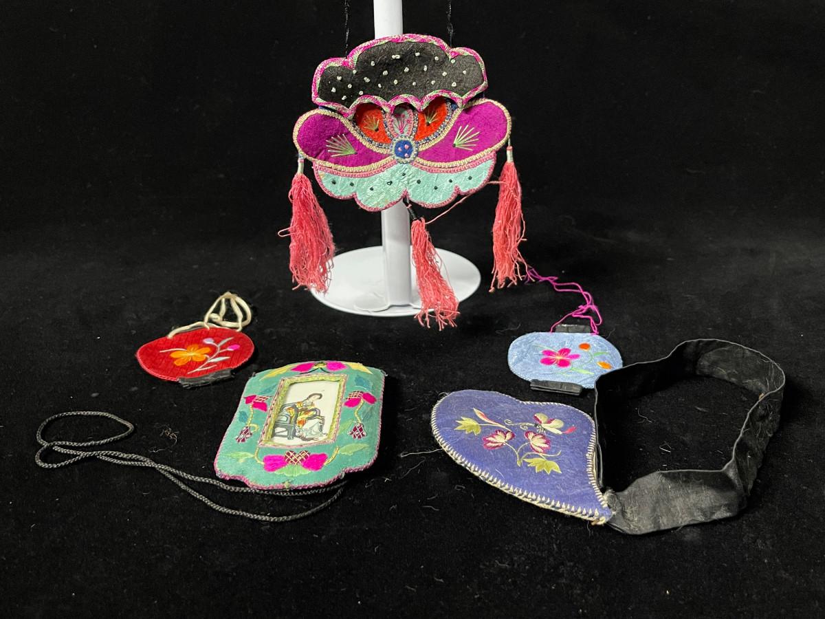 DESCRIPTION: This lot is made up of five embroidered costume accessories including a tassled purse, small hand mirror set into a cloth frame, 2 lantern ornaments