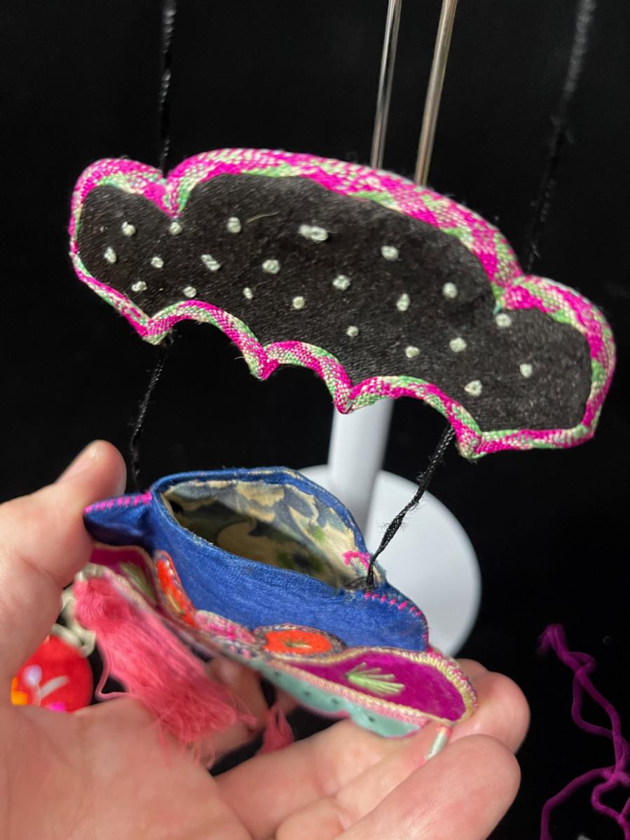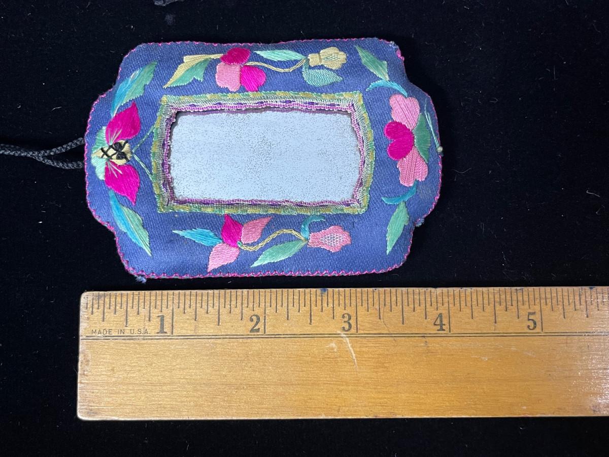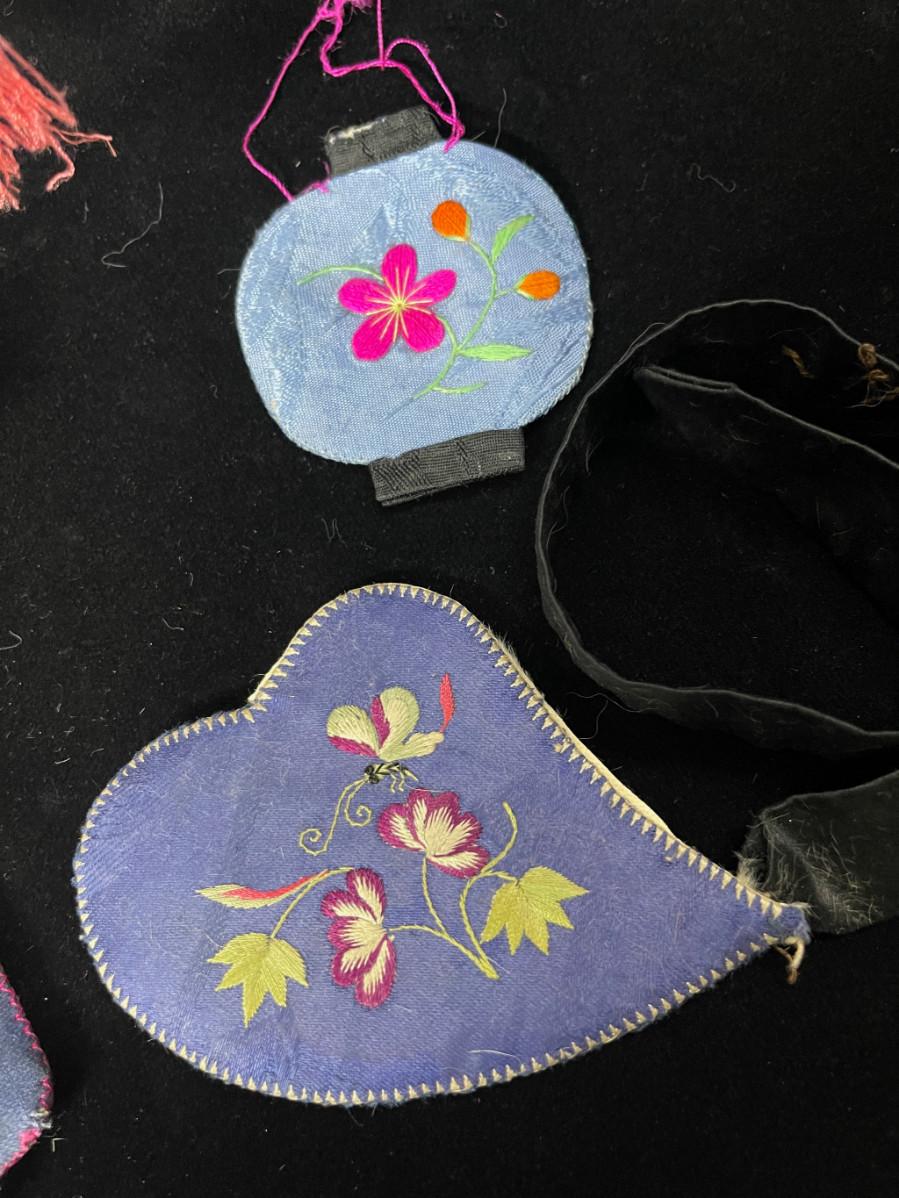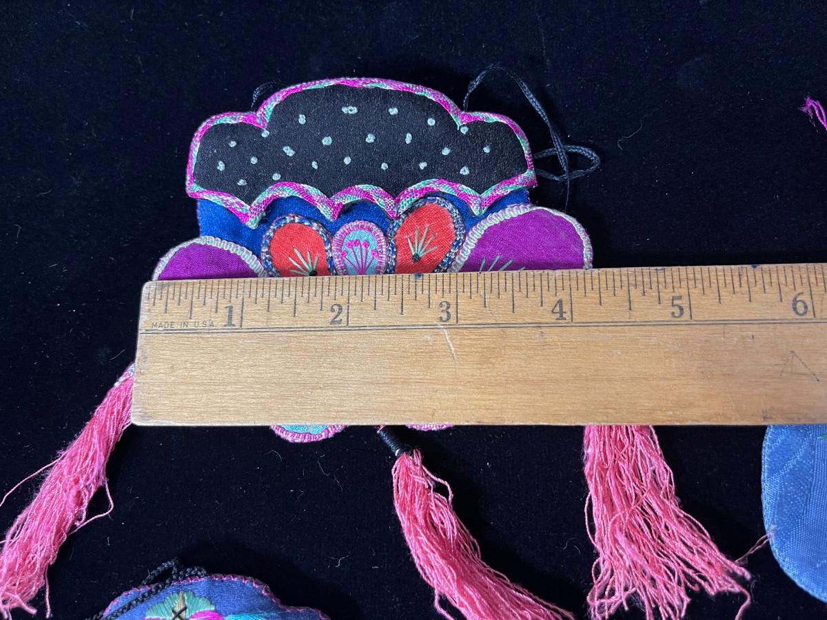 DESCRIPTION: This lot is made up of five embroidered costume accessories including a tassled purse, small hand mirror set into a cloth frame, 2 lantern ornaments