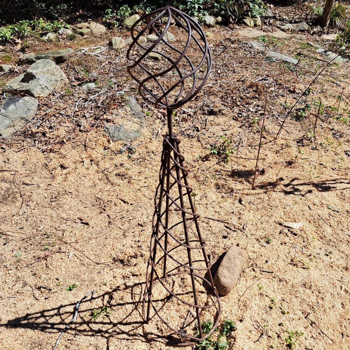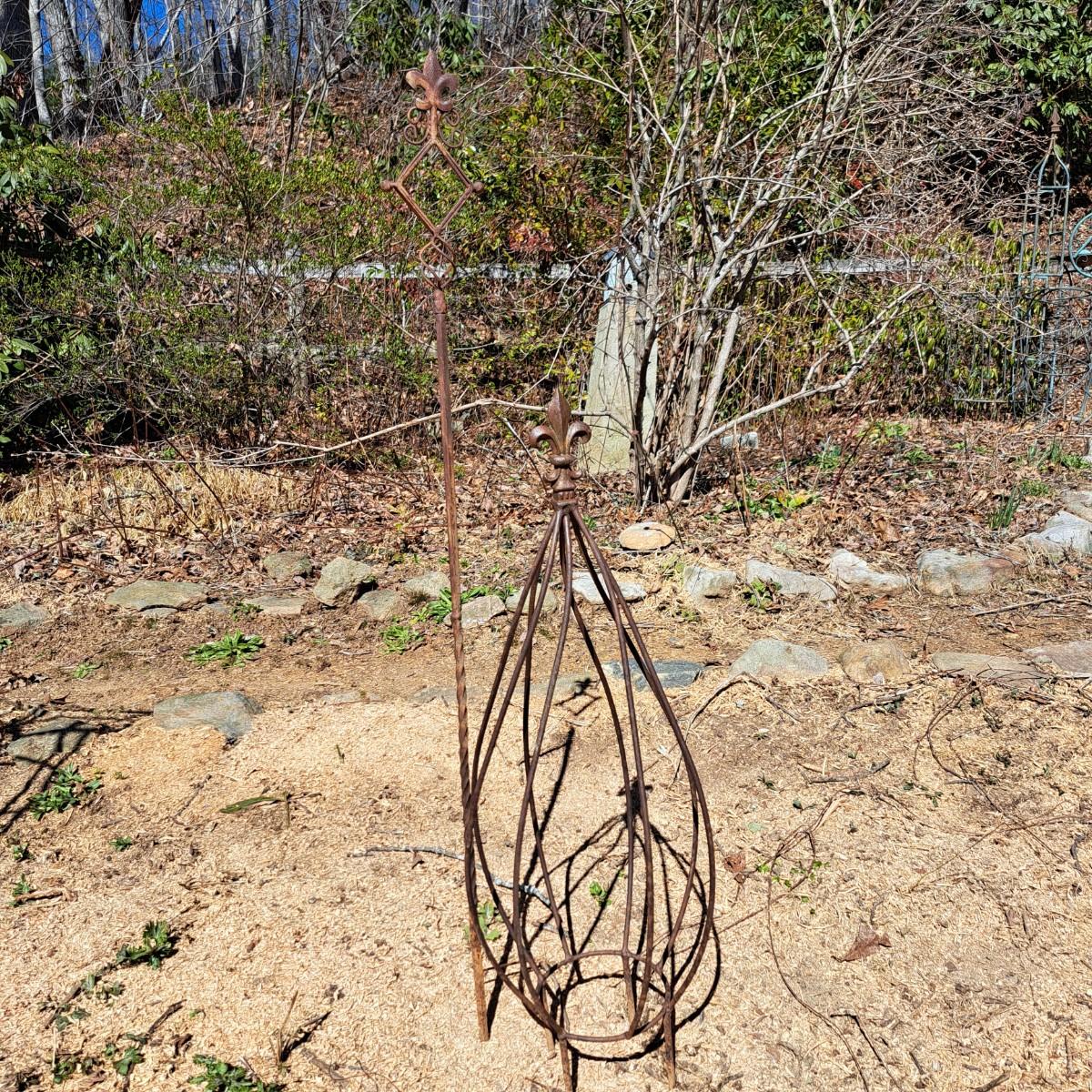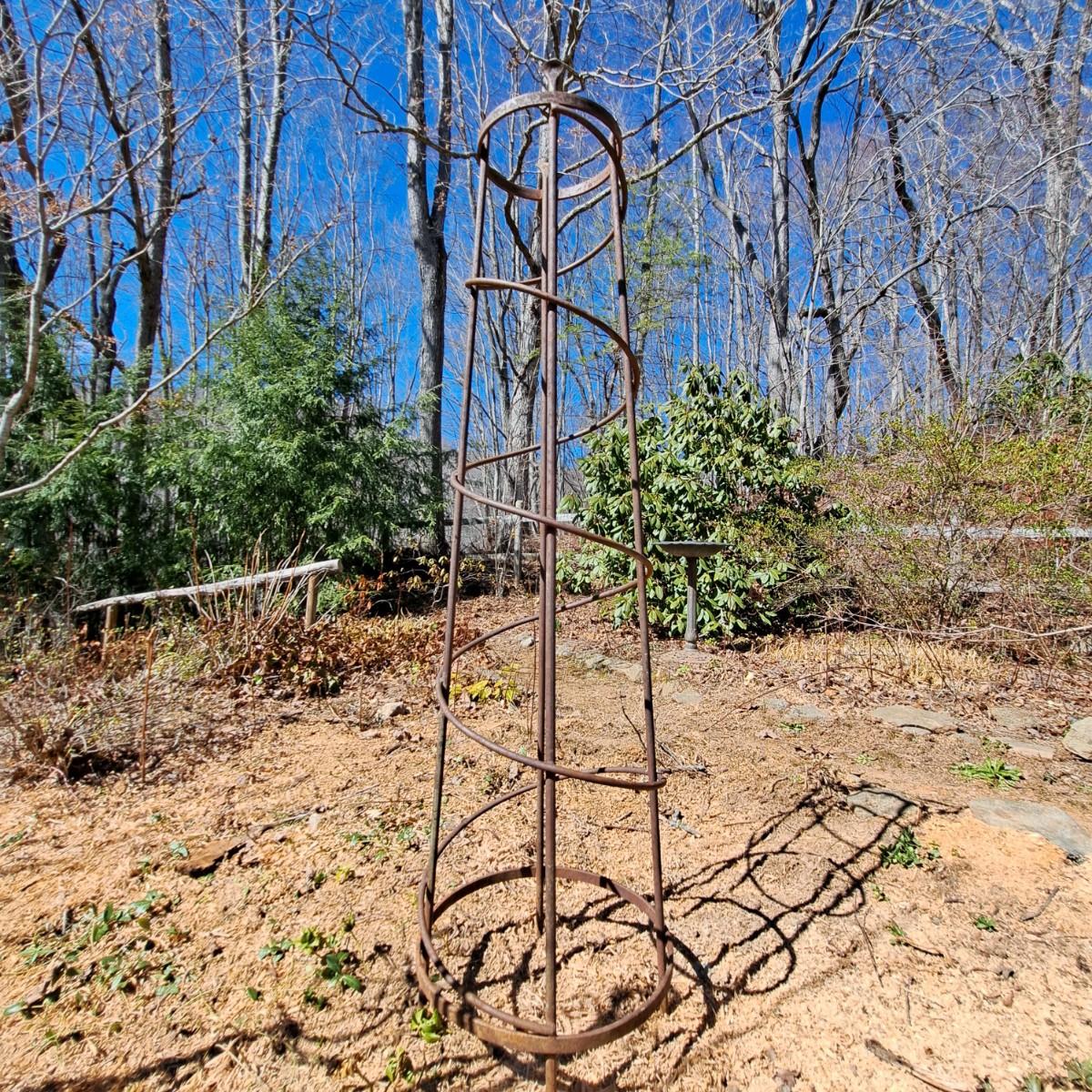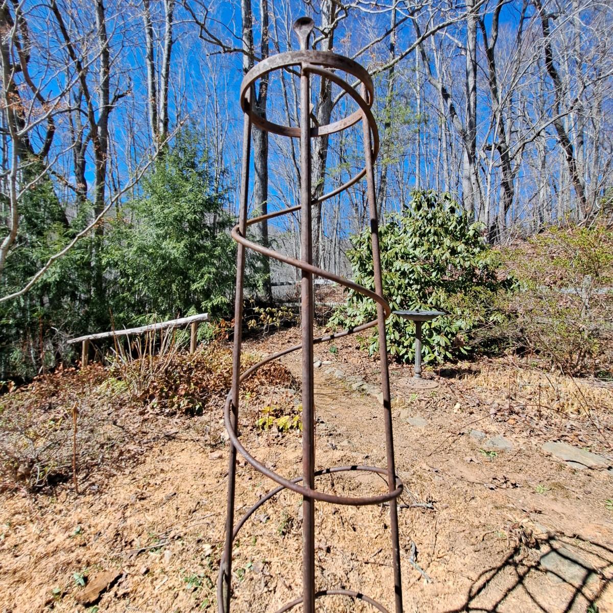 There are nine of these fabulous rusted metal garden topiaries, most made to be staked into the ground, ranging in size from to 18"H to 55." The tallest tower metal topiary has outstretched arms ready to hold a potted plant or gazing ball. Local pickup only.