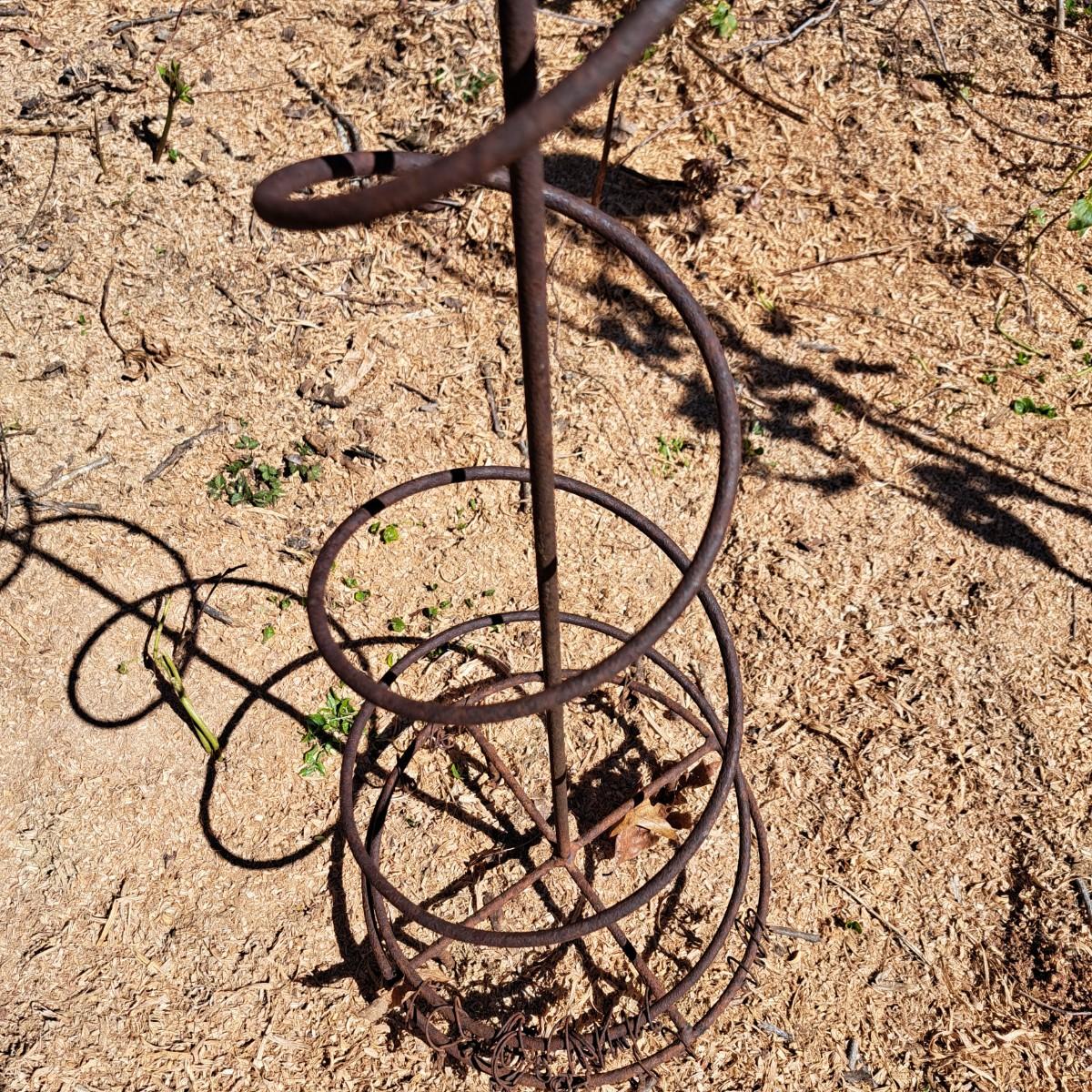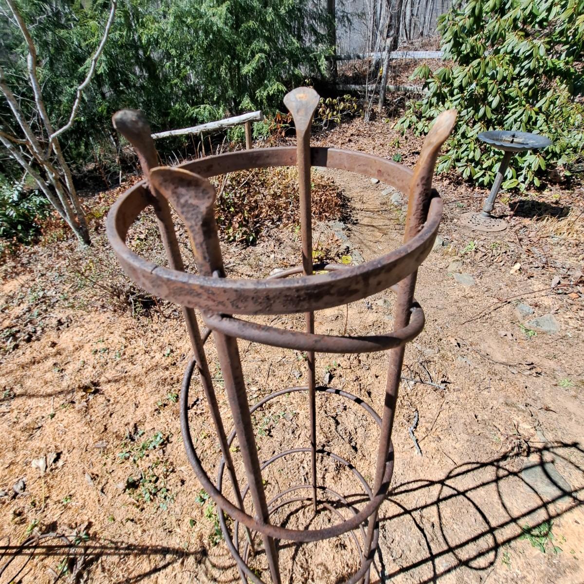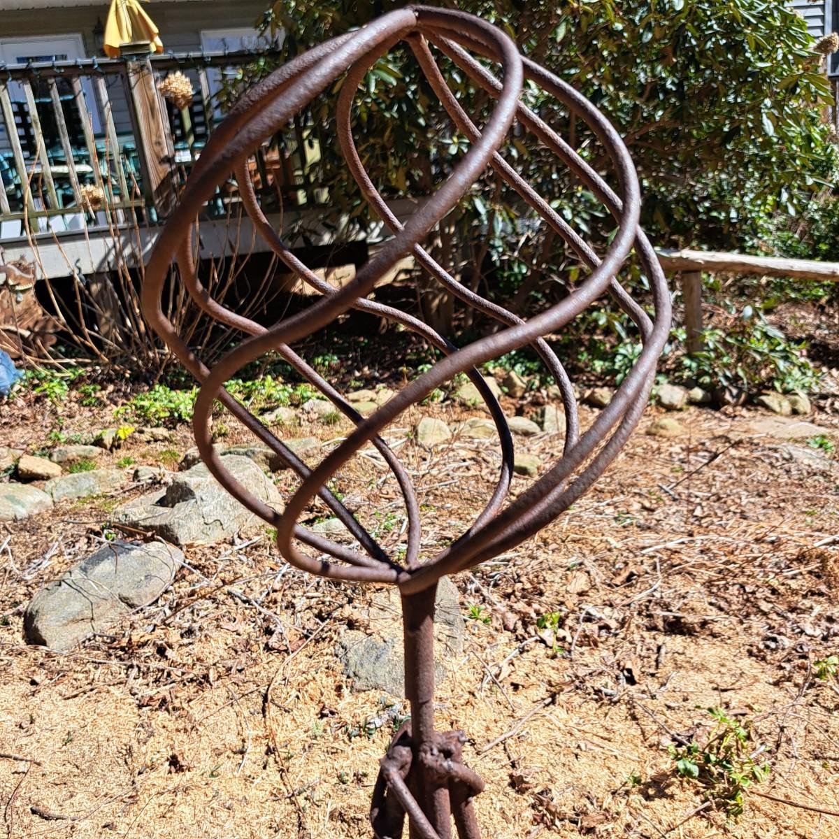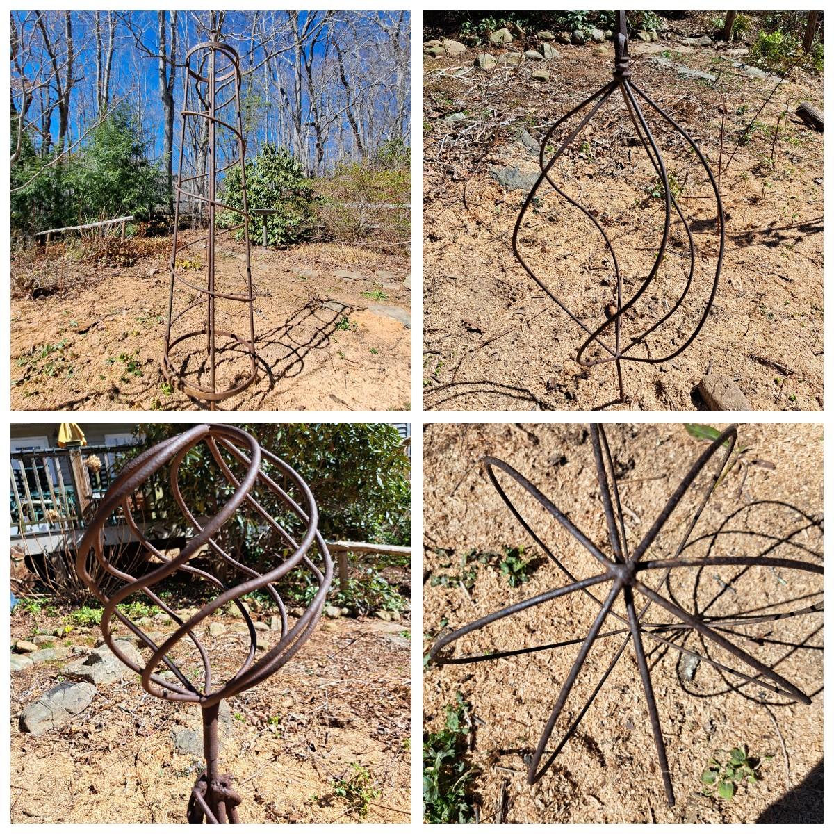 There are nine of these fabulous rusted metal garden topiaries, most made to be staked into the ground, ranging in size from to 18"H to 55." The tallest tower metal topiary has outstretched arms ready to hold a potted plant or gazing ball. Local pickup only.