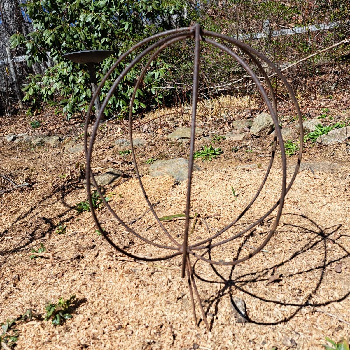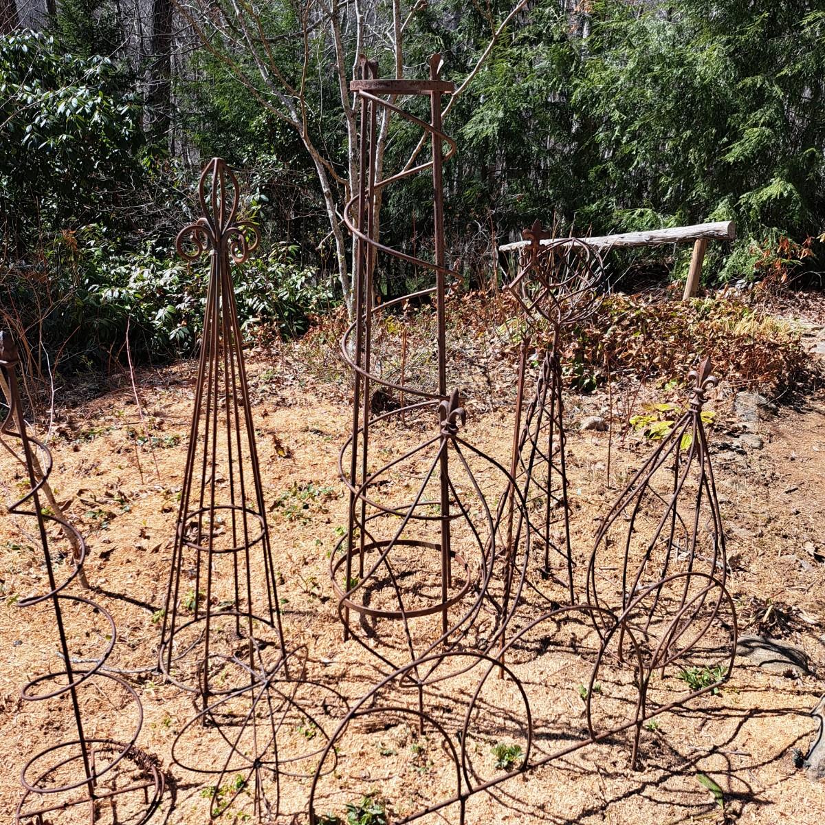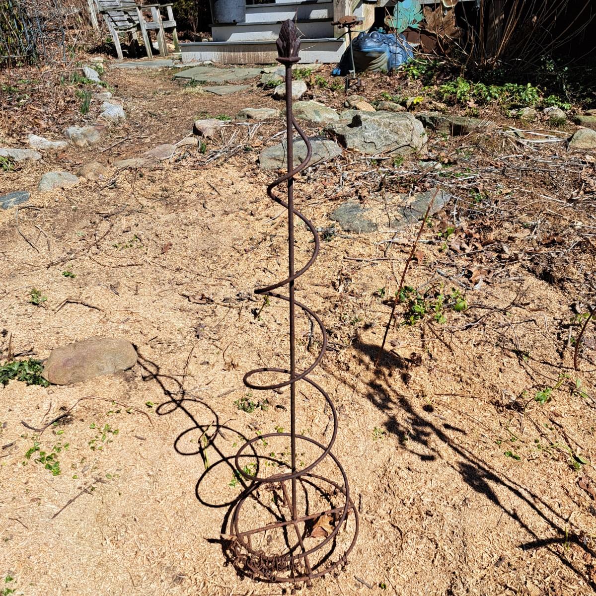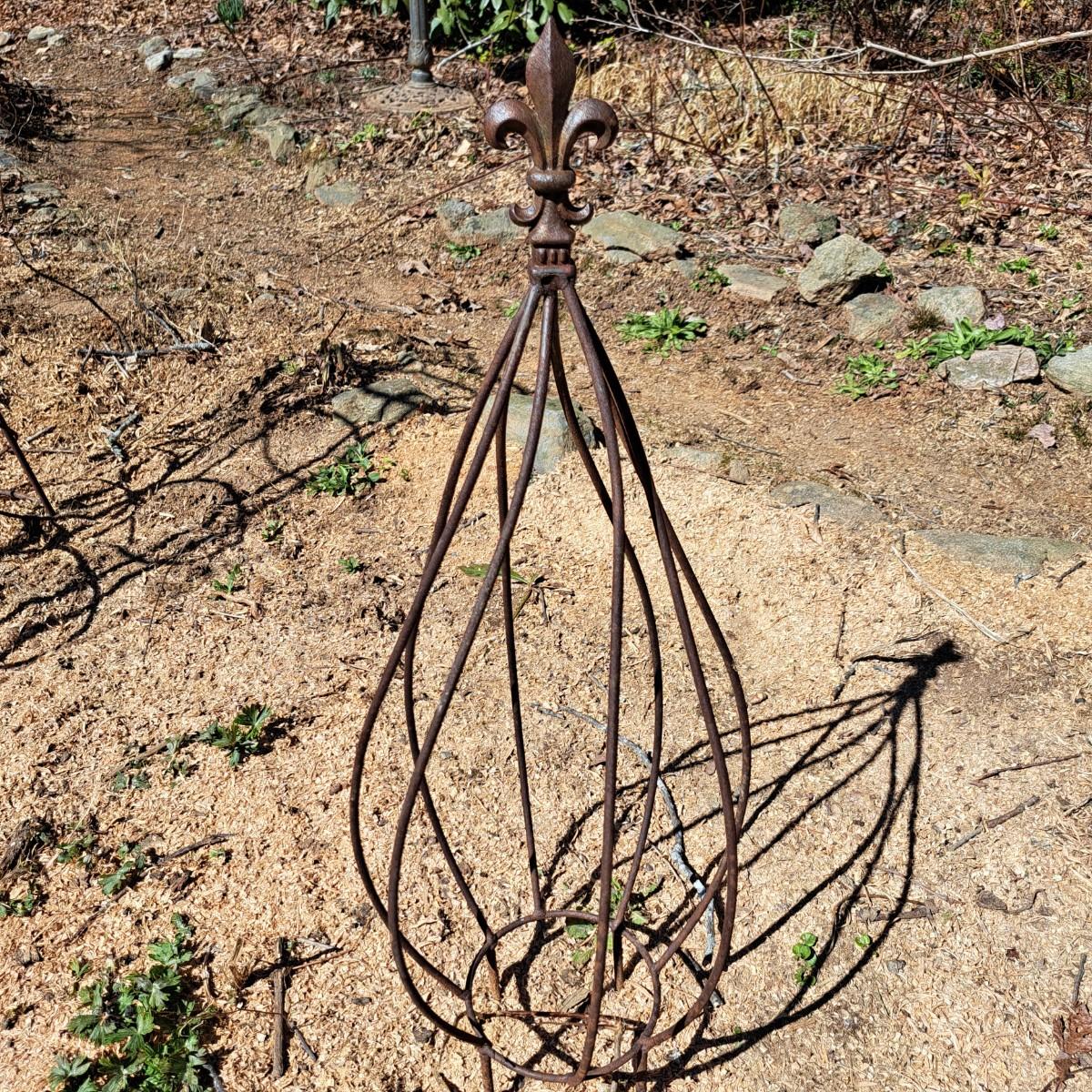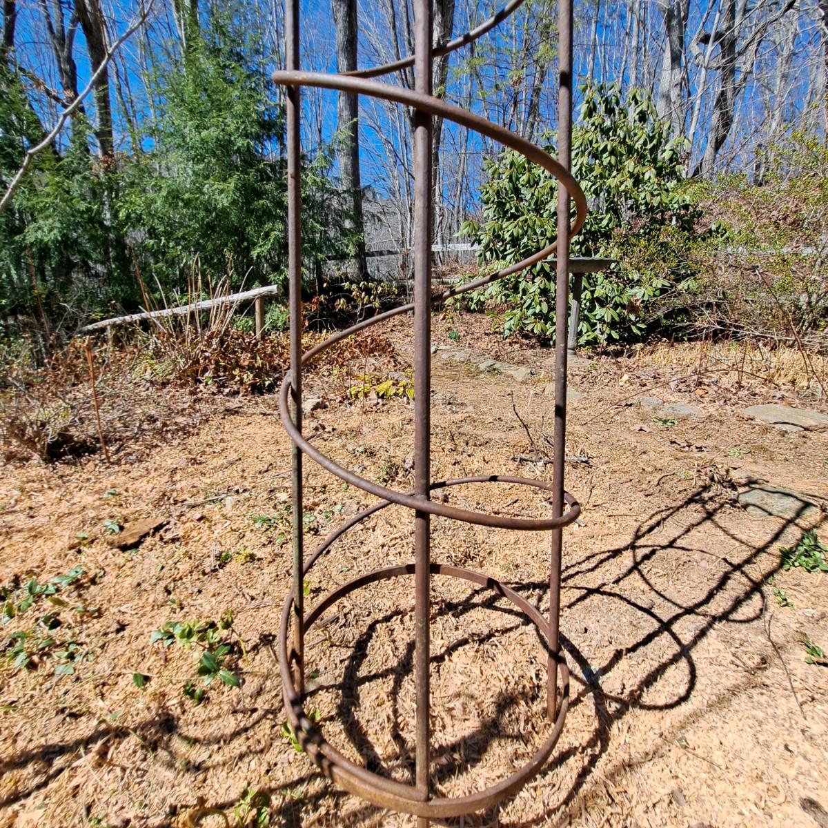 There are nine of these fabulous rusted metal garden topiaries, most made to be staked into the ground, ranging in size from to 18"H to 55." The tallest tower metal topiary has outstretched arms ready to hold a potted plant or gazing ball. Local pickup only.