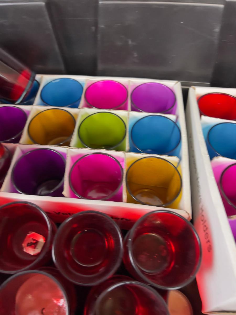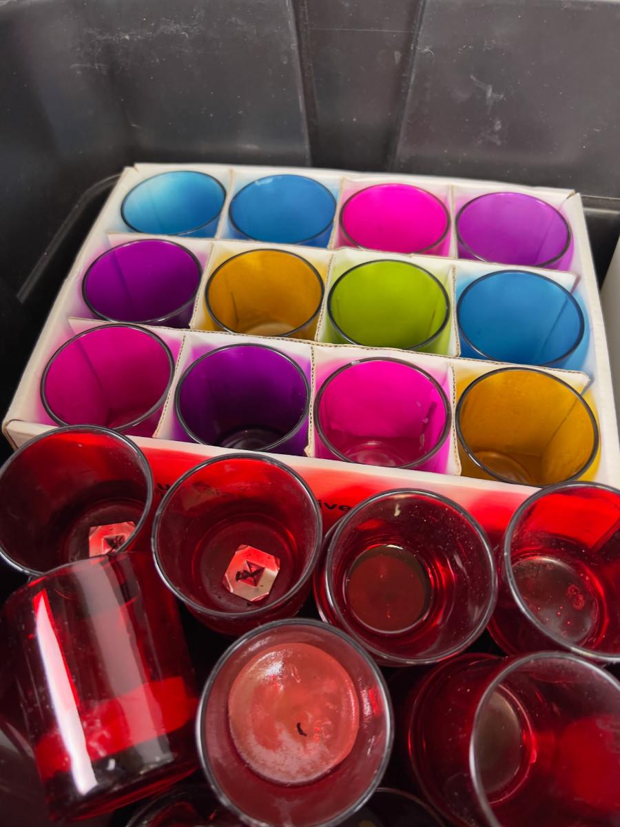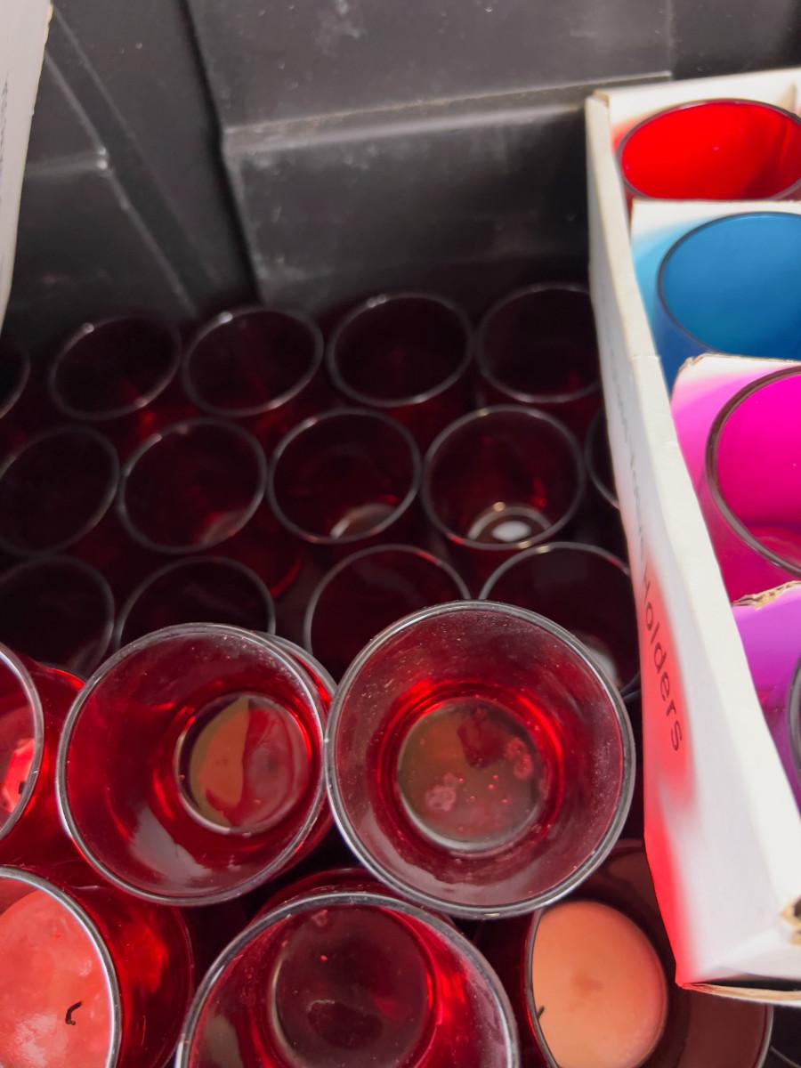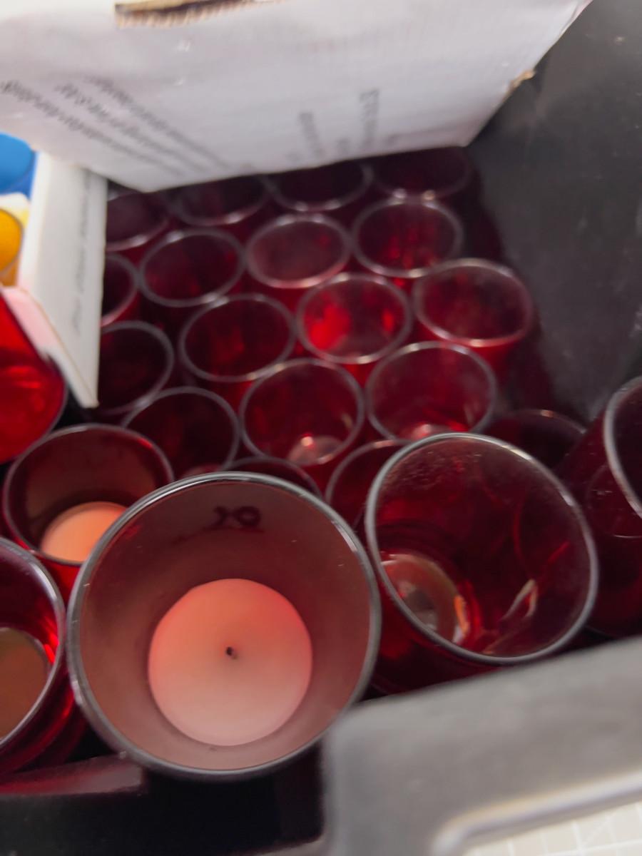 Mostly Red. Used. Some Candles. All Glass. Tub Included.