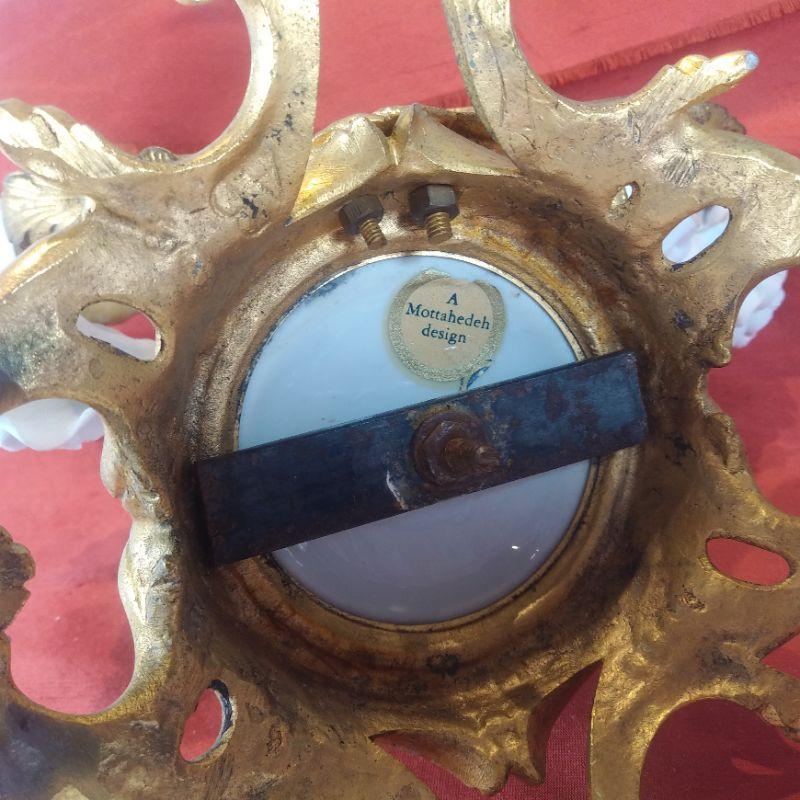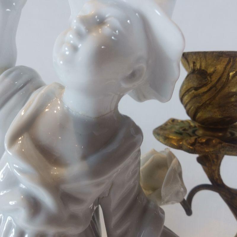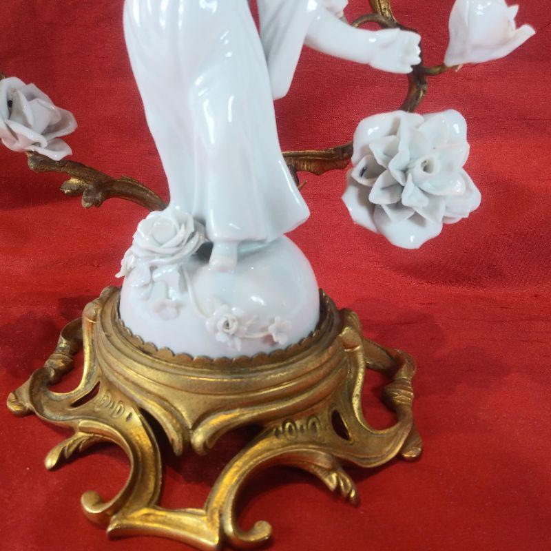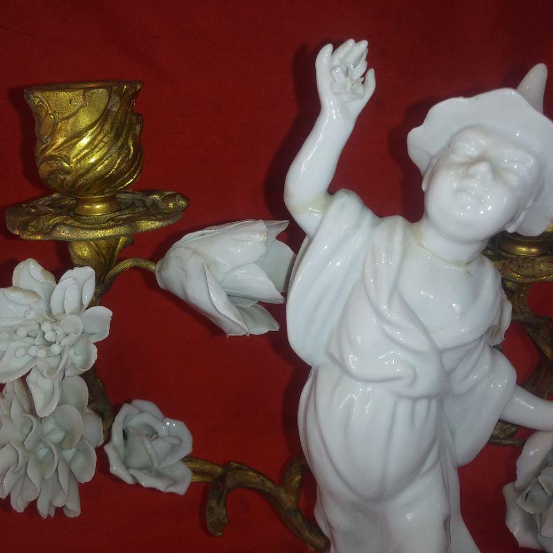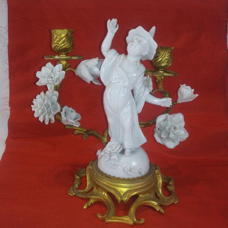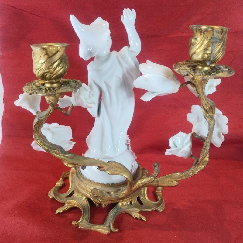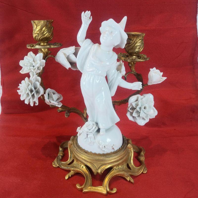 This offering is for a beautiful porcelain Chinese Dancer Among the Flowers candle sconce. See pictures for detail and how wonderfully it sits upon the molded metal stand. I does have a few repair seams that I didn't even see until I started taking the photos. A few finger tips are missing consistent with age and use but overall very nice. It is 9-inches tall X 8 1/2-inches wide X 6-inches deep. A very handsome piece.