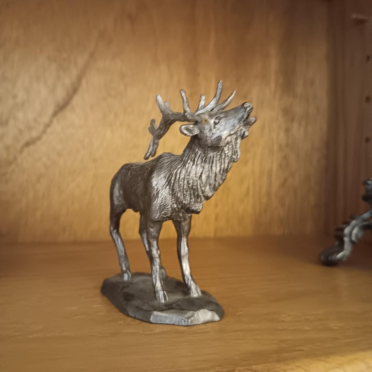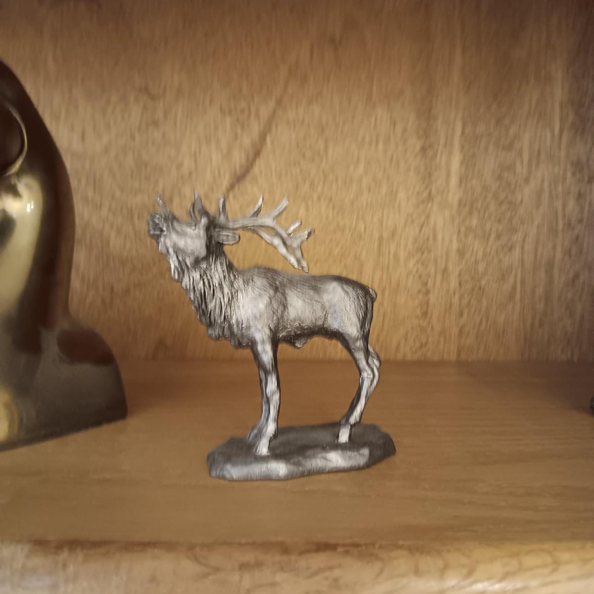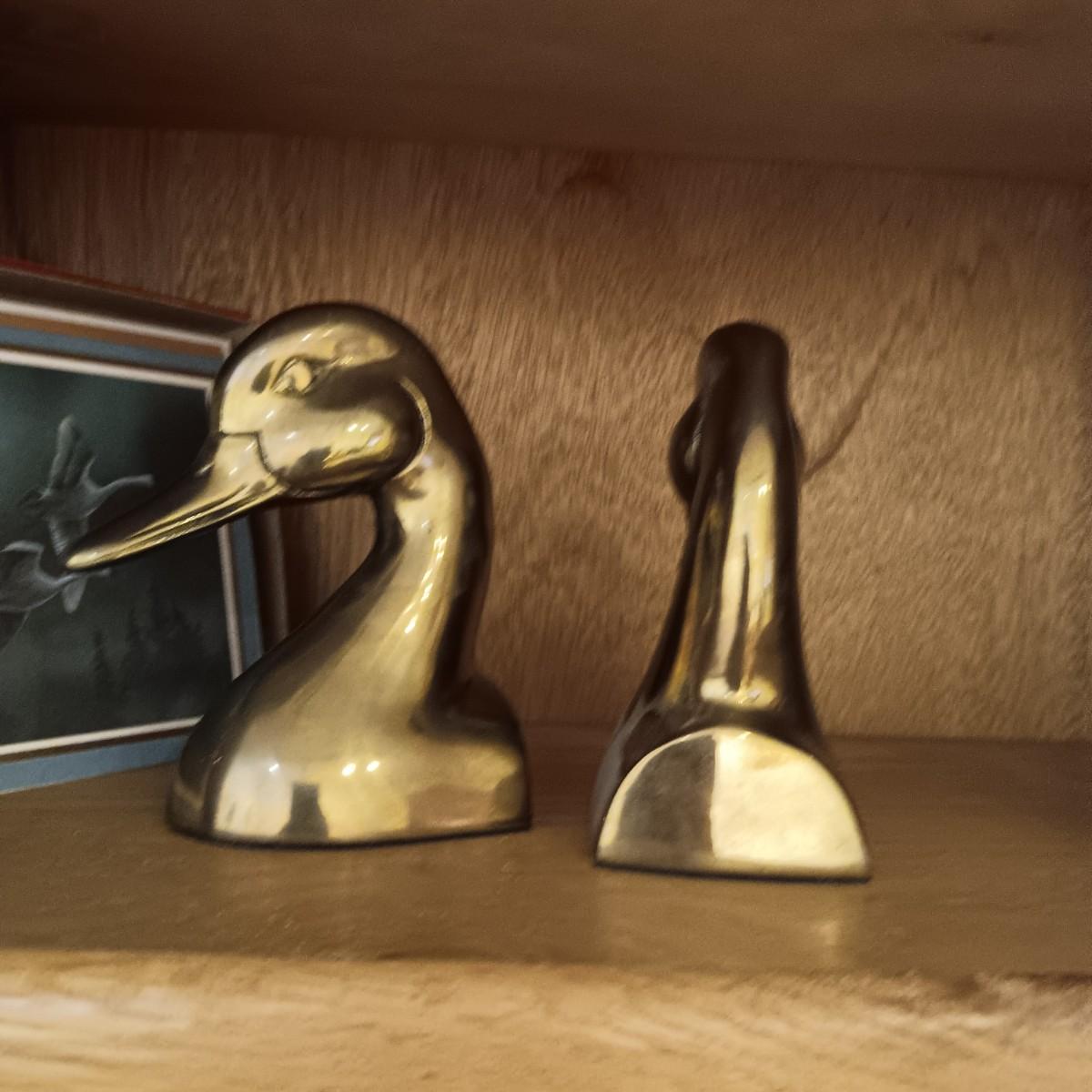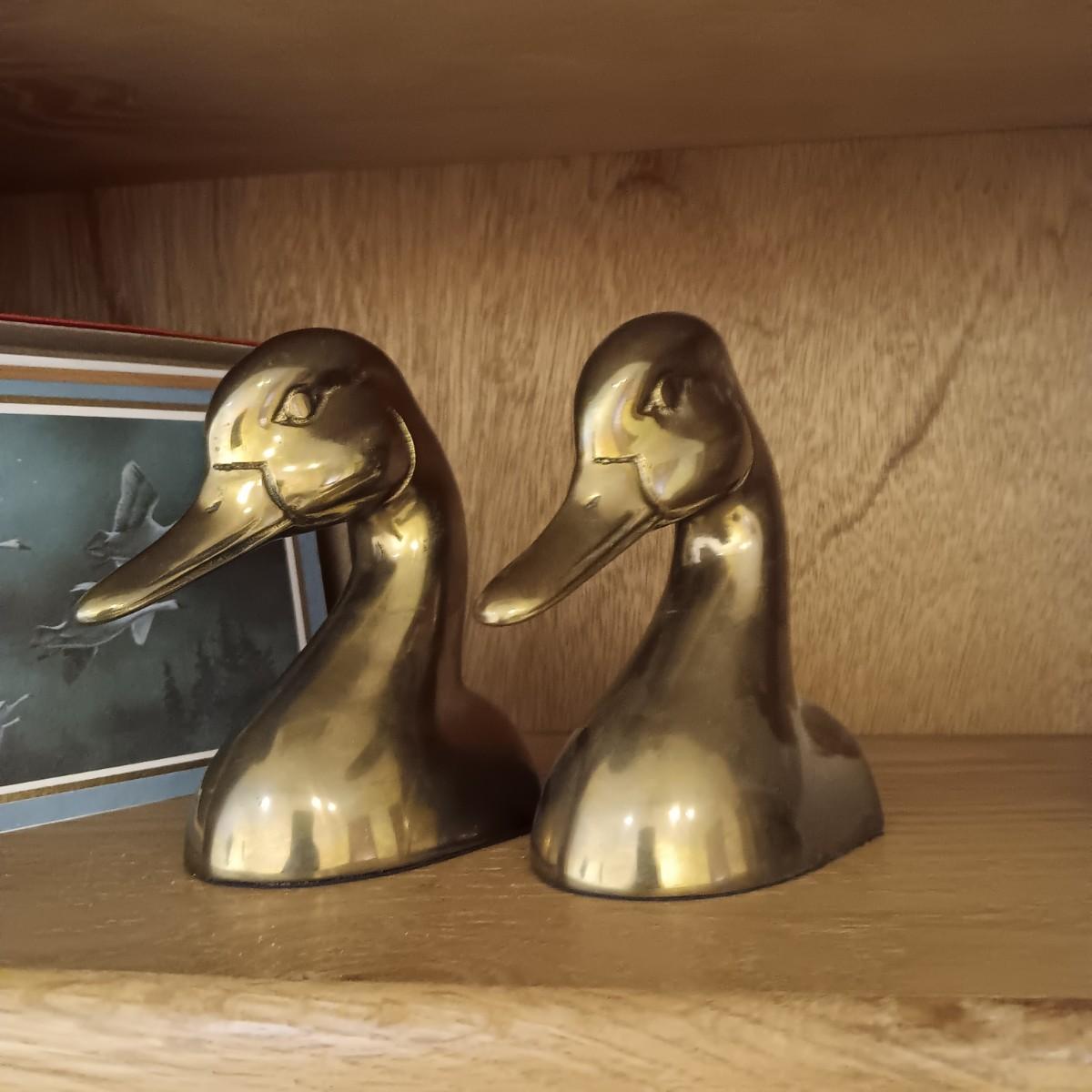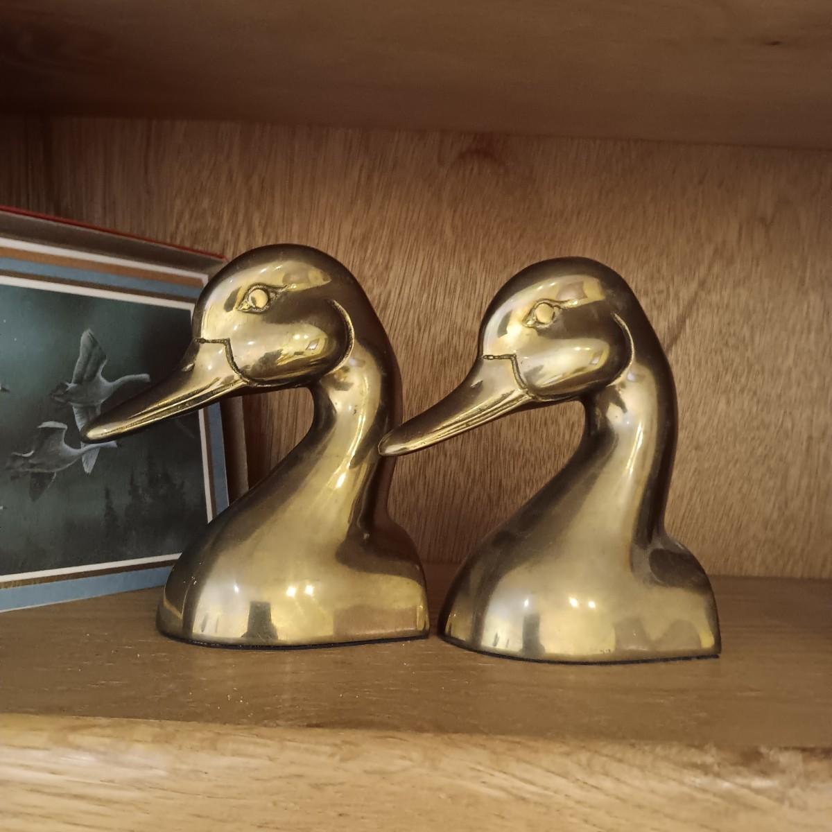 A PAIR OF BRASS DUCK HEAD BOOKENDS AN A PEWTER ELK