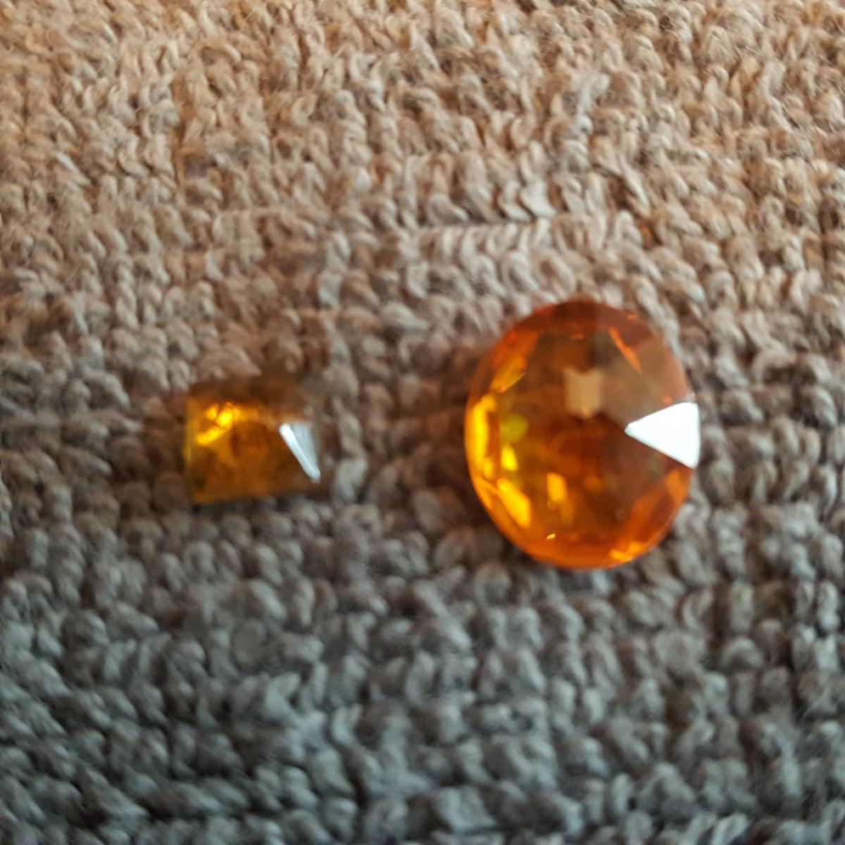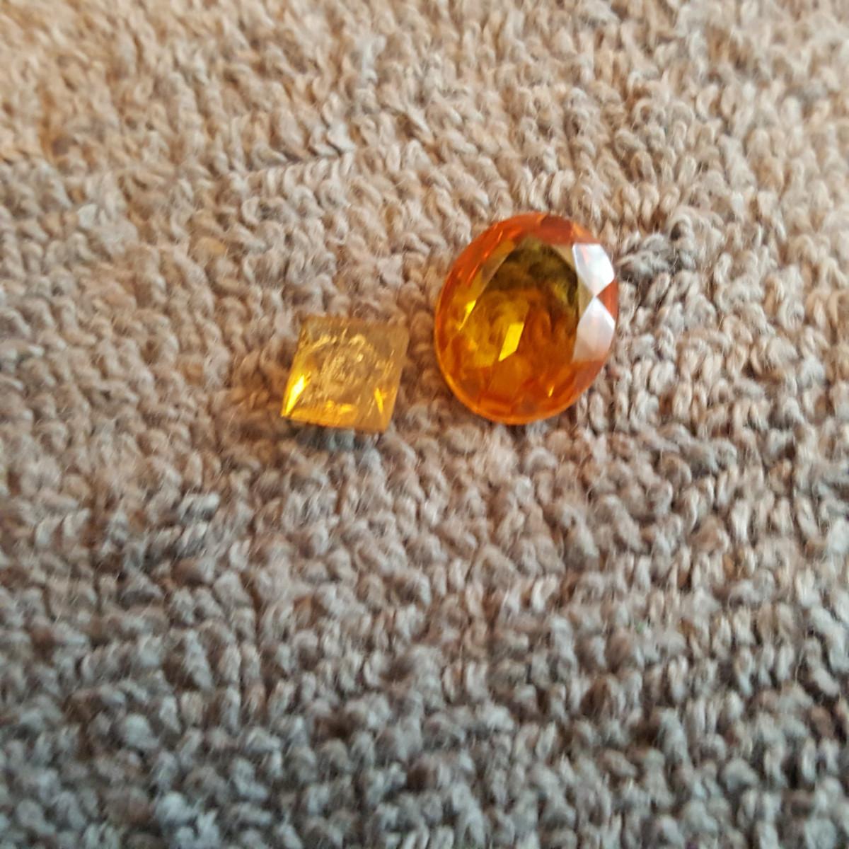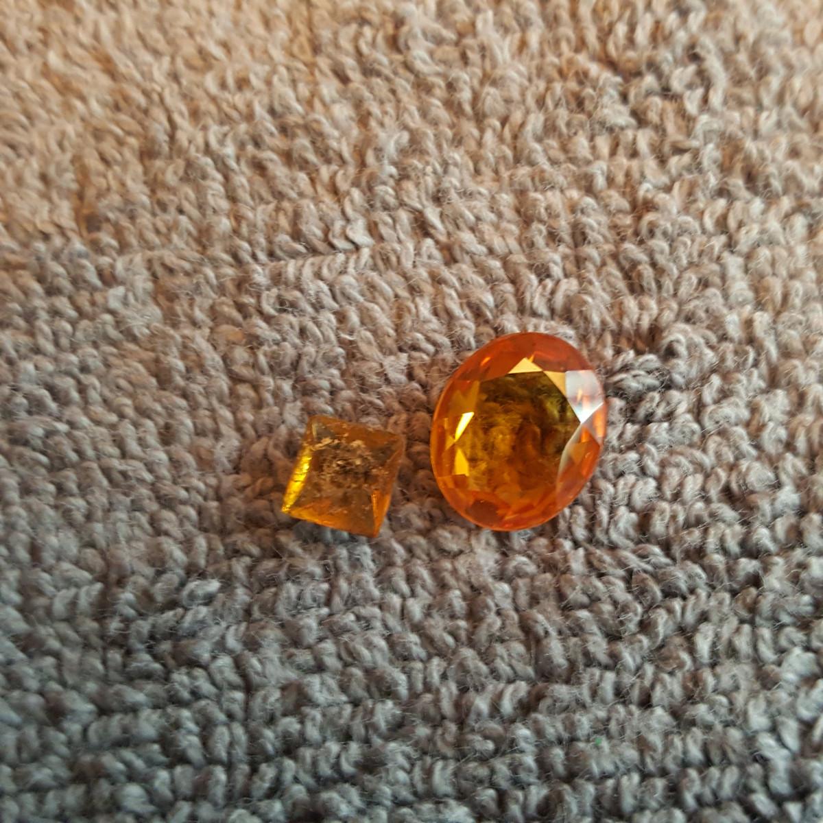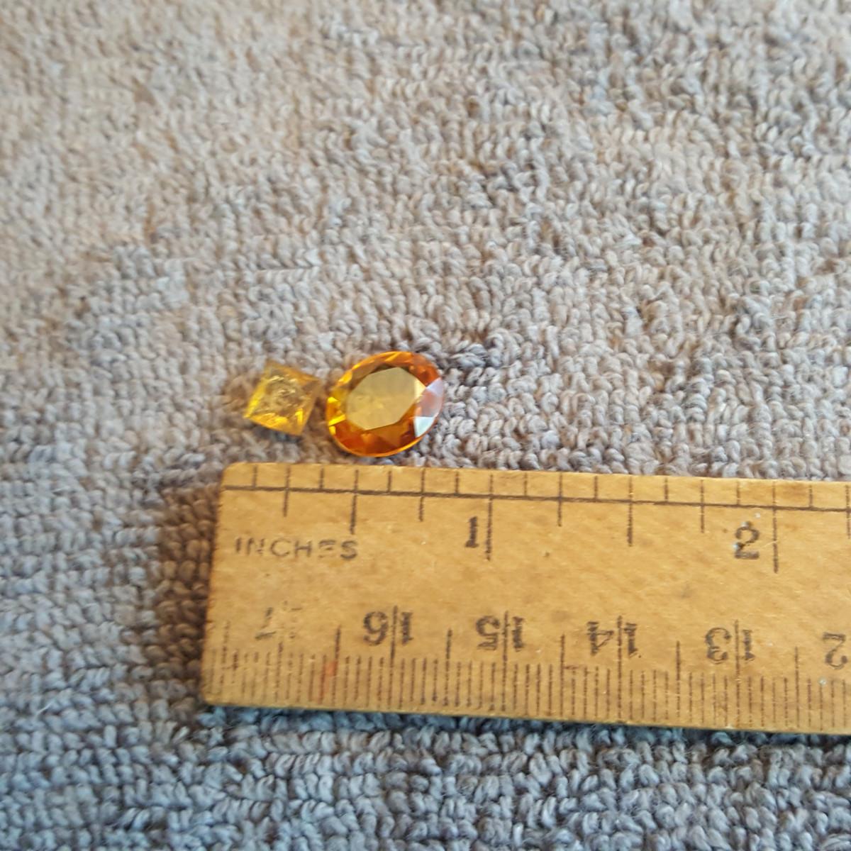 This auction lot is for a Pair of Gems. The smallest has a flat back that appears to have had a metal backing most probably dropped off a piece of jewelry at some point.. The larger - well cut and faceted - gem has a wonderful color - a soothing light orangish-pinkish hue. The larger gem - which could be colored glass or semi-precious (?) would be quite lovely mounted in a pendant.