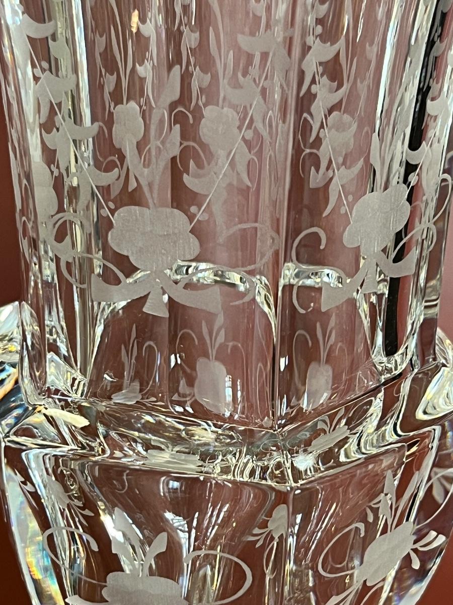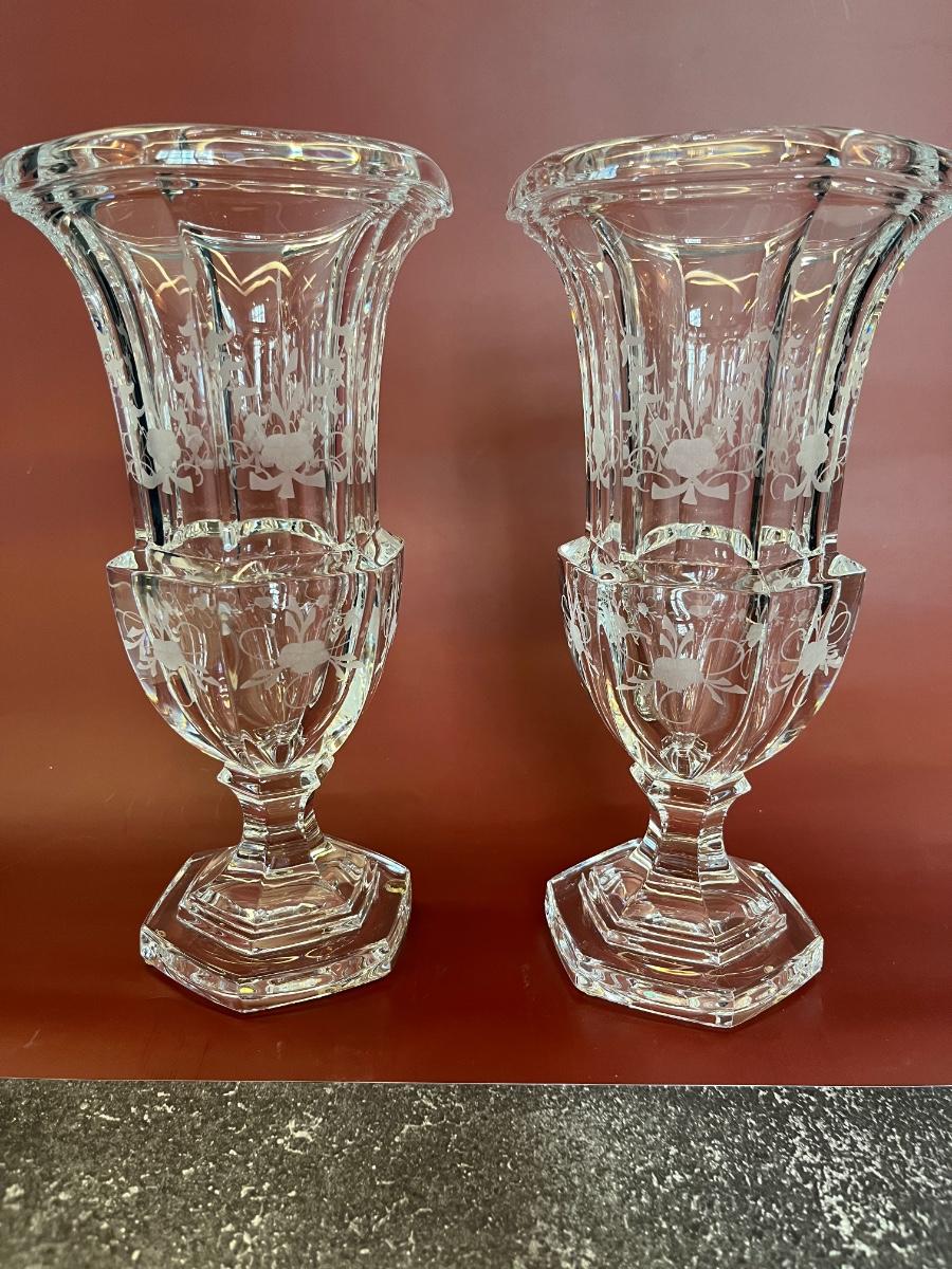 Pair of etched lead crystal vases by Tiffany and Co, “Biedermeier”, 10”h x 5.5”w