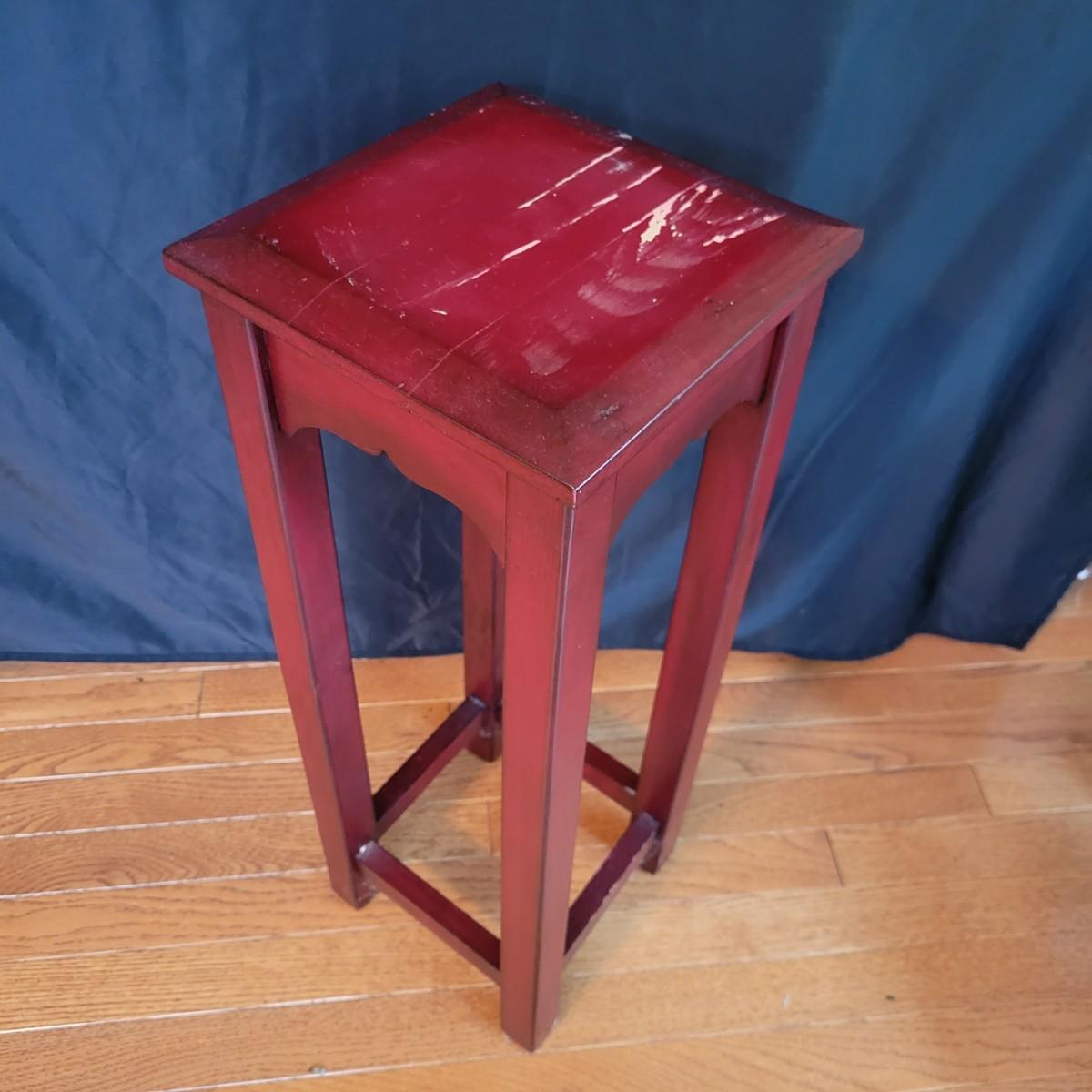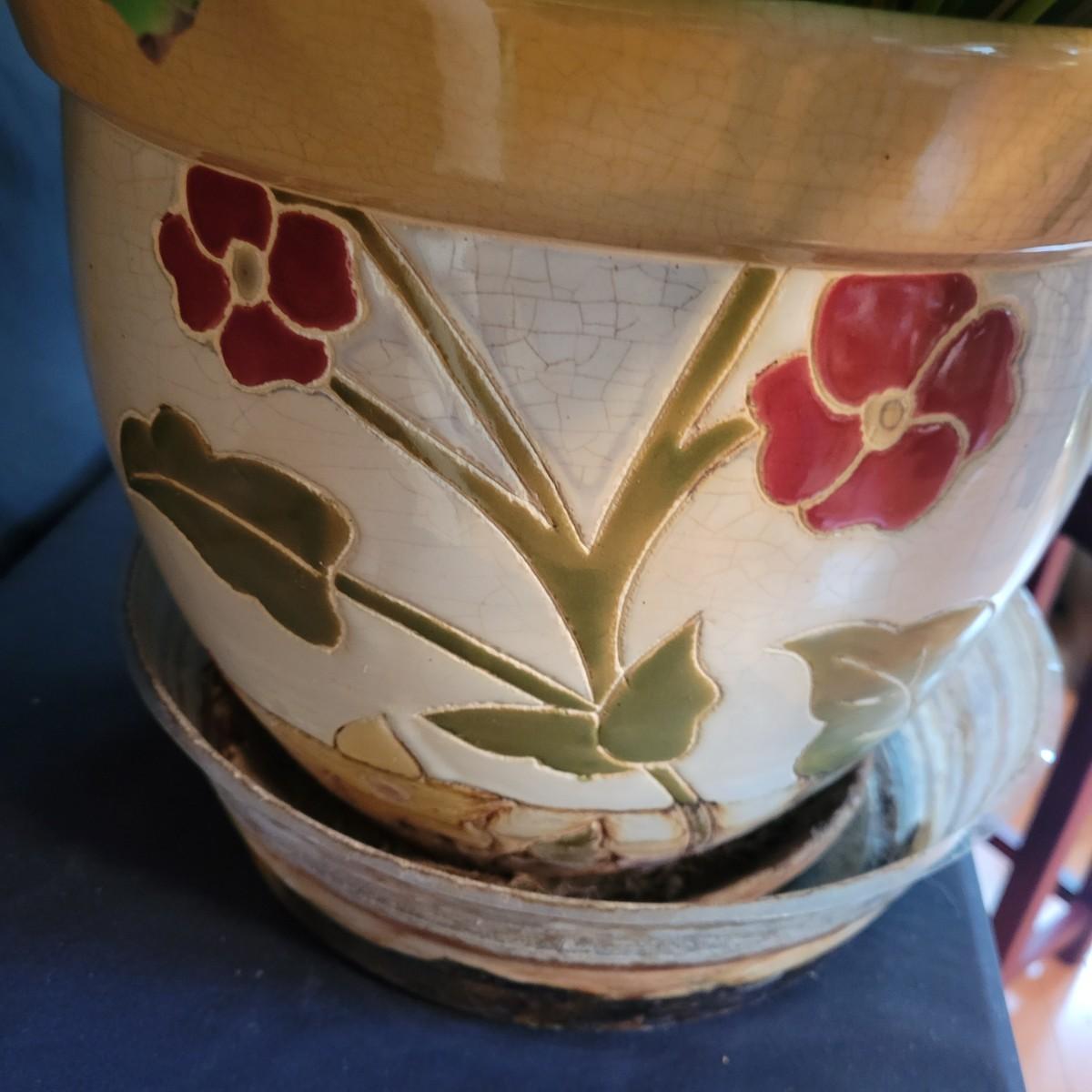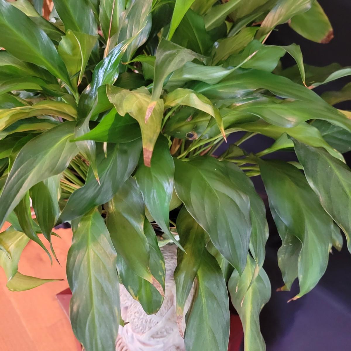 A pair of Peace Lily plants that are healthy but will be grateful when they get into their new home to receive some attention and love. The larger one measures approximately 30"D x 28"H and includes a decorative ceramic planter. The smaller plant includes a plastic molded planter with rabbit holding cabbage leafs. Also included is a small wooden plant stand that does have some damage on its surface and measures approximately 9.5" x 9.5" x 26"H. Local pickup only