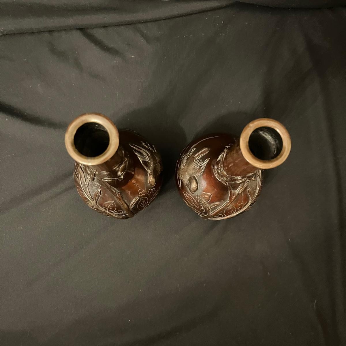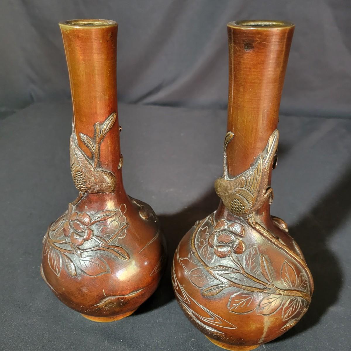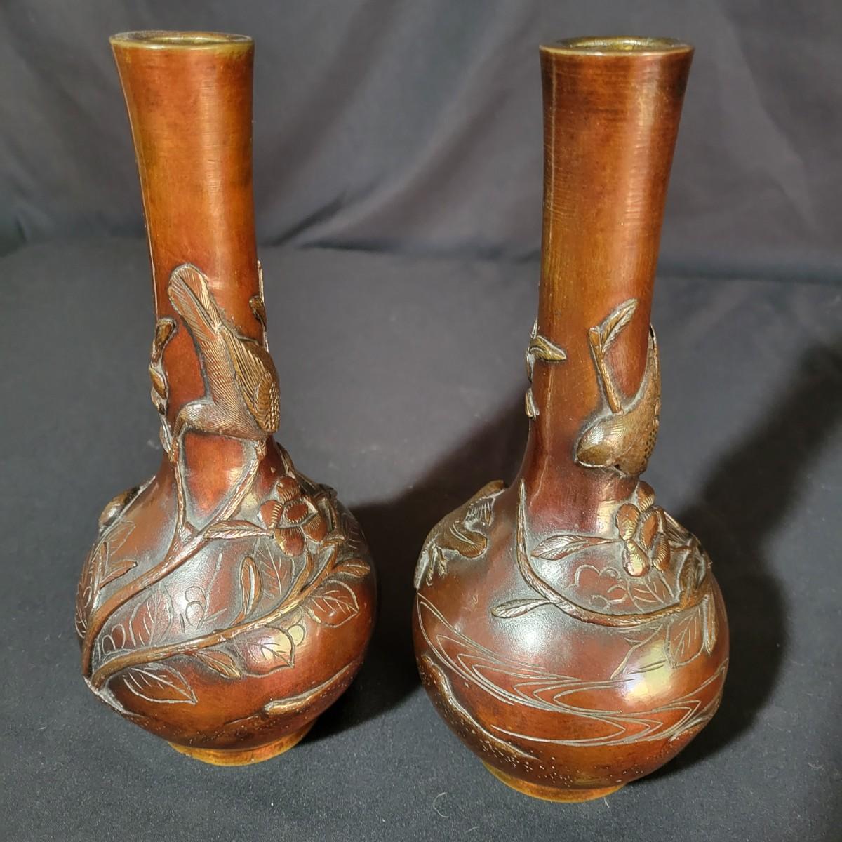 A pair of pottery vases in excellent condition. These vases feature a metallic copper colored glaze and three deminsional birds on the surface. Each piece is slightly different and measures approximately 5" x 9.5". Shipping available