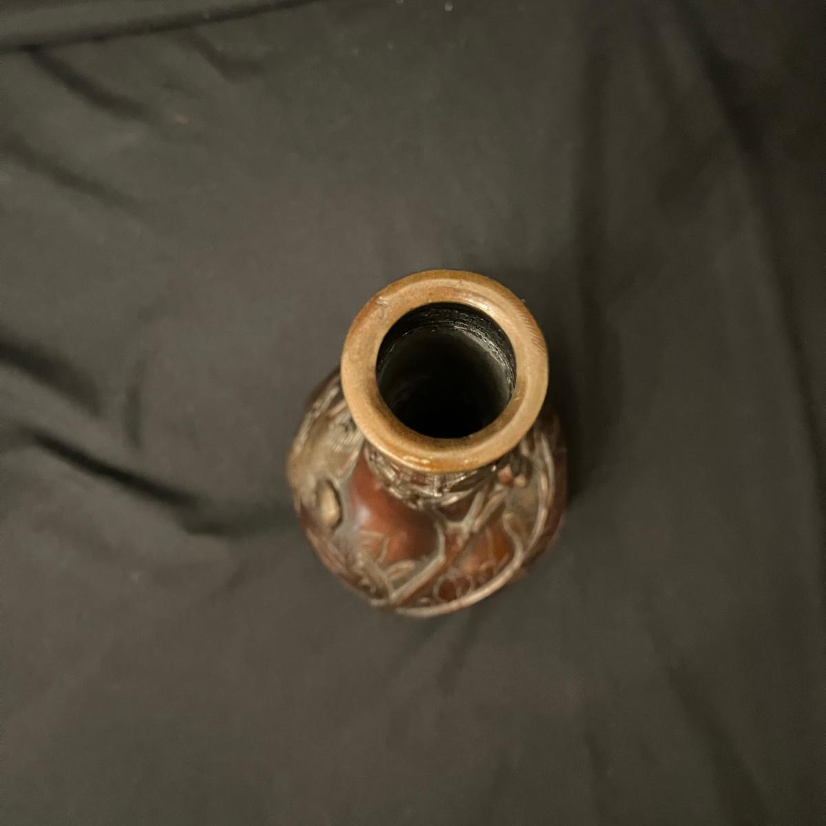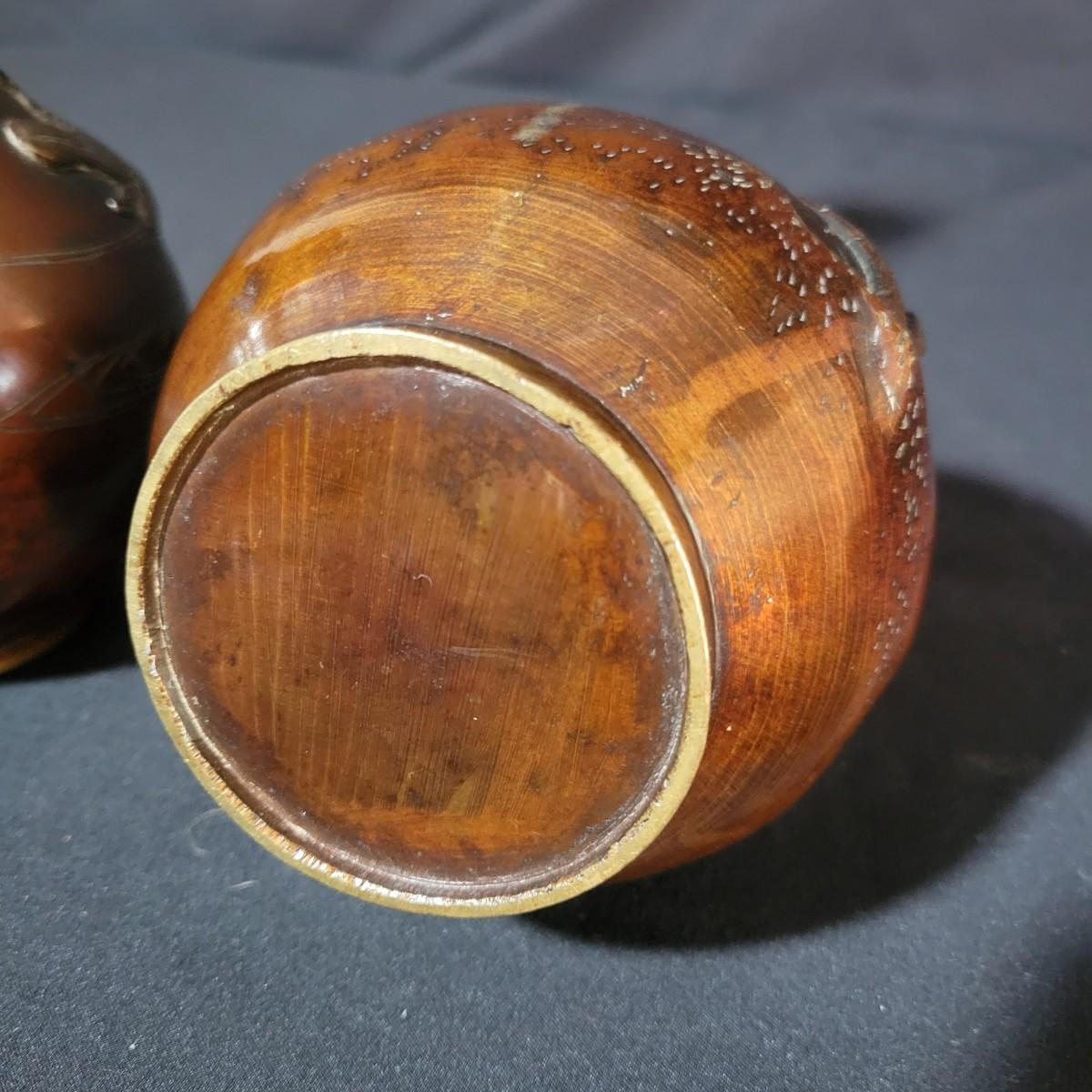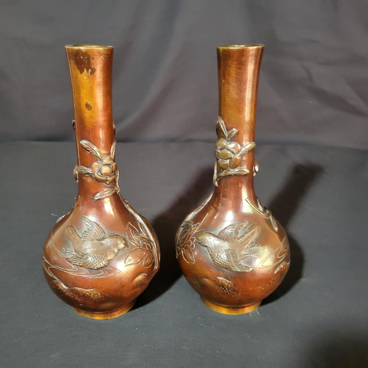 A pair of pottery vases in excellent condition. These vases feature a metallic copper colored glaze and three deminsional birds on the surface. Each piece is slightly different and measures approximately 5" x 9.5". Shipping available