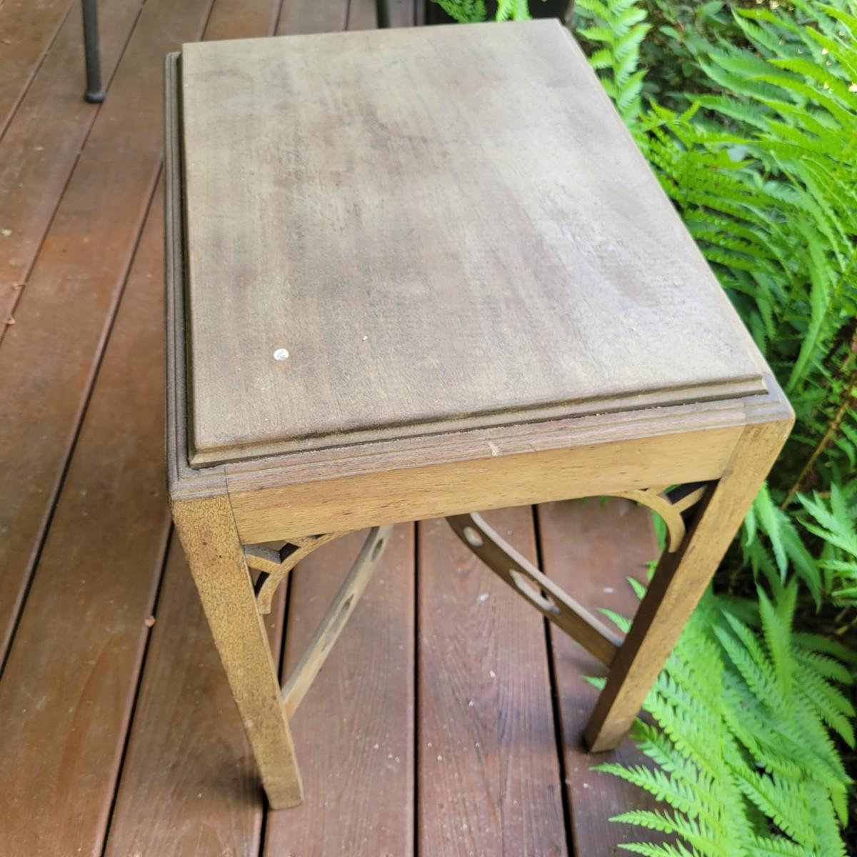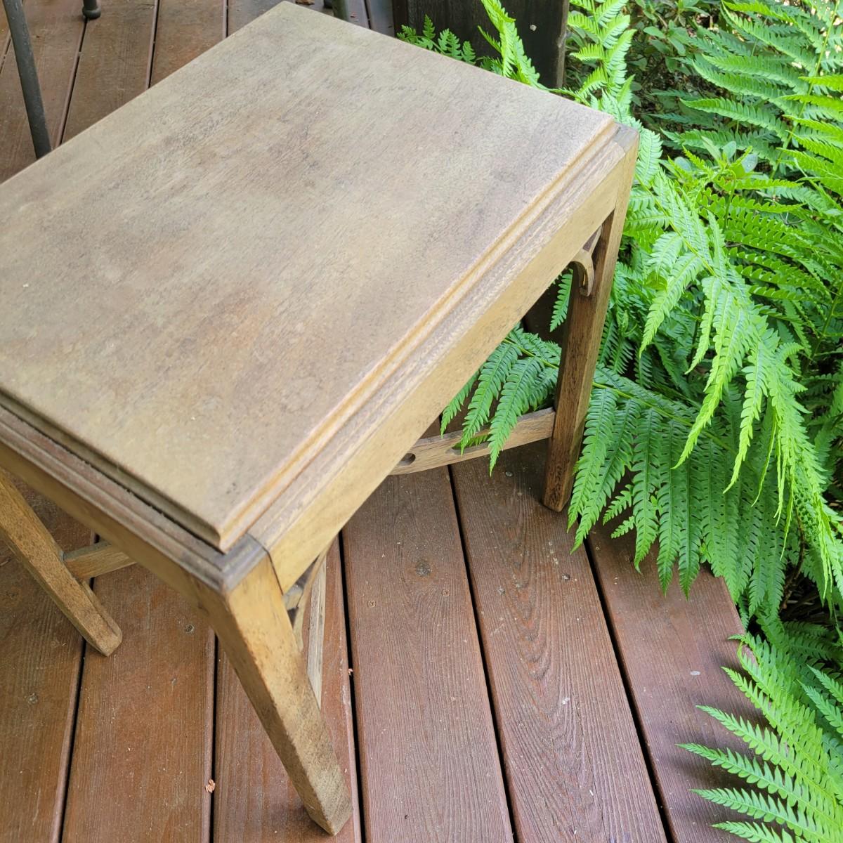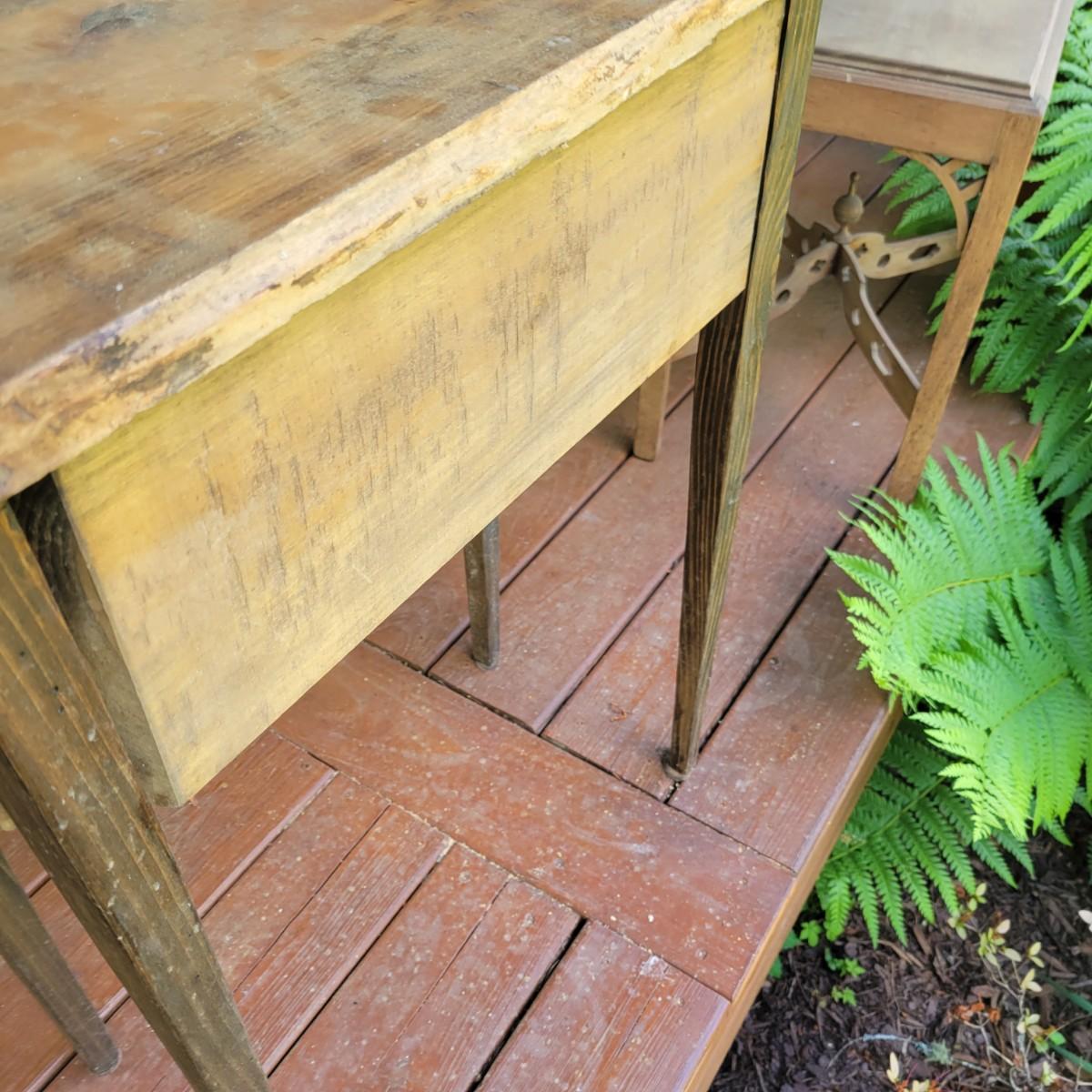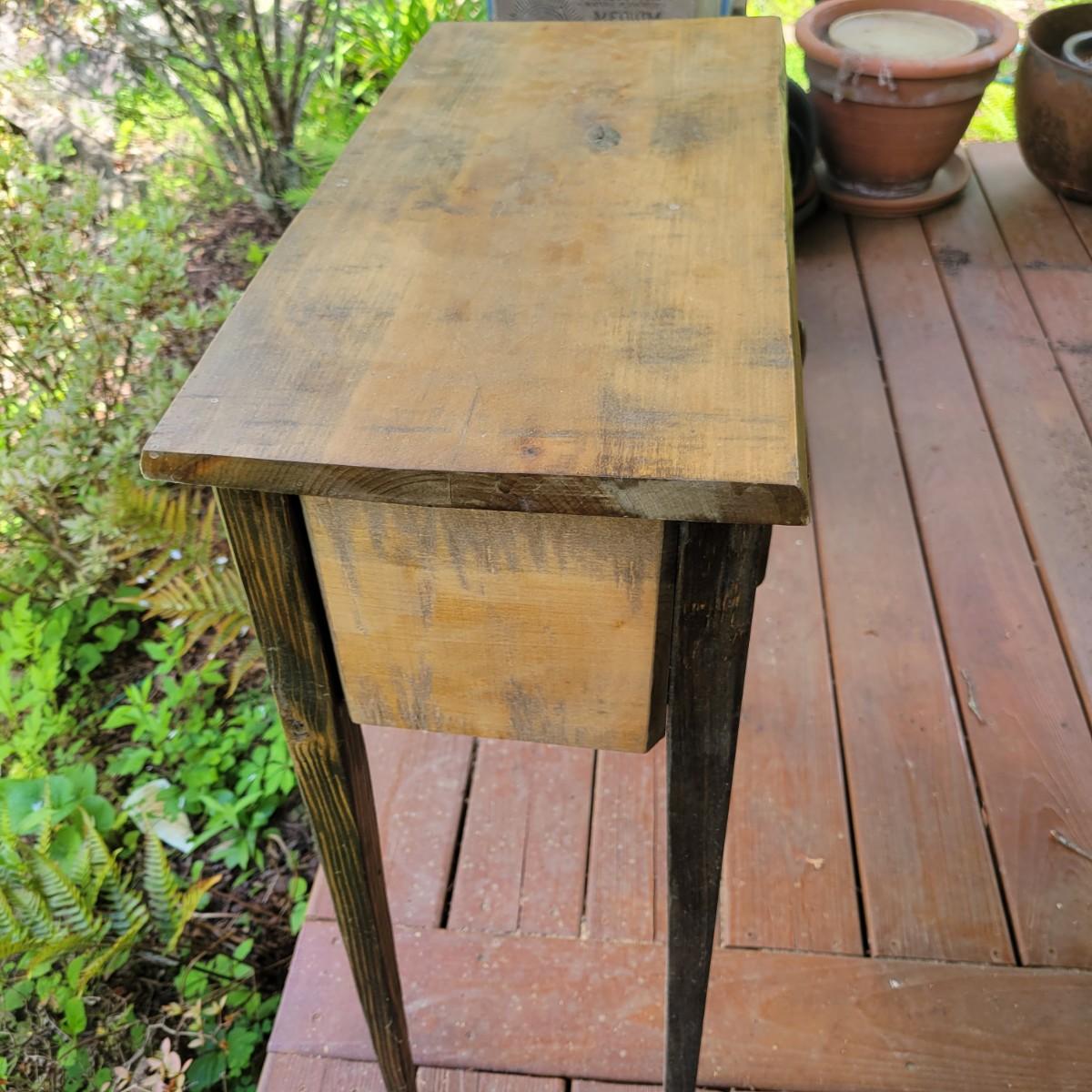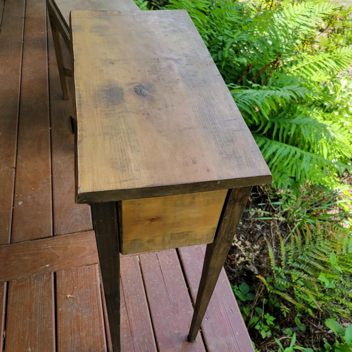 A pair of small wooden tables. The larger table is fairly rustic with a single drawer and measures approximately 22.5" x 11" x 30"H. The smaller tables appears to be unfinished oak and measures approximately 17.5" x 13.5" x 21"H. Local pickup only