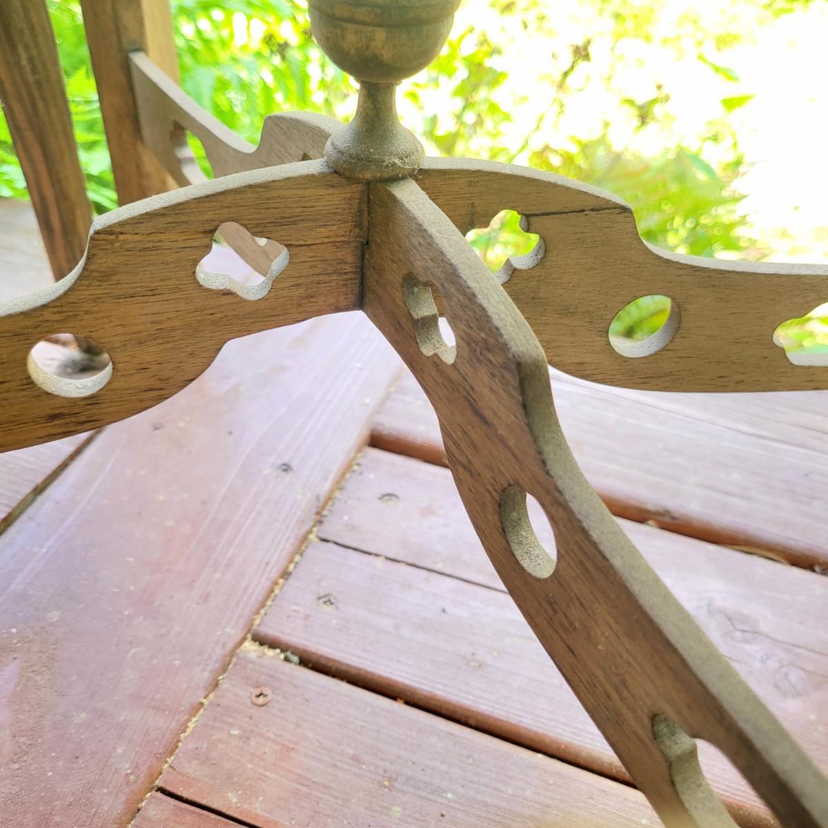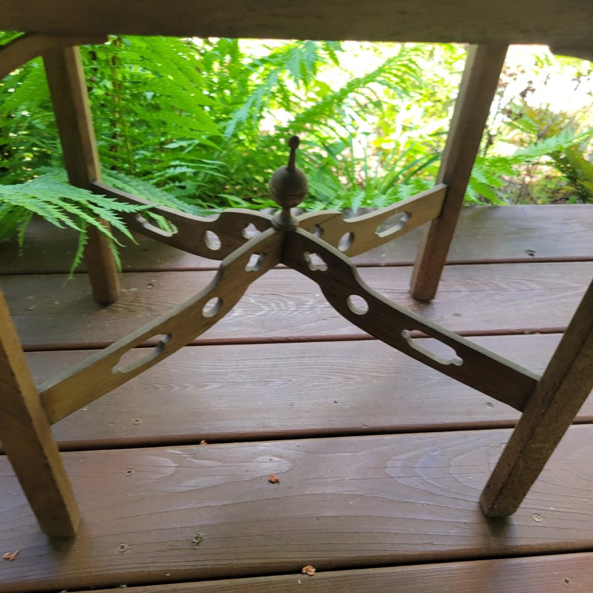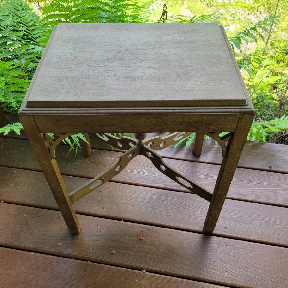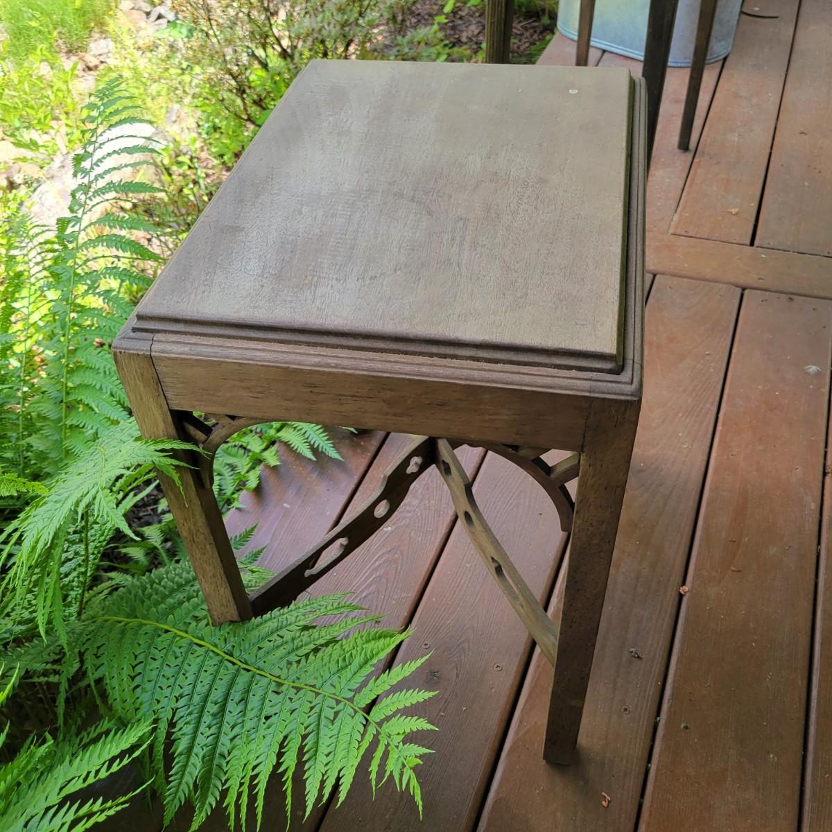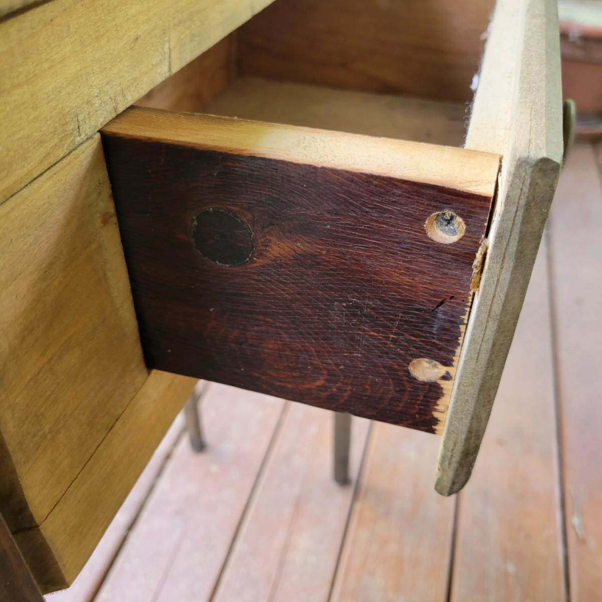 A pair of small wooden tables. The larger table is fairly rustic with a single drawer and measures approximately 22.5" x 11" x 30"H. The smaller tables appears to be unfinished oak and measures approximately 17.5" x 13.5" x 21"H. Local pickup only