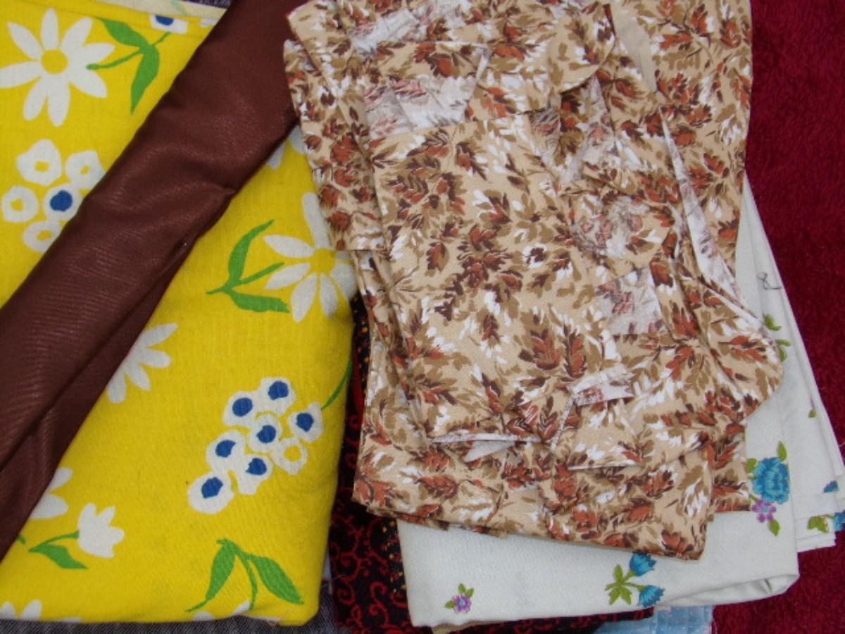 A pile of fabric in a box plus a dress pattern w/fabric & buttons,