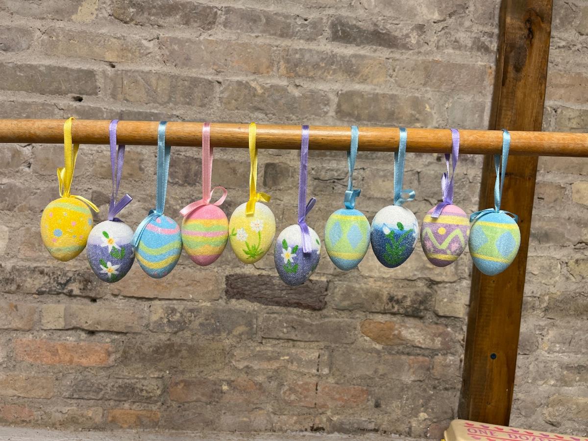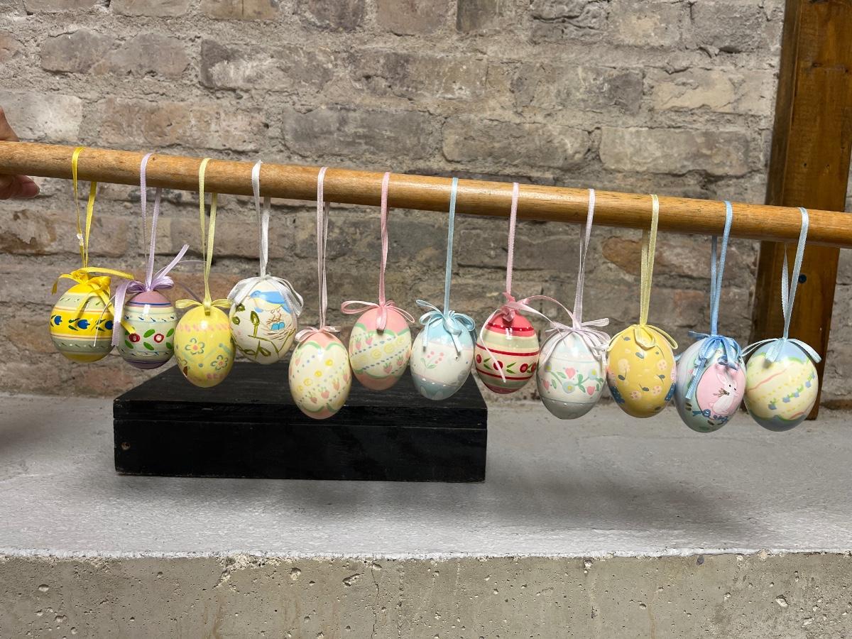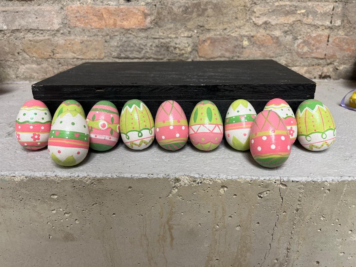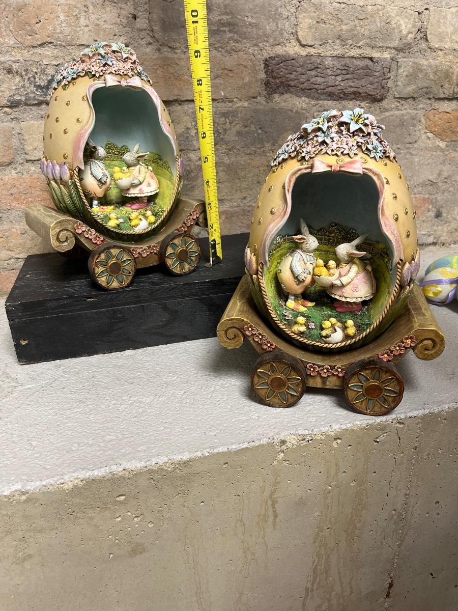 Wooden painted eggs, Easter egg carriage decor, bunnies with fabric ears and two different sets of Easter egg ornaments