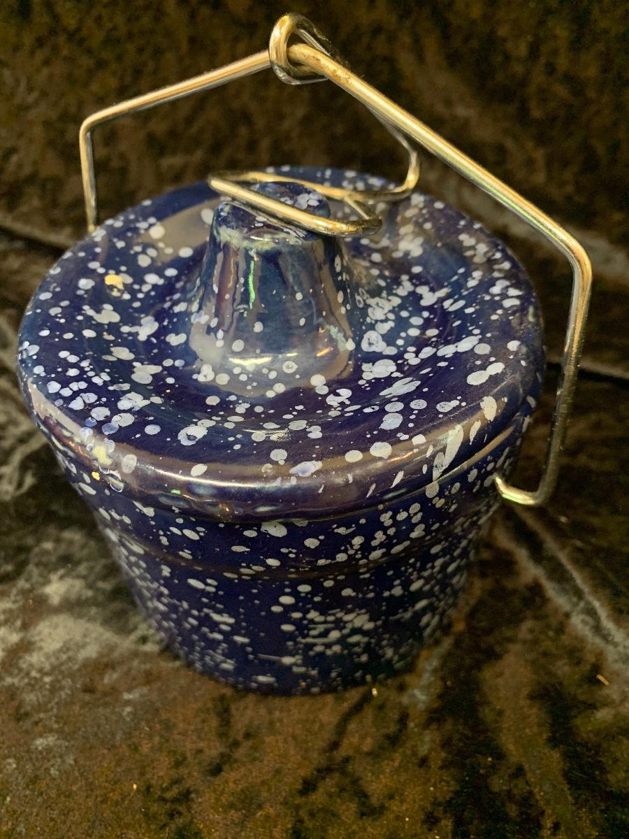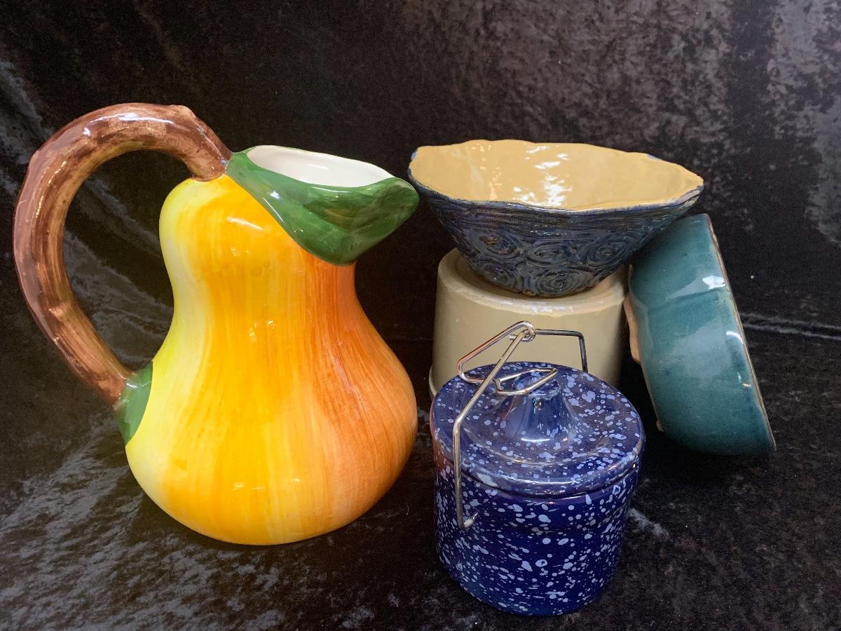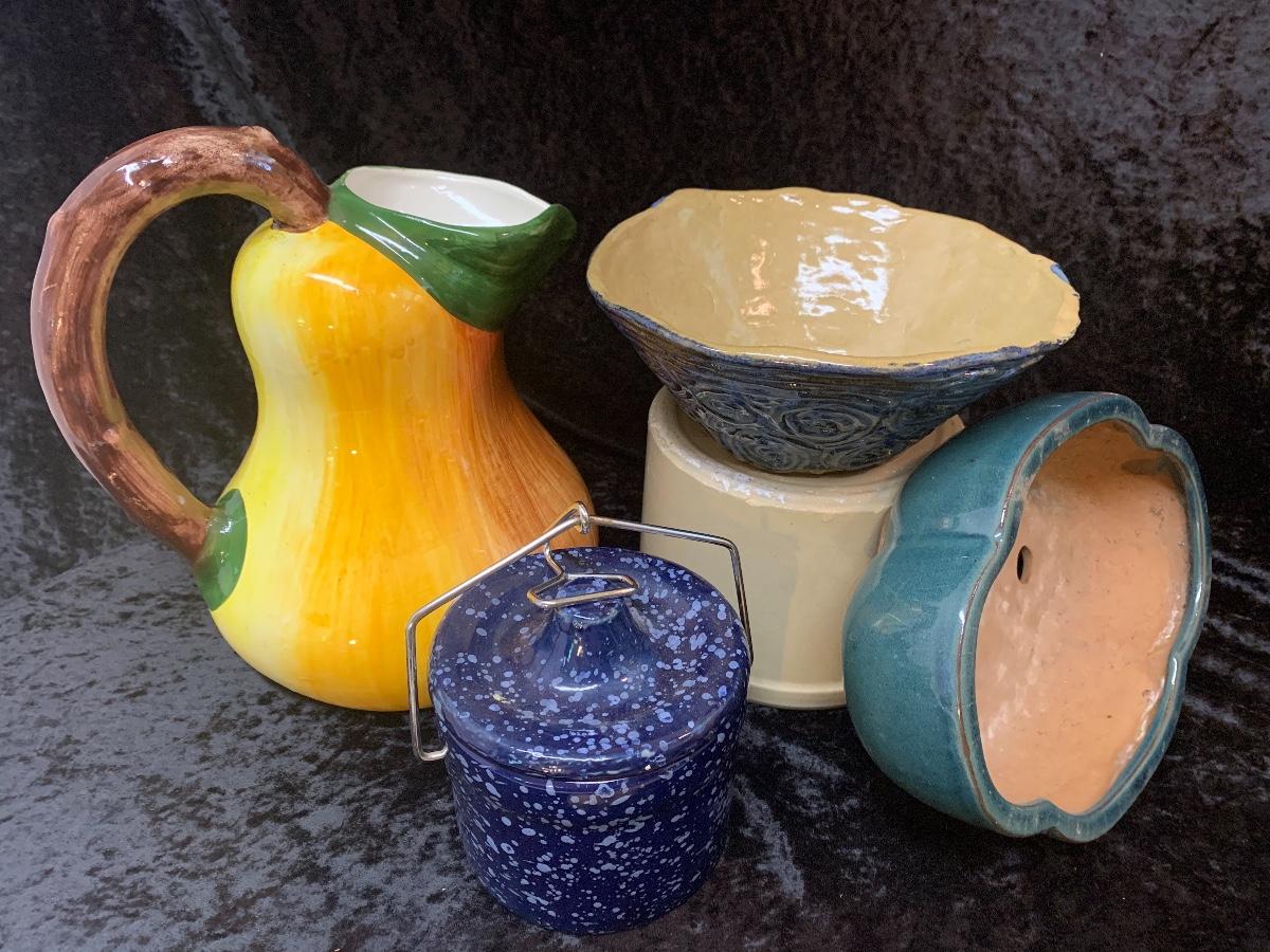 A total of 5 unique pieces: ceramic pitcher, blue lidded crock, blue bowl, teal dish and an open crock.