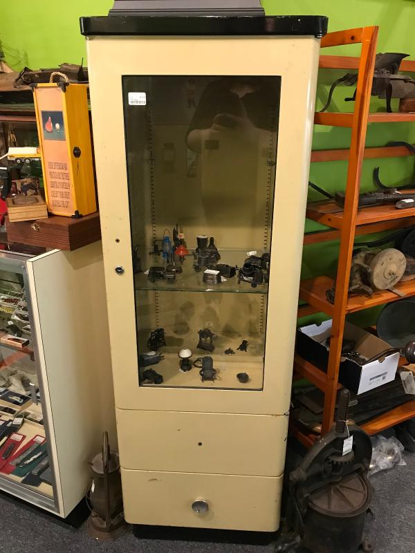 Nice all metal medical/dentil cabinet in beige and black. Locking glass upper door (no key) with adjustable glass shelf behind over two drawers. Door handle and one drawer handle missing. In very good original condition. 20" x 16 1/2" x 59 1/2" H Decorative items not included.