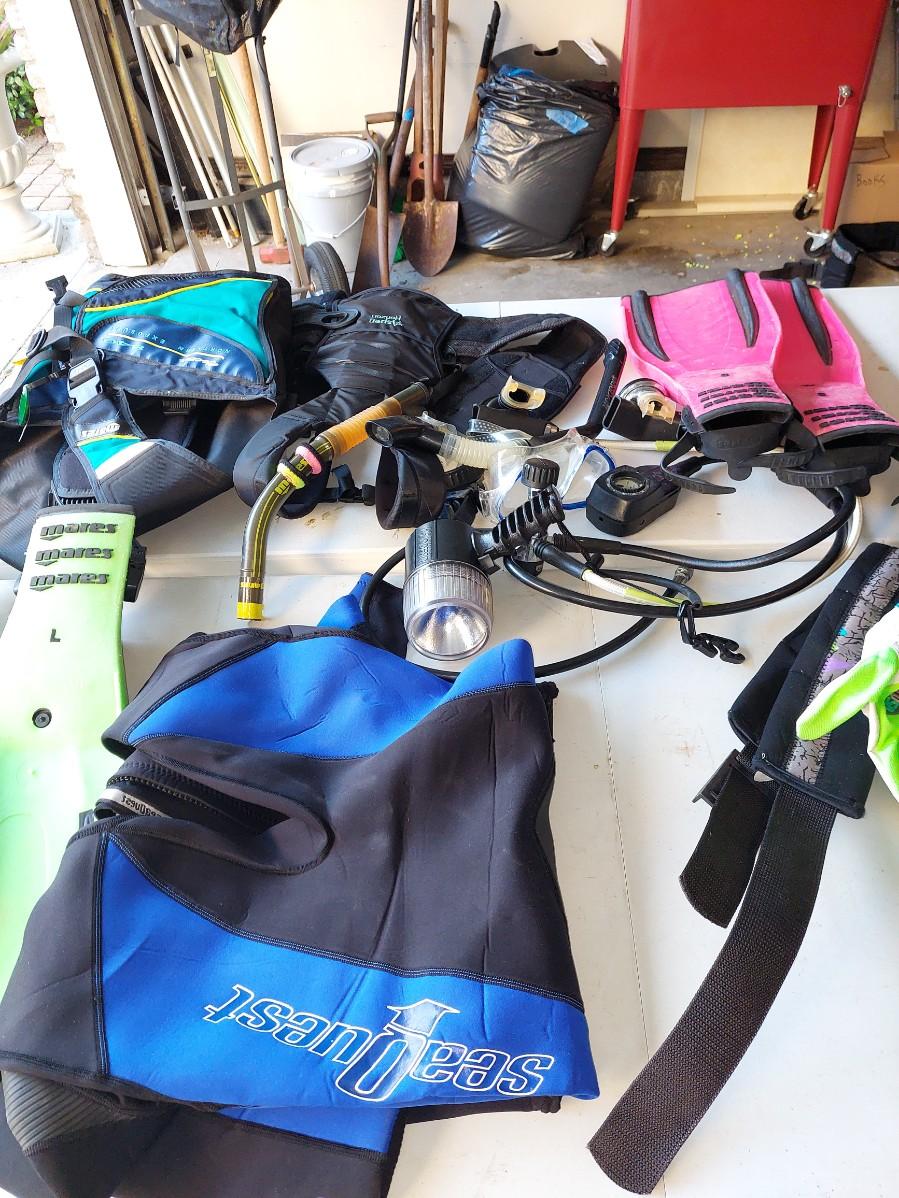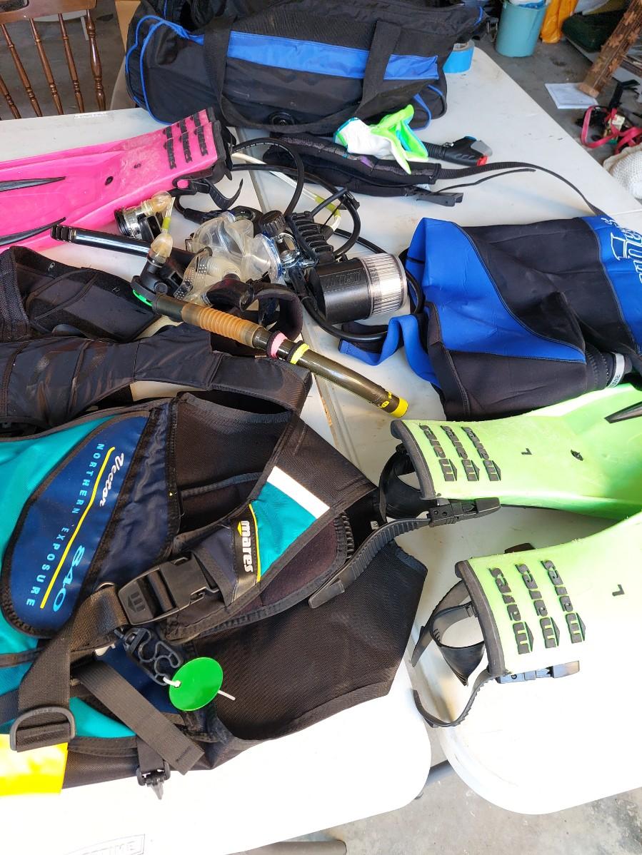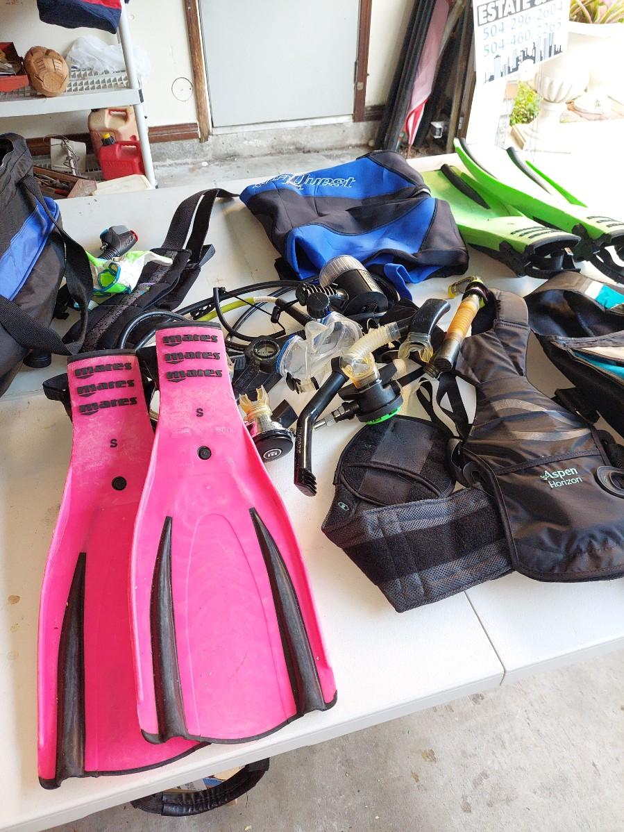 A great lot of different scuba gear items including 2 sets of fins in both large and small sizes.