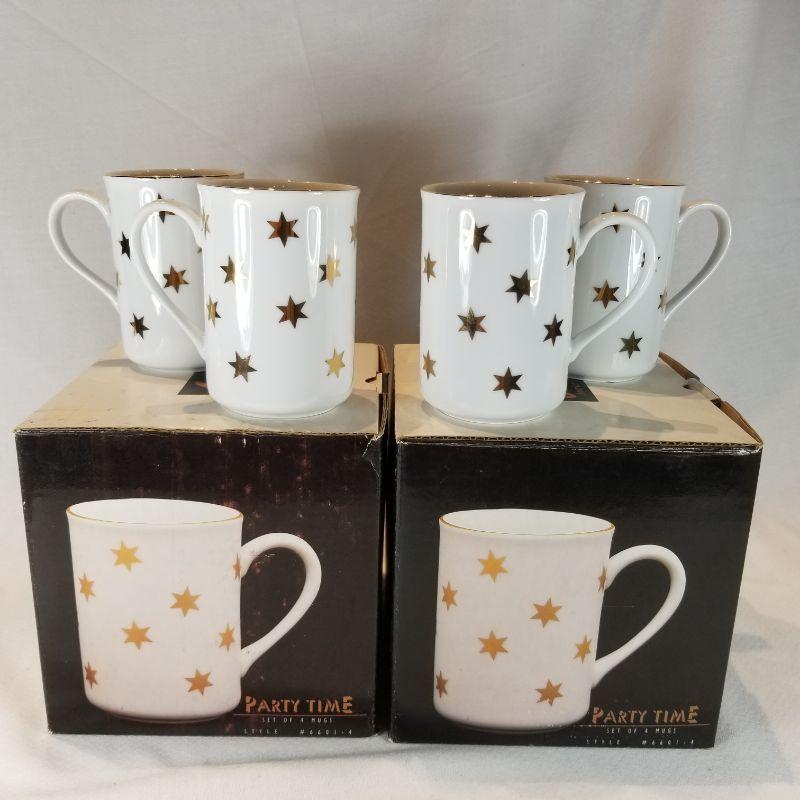 This is the second set of 8, new in a box, ceramic gold star mugs All in very good condition, no chips or cracks, still in their box of 4 each. Looks to have never been used. Remember the picture shows 4, but there are actually 8 total. Great for serving hot cider or coffee.