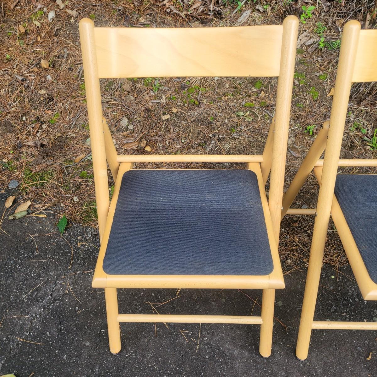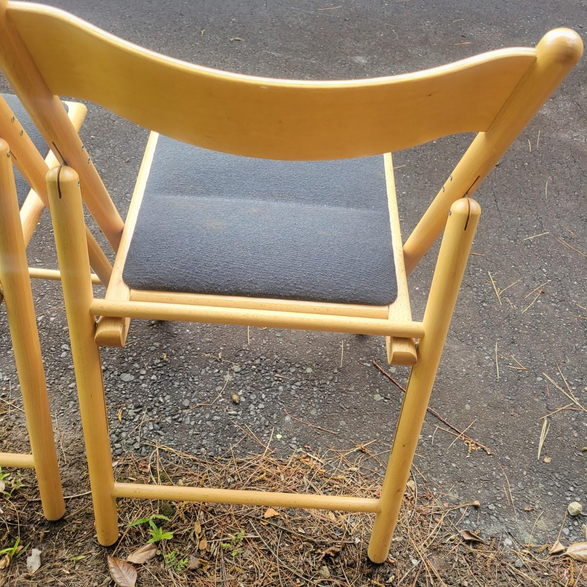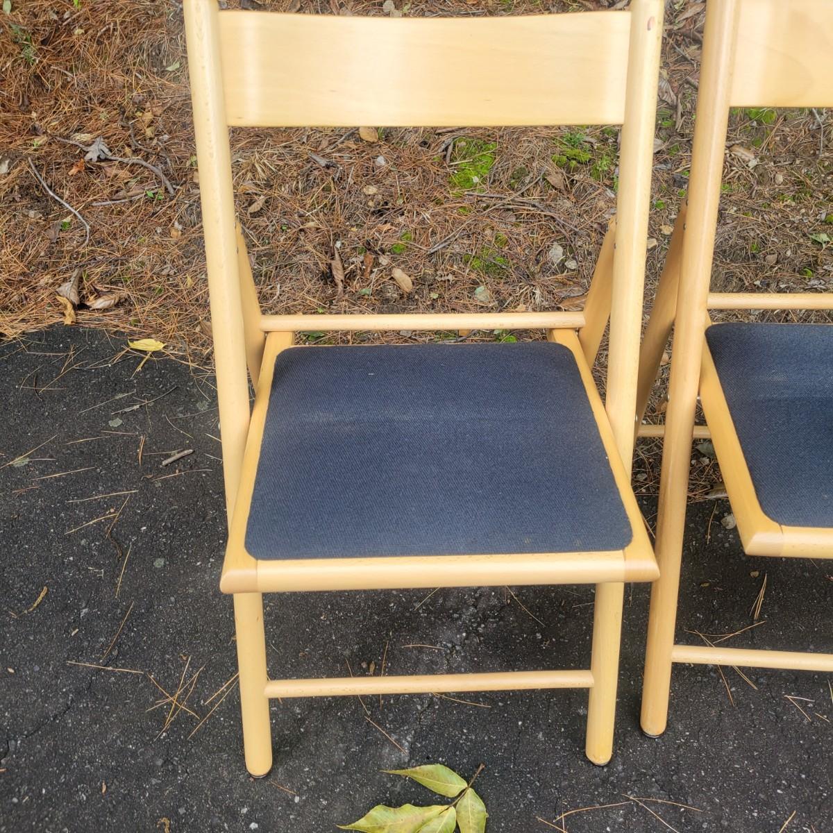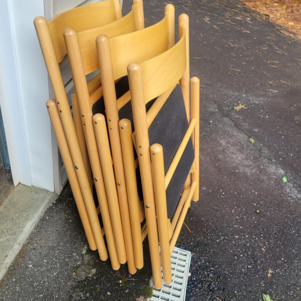 A set of four folding wooden chairs that have black fabric seat cushions. Each chair measures approximately 18" x 22" x 31.5"H with a seat height of 18". Local pickup only