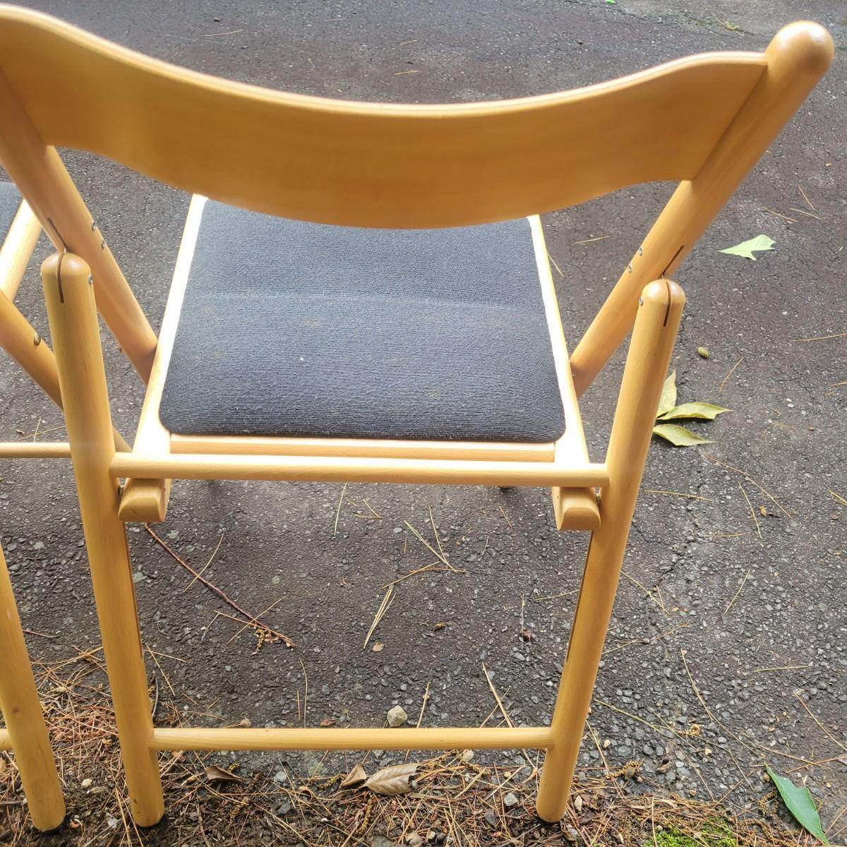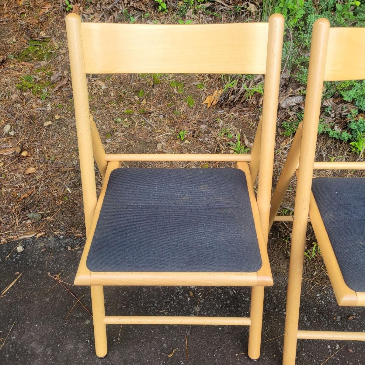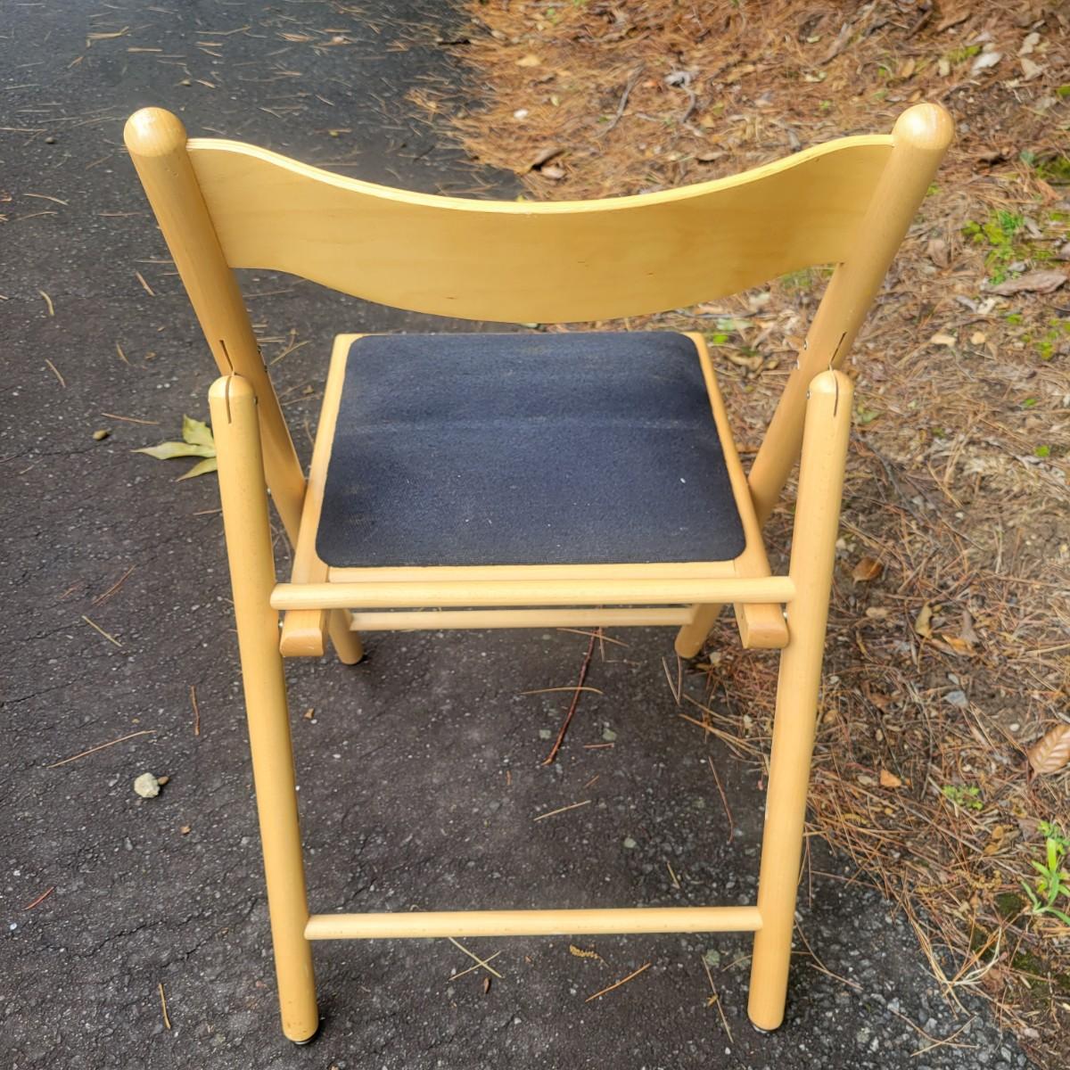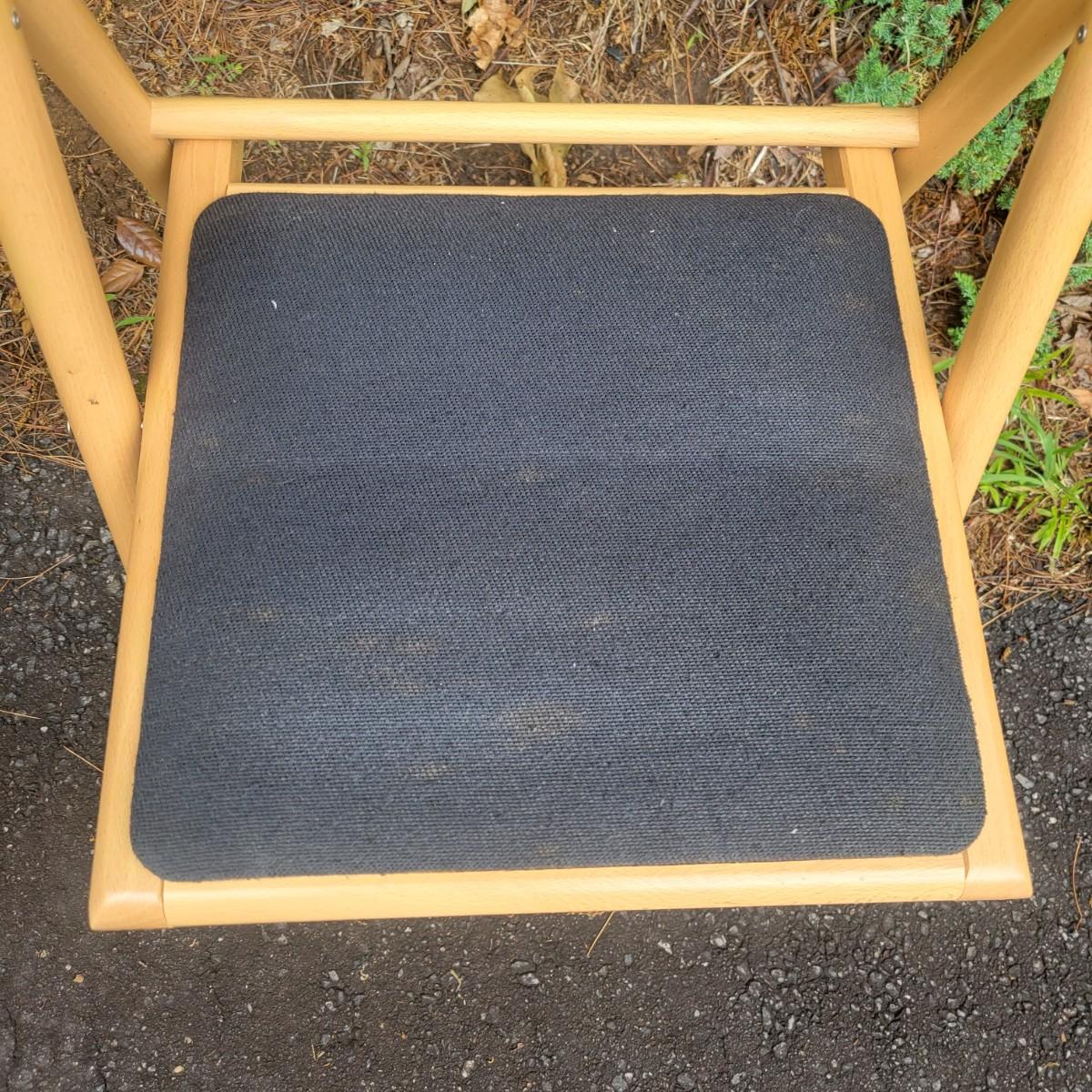 A set of four folding wooden chairs that have black fabric seat cushions. Each chair measures approximately 18" x 22" x 31.5"H with a seat height of 18". Local pickup only
